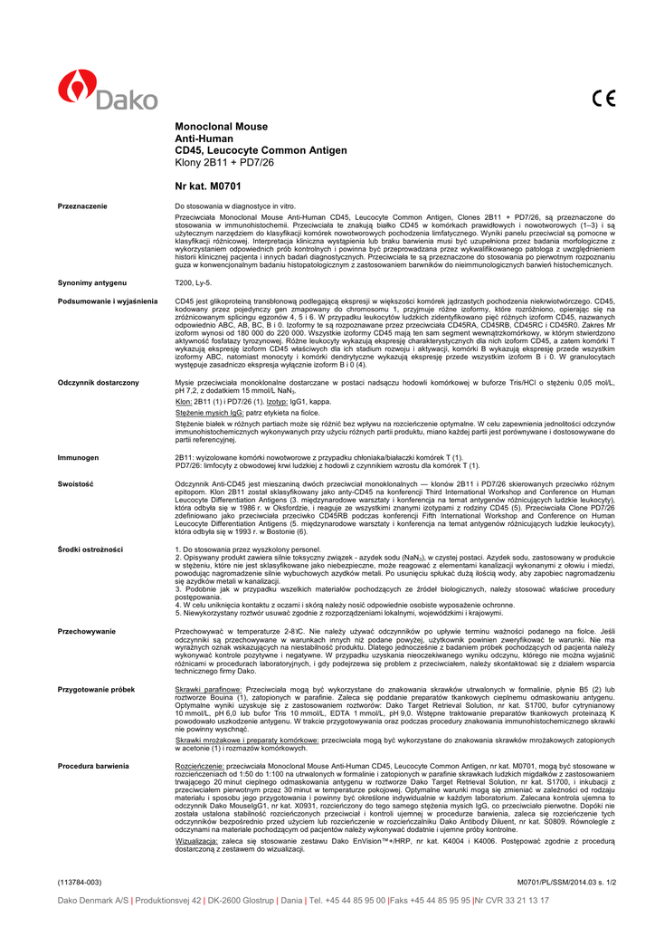 Monoclonal Mouse Anti-Human CD45, Leucocyte Common Antigen Klony 2B11 + PD7/26 Nr kat. M0701 Przeznaczenie Do stosowania w diagnostyce in vitro. Przeciwciała Monoclonal Mouse Anti-Human CD45, Leucocyte Common Antigen, Clones 2B11 + PD7/26, są przeznaczone do stosowania w immunohistochemii. Przeciwciała te znakują białko CD45 w komórkach prawidłowych i nowotworowych (1–3) i są uŜytecznym narzędziem do klasyfikacji komórek nowotworowych pochodzenia limfatycznego. Wyniki panelu przeciwciał są pomocne w klasyfikacji róŜnicowej. Interpretacja kliniczna wystąpienia lub braku barwienia musi być uzupełniona przez badania morfologiczne z wykorzystaniem odpowiednich prób kontrolnych i powinna być przeprowadzana przez wykwalifikowanego patologa z uwzględnieniem historii klinicznej pacjenta i innych badań diagnostycznych. Przeciwciała te są przeznaczone do stosowania po pierwotnym rozpoznaniu guza w konwencjonalnym badaniu histopatologicznym z zastosowaniem barwników do nieimmunologicznych barwień histochemicznych. Synonimy antygenu T200, Ly-5. Podsumowanie i wyjaśnienia CD45 jest glikoproteiną transbłonową podlegającą ekspresji w większości komórek jądrzastych pochodzenia niekrwiotwórczego. CD45, kodowany przez pojedynczy gen zmapowany do chromosomu 1, przyjmuje róŜne izoformy, które rozróŜniono, opierając się na zróŜnicowanym splicingu egzonów 4, 5 i 6. W przypadku leukocytów ludzkich zidentyfikowano pięć róŜnych izoform CD45, nazwanych odpowiednio ABC, AB, BC, B i 0. Izoformy te są rozpoznawane przez przeciwciała CD45RA, CD45RB, CD45RC i CD45R0. Zakres Mr izoform wynosi od 180 000 do 220 000. Wszystkie izoformy CD45 mają ten sam segment wewnątrzkomórkowy, w którym stwierdzono aktywność fosfatazy tyrozynowej. RóŜne leukocyty wykazują ekspresję charakterystycznych dla nich izoform CD45, a zatem komórki T wykazują ekspresję izoform CD45 właściwych dla ich stadium rozwoju i aktywacji, komórki B wykazują ekspresję przede wszystkim izoformy ABC, natomiast monocyty i komórki dendrytyczne wykazują ekspresję przede wszystkim izoform B i 0. W granulocytach występuje zasadniczo ekspresja wyłącznie izoform B i 0 (4). Odczynnik dostarczony Mysie przeciwciała monoklonalne dostarczane w postaci nadsączu hodowli komórkowej w buforze Tris/HCl o stęŜeniu 0,05 mol/L, pH 7,2, z dodatkiem 15 mmol/L NaN 3. Klon: 2B11 (1) i PD7/26 (1). Izotyp: IgG1, kappa. StęŜenie mysich IgG: patrz etykieta na fiolce. StęŜenie białek w róŜnych partiach moŜe się róŜnić bez wpływu na rozcieńczenie optymalne. W celu zapewnienia jednolitości odczynów immunohistochemicznych wykonywanych przy uŜyciu róŜnych partii produktu, miano kaŜdej partii jest porównywane i dostosowywane do partii referencyjnej. Immunogen 2B11: wyizolowane komórki nowotworowe z przypadku chłoniaka/białaczki komórek T (1). PD7/26: limfocyty z obwodowej krwi ludzkiej z hodowli z czynnikiem wzrostu dla komórek T (1). Swoistość Odczynnik Anti-CD45 jest mieszaniną dwóch przeciwciał monoklonalnych — klonów 2B11 i PD7/26 skierowanych przeciwko róŜnym epitopom. Klon 2B11 został sklasyfikowany jako anty-CD45 na konferencji Third International Workshop and Conference on Human Leucocyte Differentiation Antigens (3. międzynarodowe warsztaty i konferencja na temat antygenów róŜnicujących ludzkie leukocyty), która odbyła się w 1986 r. w Oksfordzie, i reaguje ze wszystkimi znanymi izotypami z rodziny CD45 (5). Przeciwciała Clone PD7/26 zdefiniowano jako przeciwciała przeciwko CD45RB podczas konferencji Fifth International Workshop and Conference on Human Leucocyte Differentiation Antigens (5. międzynarodowe warsztaty i konferencja na temat antygenów róŜnicujących ludzkie leukocyty), która odbyła się w 1993 r. w Bostonie (6). Środki ostroŜności 1. Do stosowania przez wyszkolony personel. 2. Opisywany produkt zawiera silnie toksyczny związek - azydek sodu (NaN3), w czystej postaci. Azydek sodu, zastosowany w produkcie w stęŜeniu, które nie jest sklasyfikowane jako niebezpieczne, moŜe reagować z elementami kanalizacji wykonanymi z ołowiu i miedzi, powodując nagromadzenie silnie wybuchowych azydków metali. Po usunięciu spłukać duŜą ilością wody, aby zapobiec nagromadzeniu się azydków metali w kanalizacji. 3. Podobnie jak w przypadku wszelkich materiałów pochodzących ze źródeł biologicznych, naleŜy stosować właściwe procedury postępowania. 4. W celu uniknięcia kontaktu z oczami i skórą naleŜy nosić odpowiednie osobiste wyposaŜenie ochronne. 5. Niewykorzystany roztwór usuwać zgodnie z rozporządzeniami lokalnymi, wojewódzkimi i krajowymi. Przechowywanie Przechowywać w temperaturze 2-8°C. Nie naleŜy uŜywać odczynników po upływie terminu waŜności podanego na fiolce. Jeśli odczynniki są przechowywane w warunkach innych niŜ podane powyŜej, uŜytkownik powinien zweryfikować te warunki. Nie ma wyraźnych oznak wskazujących na niestabilność produktu. Dlatego jednocześnie z badaniem próbek pochodzących od pacjenta naleŜy wykonywać kontrole pozytywne i negatywne. W przypadku uzyskania nieoczekiwanego wyniku odczynu, którego nie moŜna wyjaśnić róŜnicami w procedurach laboratoryjnych, i gdy podejrzewa się problem z przeciwciałem, naleŜy skontaktować się z działem wsparcia technicznego firmy Dako. Przygotowanie próbek Skrawki parafinowe: Przeciwciała mogą być wykorzystane do znakowania skrawków utrwalonych w formalinie, płynie B5 (2) lub roztworze Bouina (1), zatopionych w parafinie. Zaleca się poddanie preparatów tkankowych cieplnemu odmaskowaniu antygenu. Optymalne wyniki uzyskuje się z zastosowaniem roztworów: Dako Target Retrieval Solution, nr kat. S1700, bufor cytrynianowy 10 mmol/L, pH 6,0 lub bufor Tris 10 mmol/L, EDTA 1 mmol/L, pH 9,0. Wstępne traktowanie preparatów tkankowych proteinazą K powodowało uszkodzenie antygenu. W trakcie przygotowywania oraz podczas procedur