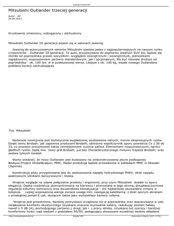 autosalon pomorski Mitsubishi Outlander trzeciej generacji Autor: AP 29.06.2012. Gruntownie zmieniony, wzbogacony i odchudzony Mitsubishi Outlander III generacji pojawi się w salonach jesienią Jesienią do autoryzowanych salonów Mitsubishi wjedzie jeden z najpopularniejszych na naszym rynku crossoverów - Outlander III generacji. To auto, przypisywane do segmentu średnich SUV-ów, będzie się różniło od poprzednika prawie wszystkim: wyglądem zewnętrznym i wewnętrznym, jednostkami napędowymi, wyposażeniem zarówno standardowym, jak i opcjonalnym, Ma być niewiele droższe od poprzednika - ok. 100 tys. zł w podstawowej wersji. Lżejsze o ok. 100 kg, wszak nowego Outlandera poddano kuracji odchudzającej. Fot. Mitsubishi Nadwozie nowicjusza jest stylistycznie wygładzone, pozbawione ostrych, mocno ekspresyjnych rysów. Dzięki temu – jak zapewnia producent – obniżono współczynnik oporu powietrza Cx z 36 do 33, co powiano procentować także zmniejszeniem zużycia paliwa. Elementami rozpoznawczymi, oprócz gładkich rysów, będą min. nowy grill – już bez charakterystycznego motywu trapeza – oraz zestaw tylnych świateł. Warto wiedzieć, że nowy Outlander jest budowany na zrekonstruowanej płycie podłogowej „Project Global” MMC. Nadal produkcja będzie prowadzona w zakładach MMC w Okazaki (Japonia) Konstrukcja płyty przygotowana jest do zastosowania napędu hybrydowego PHEV, obok napędu spalinowymi silnikami benzynowymi i Diesla. Wnętrze wygląda na udane połączenie prostoty i ergonomii, przy czym Mitsubishi dodało tu sporo elegancji. Deska rozdzielcza skoncentrowana na kierowcy i skierowana w jego stronę, dwupłaszczyznowa regulacja kolumny kierownicy oraz dwustrefowa klimatyzacja - oto najbardziej zauważalne zmiany w kokpicie. Lepiej wyposażona wersja zwraca uwagę min. nawigacją satelitarną z dość sporym ekranem o przekątnej ponad 6 cali, służącym także jako wyświetlacz kamery cofania. Wnętrze jest przestronne, bardziej pomysłowo urządzone niż w poprzedniku oraz dopracowane w celu zwiększenia komfortu akustycznego Uzyskano znaczne wyciszenie kabiny, redukując poziom hałasu nawet o 5 dB (A), pochodzącego zarówno z drogi, jak i z pracy silnika. Uzyskano też szerszy i bardziej komfortowy trzeci rząd siedzeń z podziałem 50/50, zastępujący stosowane wcześniej osobne składane http://autosalonpomorski.pl Kreator PDF Utworzono 8 March, 2017, 17:50 autosalon pomorski siedzeń. Po złożeniu drugiego i trzeciego rzędu uzyskuje się płaską powierzchnię o długości 1,69 m - o 33 cm więcej niż w poprzedniku. W 5-miejscowej konfiguracji wnętrza bagażnik ma pojemność niemal 600 litrów, czyli o 50 litrów więcej (dane porównawcze w tabeli). No i dobra wiadomość dla wygodnickich – w wyposażeniu za dopłatą jest elektrycznie unoszona pokrywa bagażnika. Z nowości, które trafią pod maskę, trzeba wymienić innowacyjny silnik 4N14 2.2 l Diesla o mocy 150 KM. Jest wprawdzie słabszy o 27 KM od poprzednika, nie ma systemu zmiennych faz rozrządu, ale zachowuje ten sam maksymalny moment obrotowy 380 Nm, uzyskiwany w szerszym zakresie obrotów (1.750 – 2,500). Ponadto charakteryzuje się niższą emisją spalin oraz zoptymalizowanym turbodoładowaniem celem poprawy charakterystyki pracy na niskich obrotach. System Automatic Stop & Go dostępny jest tylko z przekładnią manualną. W nowym silniku benzynowym zastosowano system bezstopniowej zmiany faz rozrządu, co pozwoliło na redukcję masy i wymiarów motoru. Ta dwulitrowa jednostka generuje teraz 150 KM (o 3 KM więcej) i 195 Nm (o 4 Nm mniej). Usprawniony układ hamulcowy (tarcze wentylowane i pełne) i układy wspomagania, to min. hydrauliczne wspomaganie awaryjnego hamowania (poprzednio mechaniczne), dostosowanie do systemu adaptacyjnego tempomatu i systemu łagodzenia skutków kolizji czołowych. Zoptymalizowane zawieszenie (kolumny MacPhersona z przodu, wielodrążkowe zawieszenie z tyłu), to nin. redukcja masy nieresorowanej celem poprawy prowadzenia i komfortu jazdy. Z przodu zastosowano ramę pomocniczą celem zwiększenia sztywności, poprawy prowadzenia, stabilności jazdy oraz bezpieczeństwa biernego. Z tyłu zaś wprowadzono bierną zmianę zbieżności kół. Ponadto zastosowano elektryczne wspomaganie układu kierowniczego. Nowe opony i obręcze z lekkich stopów zapewnią zmniejszenie oporów toczenia o 10 proc., obniżenie masy (0,9 kg na koło przy obręczach 16-calowych-, 0,6 kg na koło przy obręczach 18-calowych). Dostępne będą wersje z napędem 2WD i 4WD. Układ napędu na cztery koła może działać w trybach pracy: ECO, AUTO i LOCK. Systemy bezpieczeństwa stanowią min. 7 airbagów (w tym jeden kolanowy kierowcy), ASR i ESP, a ponadto tempomat adaptacyjny, system sygnalizujący niezamierzone zjechanie z toru jazdy oraz radarowy system zapobiegania kolizjom drogowym przy małych prędkościach do 30 km/h. Porównanie Mitsubishi Outlandera drugiej i trzeciej generacj Dane techniczne / model Outlander II 2.2 DiD M/T 2WD 5-miejscowy Outlander III 2.2 DiD M/T 2WD 5-miejscowy (AS&G) Długość 4.665 mm 4.655 mm Masa własna 1.650 kg 1.495 kg Cx 0,36 0,33 Maks. długość przestrzeni bagażowej 1.350 mm 1.690 mm Moc maksymalna 177 KM (130 kW) przy 3500 obr./min 150 KM (110 kW) przy 3.500 obr./min Maksymalny moment obrotowy 380 Nm przy 2.000 obr./min 380 Nm przy 1750 – 2.500 obr./min 0 – 100 km/h 9,8 s 9,8 s Średnia emisja spalin 165 g/km Poniżej 130 g/km http://autosalonpomorski.pl Kreator PDF Utworzono 8 March, 2017, 17:50