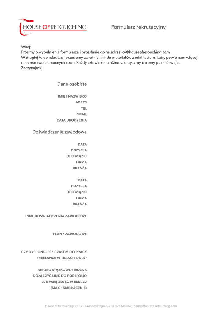 Formularz rekrutacyjny Witaj! Prosimy o wypełnienie formularza i przesłanie go na adres: [email protected] W drugiej turze rekrutacji prześlemy zwrotnie link do materiałów z mini testem, który powie nam więcej na temat twoich mocnych stron. Każdy człowiek ma różne talenty a my chcemy poznać twoje. Zaczynajmy! Dane osobiste IMIĘ I NAZWISKO ADRES TEL EMAIL DATA URODZENIA Doświadczenie zawodowe DATA POZYCJA OBOWIĄZKI FIRMA BRANŻA DATA POZYCJA OBOWIĄZKI FIRMA BRANŻA INNE DOŚWIADCZENIA ZAWODOWE PLANY ZAWODOWE CZY DYSPONUJESZ CZASEM DO PRACY FREELANCE W TRAKCIE DNIA? NIEOBOWIĄZKOWO: MOŻNA DOŁĄCZYĆ LINK DO PORTFOLIO LUB PARĘ ZDJĘĆ W EMAILU (MAX 15MB ŁĄCZNIE) House of Retouching s.c. I ul. Grabowskiego 8/6 31-524 Kraków I [email protected] Formularz rekrutacyjny Wykształcenie DATA STOPNIEŃ NAUKOWY KIERUNEK/ KIERUNKI UCZELNIA Umiejętności JĘZYKI / STOPIEŃ ICH OPANOWANIA DWA SŁOWA O TWOJEJ OSOBOWOŚCI HOBBY / ZAINTERESOWANIA MAC CZY PC? CZY PRACUJESZ NA TABLECIE WACOM? PHOTOSHOP: NA JAKIEJ WERSJI PRACUJESZ OD ILU LAT STOPIEŃ OPANOWANIA CAPTURE ONE: NA JAKIEJ WERSJI PRACUJESZ OD ILU LAT STOPIEŃ OPANOWANIA INNE PROGRAMY GRAFICZNE, 3D, FILMOWE CHCESZ COŚ DODAĆ? Wyrażam zgodę na przetwarzanie moich danych osobowych dla potrzeb niezbędnych do realizacji procesu rekrutacji (zgodnie z Ustawą z dnia 29.08.1997 roku o Ochronie Danych Osobowych; (tekst jednolity: Dz. U. 2016 r. poz. 922). Data Miasto Podpis House of Retouching s.c. I ul. Grabowskiego 8/6 31-524 Kraków I [email protected]