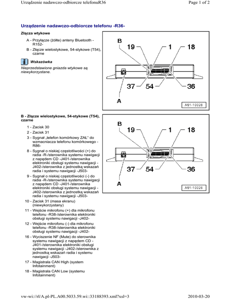 Urządzenie nadawczo-odbiorcze telefonuR36 Page 1 of 2 Urządzenie nadawczo-odbiorcze telefonu -R36Złącza wtykowe A - Przyłącze (żółte) anteny Bluetooth R152B - Złącze wielostykowe, 54-stykowe (T54), czarne Wskazówka Nieprzedstawione gniazda wtykowe są niewykorzystane. B - Złącze wielostykowe, 54-stykowe (T54), czarne 1 - Zacisk 30 2 - Zacisk 31 3 - Sygnał „telefon komórkowy ZAŁ“ do wzmacniacza telefonu komórkowego R868 - Sygnał o niskiej częstotliwości (+) do radia -R-/sterownika systemu nawigacji z napędem CD -J401-/sterownika elektroniki obsługi systemu nawigacji J402-/sterownika z jednostką wskazań radia i systemu nawigacji -J5039 - Sygnał o niskiej częstotliwości (-) do radia -R-/sterownika systemu nawigacji z napędem CD -J401-/sterownika elektroniki obsługi systemu nawigacji J402-/sterownika z jednostką wskazań radia i systemu nawigacji -J50310 - Zacisk 31 (masa ekranu) (niewykorzystany) 11 - Wejście mikrofonu (+) dla mikrofonu telefonu -R38-/sterownika elektroniki obsługi systemu nawigacji -J40212 - Wejście mikrofonu (-) dla mikrofonu telefonu -R38-/sterownika elektroniki obsługi systemu nawigacji -J40216 - Wyciszenie NF (Mute) do sterownika systemu nawigacji z napędem CD J401-/sterownika elektroniki obsługi systemu nawigacji -J402-/sterownika z jednostką wskazań radia i systemu nawigacji -J50317 - Magistrala CAN High (system Infotainment) 18 - Magistrala CAN Low (systemu Infotainment) vw-wi://rl/A.pl-PL.A00.5033.59.wi::33188393.xml?xsl=3 2010-03-20 Urządzenie nadawczo-odbiorcze telefonuR36 Page 2 of 2 37 - Zacisk 30 do uchwytu telefonu -R12639 - Zacisk 31 do uchwytu telefonu -R12641 - Zacisk 30 do uchwytu telefonu -R12642 - Mikrofon- wyjście (+) do uchwytu na telefon -R12643 - Mikrofon- wyjście (-) do uchwytu na telefon -R12644 - Zacisk 31 (masa ekranu) 45 - Wejście sygnału o niskiej częstotliwości (+) z uchwytu telefonu -R12646 - Wejście sygnału o niskiej częstotliwości (-) z uchwytu telefonu -R12647 - Sygnał SNDREQ zuchwytu telefonu R12649 - Ser-Tx (+) douchwytu telefonu -R12650 - Ser-Tx (-) douchwytu telefonu -R12651 - Ser-Rx (+) oduchwytu telefonu -R12652 - Ser-Rx (-) oduchwytu telefonu -R126- vw-wi://rl/A.pl-PL.A00.5033.59.wi::33188393.xml?xsl=3 2010-03-20