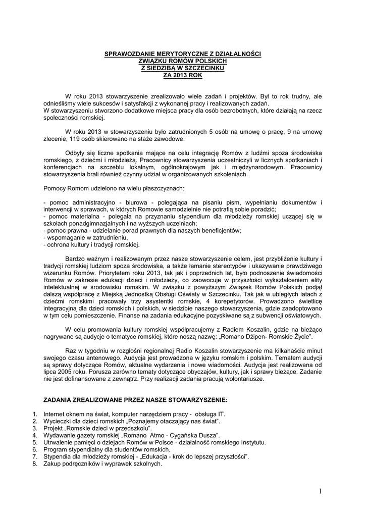 SPRAWOZDANIE MERYTORYCZNE Z DZIAŁALNOŚCI ZWIĄZKU ROMÓW POLSKICH Z SIEDZIBĄ W SZCZECINKU ZA 2013 ROK W roku 2013 stowarzyszenie zrealizowało wiele zadań i projektów. Był to rok trudny, ale odnieśliśmy wiele sukcesów i satysfakcji z wykonanej pracy i realizowanych zadań. W stowarzyszeniu stworzono dodatkowe miejsca pracy dla osób bezrobotnych, które działają na rzecz społeczności romskiej. W roku 2013 w stowarzyszeniu było zatrudnionych 5 osób na umowę o pracę, 9 na umowę zlecenie, 119 osób skierowano na staże zawodowe. Odbyły się liczne spotkania mające na celu integrację Romów z ludźmi spoza środowiska romskiego, z dziećmi i młodzieżą. Pracownicy stowarzyszenia uczestniczyli w licznych spotkaniach i konferencjach na szczeblu lokalnym, ogólnokrajowym jak i międzynarodowym. Pracownicy stowarzyszenia brali również czynny udział w organizowanych szkoleniach. Pomocy Romom udzielono na wielu płaszczyznach: - pomoc administracyjno - biurowa - polegająca na pisaniu pism, wypełnianiu dokumentów i interwencji w sprawach, w których Romowie samodzielnie nie potrafią sobie poradzić; - pomoc materialna - polegała na przyznaniu stypendium dla młodzieży romskiej uczącej się w szkołach ponadgimnazjalnych i na wyższych uczelniach; - pomoc prawna - udzielanie porad prawnych dla naszych beneficjentów; - wspomaganie w zatrudnieniu, - ochrona kultury i tradycji romskiej. Bardzo ważnym i realizowanym przez nasze stowarzyszenie celem, jest przybliżenie kultury i tradycji romskiej ludziom spoza środowiska, a także łamanie stereotypów i ukazywanie prawdziwego wizerunku Romów. Priorytetem roku 2013, tak jak i poprzednich lat, było podnoszenie świadomości Romów w zakresie edukacji dzieci i młodzieży, co zaowocuje w przyszłości wykształceniem elity intelektualnej w środowisku romskim. W związku z powyższym Związek Romów Polskich podjął dalszą współpracę z Miejską Jednostką Obsługi Oświaty w Szczecinku. Tak jak w ubiegłych latach z dziećmi romskimi pracowały trzy asystentki romskie, 4 korepetytorów. Prowadzono świetlicę integracyjną dla dzieci romskich i polskich, w siedzibie naszego stowarzyszenia, gdzie zaadoptowano w tym celu pomieszczenie. Finanse na zadania edukacyjne pozyskiwane są z subwencji oświatowych. W celu promowania kultury romskiej współpracujemy z Radiem Koszalin, gdzie na bieżąco nagrywane są audycje o tematyce romskiej, które noszą nazwę: „Romano Dżipen- Romskie Życie”. Raz w tygodniu w rozgłośni regionalnej Radio Koszalin stowarzyszenie ma kilkanaście minut swojego czasu antenowego. Audycja jest prowadzona w języku romskim i polskim. Tematem audycji są sprawy dotyczące Romów, aktualne wydarzenia i nowe wiadomości. Audycja jest realizowana od lipca 2005 roku. Porusza zarówno tematy dotyczące obyczajów, kultury, jak i sprawy bieżące. Zadanie nie jest dofinansowane z zewnątrz. Przy realizacji zadania pracują wolontariusze. ZADANIA ZREALIZOWANE PRZEZ NASZE STOWARZYSZENIE: 1. 2. 3. 4. 5. 6. 7. 8. Internet oknem na świat, komputer narzędziem pracy - obsługa IT. Wycieczki dla dzieci romskich „Poznajemy otaczający nas świat”. Projekt „Romskie dzieci w przedszkolu”. Wydawanie gazety romskiej „Romano Atmo - Cygańska Dusza”. Utrwalenie pamięci o dziejach Romów w Polsce - działalność romskiego Instytutu. Program stypendialny dla studentów romskich. Stypendia dla młodzieży romskiej - „Edukacja - krok do lepszej przyszłości”. Zakup podręczników i wyprawek szkolnych. 1 9. Publikacja książki edukacyjnej dla dzieci romskich w wieku przedszkolnym pt. „Akademia przedszkolaka czyli łamigłówki romskiej główki”. 10. Adaptacja strychu na działalność kulturalno-edukacyjną 11. Projekt realizowany w ramach POKL „Rynek pracy otwarty dla Romów”. 12. Projekt realizowany w ramach POKL „Staże zawodowe dla Romów”. 13. Projekt realizowany w ramach POKL „Cooltura równych szans” Zleceniodawca: Ministerstwo Administracji i Cyfryzacji Realizacja zadań PROGRAMU NA RZECZ SPOŁECZNOŚCI ROMSKIEJ W POLSCE W 2013 ROKU. 1. „Internet oknem na świat, komputer narzędziem pracy - obsługa IT”. Zadanie polegało na sprawnym działaniu systemu informatycznego w siedzibie stowarzyszenia, tj. sieci biurowej i zestawów komputerowych, stałej pomocy informatycznej w zakresie użytkowania zestawów komputerowych przez pracowników stowarzyszenia, oraz optymalne działanie strony internetowej. Za pośrednictwem naszej strony internetowej priorytetem było dotarcie do osób na całym świecie. W dzisiejszych czasach strona internetowa jest najszybszym i najskuteczniejszym nośnikiem informacji i komunikacji. Posiadanie strony internetowej jest niezbędnym i tanim narzędziem do efektywnej pracy jak i współpracy. Szerzenie wiedzy o społeczności romskiej poprzez tworzenie systemów informacyjnych w Internecie traktujemy jako zadanie wieloletnie. 2. Wycieczki dla dzieci romskich. Projekt był realizowany od 01.05.2013 do 31.12.2013. Grupa docelowa to 31 dzieci romskich i polskich z otoczenia romskiego ze Szczecinka, które uczęszczają do szkół podstawowych, gimnazjów oraz szkół ponadgimnazjalnych. Wszystkie sprawy związane z projektem były przygotowywane w siedzibie Związku Romów Polskich w Szczecinku, natomiast sam projekt był realizowany w poszczególnych miastach. Wybraliśmy najciekawsze miejsca. Zorganizowano wycieczkę do Rogowa, Gdyni, Gdańska i Sopotu. W Rogowie dzieci zwiedziły Park Dinozaurów oraz integrowały się podczas zabawy na dmuchanej zjeżdżalni. Gdynia była kolejnym miejscem, gdzie dzieci podziwiały Akwarium Gdyńskie, a zamiast okrętu „Błyskawica” dzieci wybrały Gdyńskie Muzeum Motoryzacji. Na kolejną wycieczkę pojechaliśmy do Gdańska, gdzie dzieci oraz opiekunowie mogli zwiedzić Centrum Edukacji Archeologicznej „Błękitny Lew” oraz po drodze Grodzisko w Sopocie. Niestety zabrakło nam czasu na zwiedz