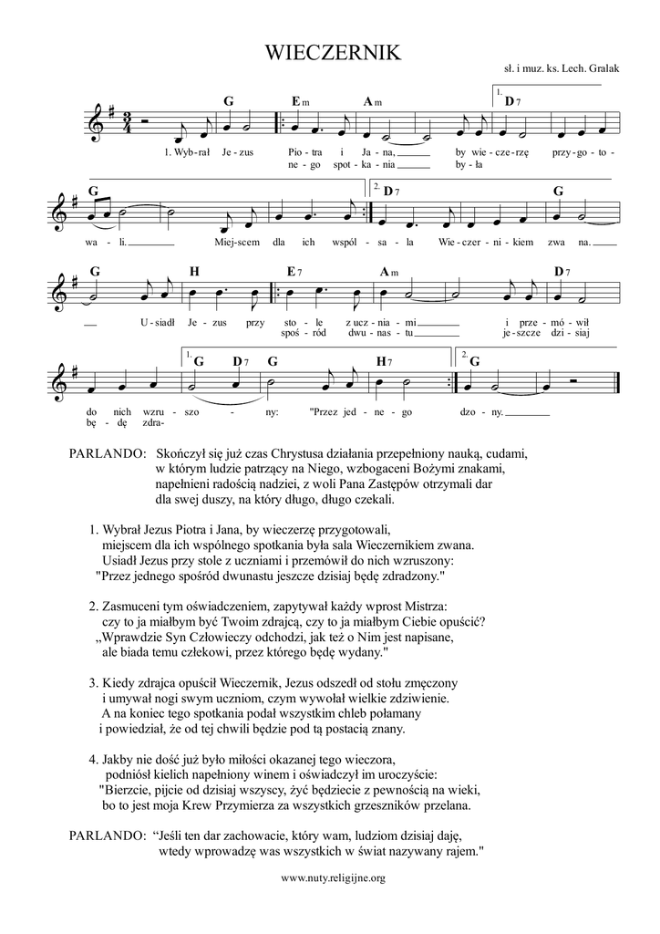 WIECZERNIK ∀ 2 % 3 Ó ∀ 1. Wyb - rał % œ œ ˙ ˙ G % ∀ ˙ % œ Je - zus Miej-scem ι ι Hœ œ − œ œ G U - siadł œ do nich bę - dę Em œ 1. G ˙ wzru - szo zdra- dla ι − D7 œ − œ œ− 2. ich E7 przy i Ja - na, spot - ka - nia œ− œ −− œ Ι Je - zus Am Pio - tra ne - go ι œι œ œ wa - li. ∀ −− œ œ − ι œ œ ˙ ι œι œ ˙ œ G wspól - sa - la œ− sto - le spoś - ród ˙ D7 œ G - ny: œ œ ˙ Ι Am sł. i muz. ks. Lech. Gralak 1. ˙ ι ι œ œ œ ˙ by wie - cze - rzę by - ła ι œ œ œ œ Wie - czer - ni - kiem "Przez jed - ne - go ˙ przy - go - to - G œ ˙ zwa na. i prze - mó - wił je - szcze dzi - siaj 2. −− œ ˙ G dzo - ny. PARLANDO: Skończył się już czas Chrystusa działania przepełniony nauką, cudami, w którym ludzie patrzący na Niego, wzbogaceni Bożymi znakami, napełnieni radością nadziei, z woli Pana Zastępów otrzymali dar dla swej duszy, na który długo, długo czekali. 1. Wybrał Jezus Piotra i Jana, by wieczerzę przygotowali, miejscem dla ich wspólnego spotkania była sala Wieczernikiem zwana. Usiadł Jezus przy stole z uczniami i przemówił do nich wzruszony: "Przez jednego spośród dwunastu jeszcze dzisiaj będę zdradzony." 2. Zasmuceni tym oświadczeniem, zapytywał każdy wprost Mistrza: czy to ja miałbym być Twoim zdrajcą, czy to ja miałbym Ciebie opuścić? „Wprawdzie Syn Człowieczy odchodzi, jak też o Nim jest napisane, ale biada temu człekowi, przez którego będę wydany." 3. Kiedy zdrajca opuścił Wieczernik, Jezus odszedł od stołu zmęczony i umywał nogi swym uczniom, czym wywołał wielkie zdziwienie. A na koniec tego spotkania podał wszystkim chleb połamany i powiedział, że od tej chwili będzie pod tą postacią znany. 4. Jakby nie dość już było miłości okazanej tego wieczora, podniósł kielich napełniony winem i oświadczył im uroczyście: "Bierzcie, pijcie od dzisiaj wszyscy, żyć będziecie z pewnością na wieki, bo to jest moja Krew Przymierza za wszystkich grzeszników przelana. PARLANDO: “Jeśli ten dar zachowacie, który wam, ludziom dzisiaj daję, wtedy wprowadzę was wszystkich w świat nazywany rajem." www.nuty.religijne.org œ œ œ ι ι D7 œ œ œ ˙ z ucz - nia - mi dwu - nas - tu ι œι Hœ 7 ˙ œ D7 œ Ó