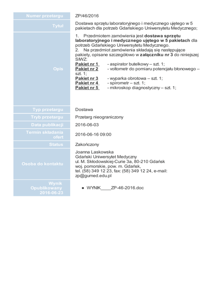 Numer przetargu Tytuł Opis Typ przetargu ZP/46/2016 Dostawa sprzętu laboratoryjnego i medycznego ujętego w 5 pakietach dla potrzeb Gdańskiego Uniwersytetu Medycznego; 1. Przedmiotem zamówienia jest dostawa sprzętu laboratoryjnego i medycznego ujętego w 5 pakietach dla potrzeb Gdańskiego Uniwersytetu Medycznego. 2. Na przedmiot zamówienia składają się następujące pakiety, opisane szczegółowo w załączniku nr 3 do niniejszej SIWZ: Pakiet nr 1 - aspirator butelkowy – szt. 1; Pakiet nr 2 - voltometr do pomiaru potencjału błonowego – szt. 1; Pakiet nr 3 - wyparka obrotowa – szt. 1; Pakiet nr 4 - spirometr – szt. 1; Pakiet nr 5 - mikroskop diagnostyczny – szt. 1; Dostawa Tryb przetargu Przetarg nieograniczony Data publikacji 2016-06-03 Termin składania ofert Status Osoba do kontaktu Wynik Opublikowany 2016-06-23 2016-06-16 09:00 Zakończony Joanna Laskowska Gdański Uniwersytet Medyczny ul. M. Skłodowskiej-Curie 3a, 80-210 Gdańsk woj. pomorskie, pow. m. Gdańsk, tel. (58) 349 12 23, fax: (58) 349 12 24, e-mail: [email protected] WYNIK____ZP-46-2016.doc