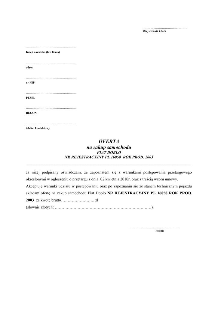 ………………………………………. Miejscowość i data ……………………………………………. Imię i nazwisko (lub firma) ……………………………………………. adres ……………………………………………. nr NIP ……………………………………………. PESEL ……………………………………………. REGON ……………………………………………. telefon kontaktowy OFERTA na zakup samochodu FIAT DOBLO NR REJESTRACYJNY PL 16858 ROK PROD. 2003 ________________________________________________________________ Ja niżej podpisany oświadczam, że zapoznałem się z warunkami postępowania przetargowego określonymi w ogłoszeniu o przetargu z dnia 02 kwietnia 2010r. oraz z treścią wzoru umowy. Akceptuję warunki udziału w postępowaniu oraz po zapoznaniu się ze stanem technicznym pojazdu składam ofertę na zakup samochodu Fiat Doblo NR REJESTRACYJNY PL 16858 ROK PROD. 2003 za kwotę brutto……………………. zł (słownie złotych: ………………………………………………………………). ……………………………………………. Podpis
