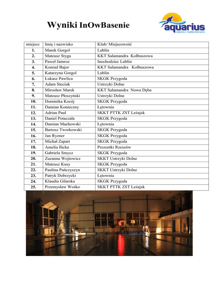 Wyniki InOwBasenie miejsce 1. 2. 3. 4. 5. 6. 7. 8. 9. 10. 11. 12. 13. 14. 15. 16. 17. 18. 19. 20. 21. 22. 23. 24. 25. Imię i nazwisko Marek Gorgol Mateusz Styga Paweł Jamroz Konrad Bajor Katarzyna Gorgol Łukasz Pawlica Adam Steciuk Mirosław Marek Mateusz Płoszyński Dominika Kocój Damian Konieczny Adrian Paul Daniel Potaczała Damian Machowski Bartosz Tworkowski Jan Ryzner Michał Zapart Amelia Ilicka Gabriela Smycz Zuzanna Wojtowicz Mateusz Kusy Paulina Pańczyszyn Patryk Dobrzycki Klaudia Gilarska Przemysław Wośko Klub/ Miejscowość Lublin KKT Salamandra Kolbuszowa Inochodziec Lublin KKT Salamandra Kolbuszowa Lublin SKGK Przygoda Ustrzyki Dolne KKT Salamandra Nowa Dęba Ustrzyki Dolne SKGK Przygoda Łętownia SKKT PTTK ZST Leżajsk SKGK Przygoda Łętownia SKGK Przygoda SKGK Przygoda SKGK Przygoda Prezentki Rzeszów SKGK Przygoda SKKT Ustrzyki Dolne SKGK Przygoda SKKT Ustrzyki Dolne Łętownia SKGK Przygoda SKKT PTTK ZST Leżajsk