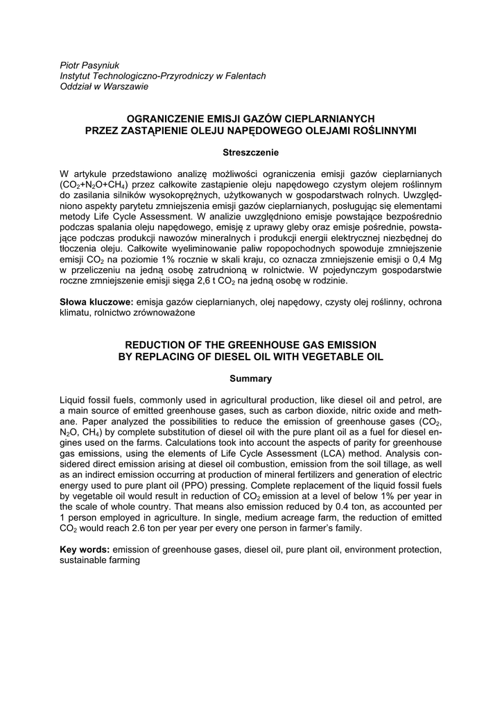 Piotr Pasyniuk Instytut Technologiczno-Przyrodniczy w Falentach Oddział w Warszawie OGRANICZENIE EMISJI GAZÓW CIEPLARNIANYCH PRZEZ ZASTĄPIENIE OLEJU NAPĘDOWEGO OLEJAMI ROŚLINNYMI Streszczenie W artykule przedstawiono analizę możliwości ograniczenia emisji gazów cieplarnianych (CO2+N2O+CH4) przez całkowite zastąpienie oleju napędowego czystym olejem roślinnym do zasilania silników wysokoprężnych, użytkowanych w gospodarstwach rolnych. Uwzględniono aspekty parytetu zmniejszenia emisji gazów cieplarnianych, posługując się elementami metody Life Cycle Assessment. W analizie uwzględniono emisje powstające bezpośrednio podczas spalania oleju napędowego, emisję z uprawy gleby oraz emisje pośrednie, powstające podczas produkcji nawozów mineralnych i produkcji energii elektrycznej niezbędnej do tłoczenia oleju. Całkowite wyeliminowanie paliw ropopochodnych spowoduje zmniejszenie emisji CO2 na poziomie 1% rocznie w skali kraju, co oznacza zmniejszenie emisji o 0,4 Mg w przeliczeniu na jedną osobę zatrudnioną w rolnictwie. W pojedynczym gospodarstwie roczne zmniejszenie emisji sięga 2,6 t CO2 na jedną osobę w rodzinie. Słowa kluczowe: emisja gazów cieplarnianych, olej napędowy, czysty olej roślinny, ochrona klimatu, rolnictwo zrównoważone REDUCTION OF THE GREENHOUSE GAS EMISSION BY REPLACING OF DIESEL OIL WITH VEGETABLE OIL Summary Liquid fossil fuels, commonly used in agricultural production, like diesel oil and petrol, are a main source of emitted greenhouse gases, such as carbon dioxide, nitric oxide and methane. Paper analyzed the possibilities to reduce the emission of greenhouse gases (CO2, N2O, CH4) by complete substitution of diesel oil with the pure plant oil as a fuel for diesel engines used on the farms. Calculations took into account the aspects of parity for greenhouse gas emissions, using the elements of Life Cycle Assessment (LCA) method. Analysis considered direct emission arising at diesel oil combustion, emission from the soil tillage, as well as an indirect emission occurring at production of mineral fertilizers and generation of electric energy used to pure plant oil (PPO) pressing. Complete replacement of the liquid fossil fuels by vegetable oil would result in reduction of CO2 emission at a level of below 1% per year in the scale of whole country. That means also emission reduced by 0.4 ton, as accounted per 1 person employed in agriculture. In single, medium acreage farm, the reduction of emitted CO2 would reach 2.6 ton per year per every one person in farmer’s family. Key words: emission of greenhouse gases, diesel oil, pure plant oil, environment protection, sustainable farming