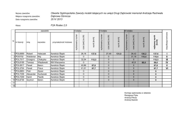Data rozegrania zawodów: Otwarte Ogólnopolskie Zawody modeli latajacych na uwięzi Drugi Dąbrowski memoriał Andrzeja Rachwała Dąbrowa Górnicza 20 IV 2013 Klasa: F2A Rodeo 2,5 1 2 3 4 5 6 7 8 9 10 11 12 Aeroklub Śląski Aeroklub Śląski Aeroklub Śląski KM Wierzawice Aeroklub Śląski Aeroklub Śląski Aeroklub Śląski Aeroklub Śląski Aeroklub Śląski Aeroklub Śląski 26,16 0 32,04 0 40,96 41,01 0 0 0 0 137,6 112,3 87,8 87,7 27,48 0 0 0 0 0 0 0 0 0 131,0 26,42 31,18 0 40,9 0 0 0 0 0 0 136,2 115,4 88,0 Komisja sędziowska w składzie: Remigiusz Pyka Andrzej Pikosz Andrzej Sawicki 137,6 115,4 112,3 88,0 87,8 87,7 0 0 0 0 klasyfikacja końcowa najlepszy wynik [km/h] Holeczek Maj Chałupka Wlazłowski Baron Praus Zipzer Suchanek Pawlik Baran wynik [km/h] Robert Waldemar Grzegorz Tomasz Paweł Paweł Piotr Alexander Kamil Szymon czas [sek] (ss,00) POL6559 POl3702 POL7017 POL6106 POL5917 POL3704 POL6953 POL7238 POL7239 POL6736 przynależność klubowa wylosowany numer nazwisko wynik [km/h] imię III kolejka czas [sek] (ss,00) nr licencji II kolejka wylosowany numer lp I kolejka wynik [km/h] zawodnik czas [sek] (ss,00) Miejsce rozegrania zawodów: wylosowany numer Nazwa zawodów: I II III IV V VI