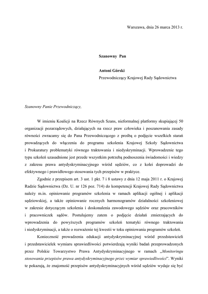 Warszawa, dnia 26 marca 2013 r. Szanowny Pan Antoni Górski Przewodniczący Krajowej Rady Sądownictwa Szanowny Panie Przewodniczący, W imieniu Koalicji na Rzecz Równych Szans, nieformalnej platformy skupiającej 50 organizacji pozarządowych, działających na rzecz praw człowieka i poszanowania zasady równości zwracamy się do Pana Przewodniczącego z prośbą o podjęcie wszelkich starań prowadzących do włączenia do programu szkolenia Krajowej Szkoły Sądownictwa i Prokuratury problematyki równego traktowania i niedyskryminacji. Wprowadzenie tego typu szkoleń uzasadnione jest przede wszystkim potrzebą podnoszenia świadomości i wiedzy z zakresu prawa antydyskryminacyjnego wśród sędziów, co z kolei doprowadzi do efektywnego i prawidłowego stosowania tych przepisów w praktyce. Zgodnie z przepisem art. 3 ust. 1 pkt. 7 i 8 ustawy z dnia 12 maja 2011 r. o Krajowej Radzie Sądownictwa (Dz. U. nr 126 poz. 714) do kompetencji Krajowej Rady Sądownictwa należy m.in. opiniowanie programów szkolenia w ramach aplikacji ogólnej i aplikacji sędziowskiej, a także opiniowanie rocznych harmonogramów działalności szkoleniowej w zakresie dotyczącym szkolenia i doskonalenia zawodowego sędziów oraz pracowników i pracowniczek sądów. Postulujemy zatem o podjęcie działań zmierzających do wprowadzenia do powyższych programów szkoleń tematyki równego traktowania i niedyskryminacji, a także o rozważenie tej kwestii w toku opiniowania programów szkoleń. Konieczność prowadzenia edukacji antydyskryminacyjnej wśród przedstawicieli i przedstawicielek wymiaru sprawiedliwości potwierdzają wyniki badań przeprowadzonych przez Polskie Towarzystwo Prawa Antydyskryminacyjnego w ramach „Monitoringu stosowania przepisów prawa antydyskryminacyjnego przez wymiar sprawiedliwości”. Wyniki te pokazują, że znajomość przepisów antydyskryminacyjnych wśród sędziów wydaje się być wciąż niewystarczająca. Obawy budzą również postawy wielu przedstawicieli i przedstawicielek tej grupy zawodowej odnośnie tematyki równego traktowania oraz dyskryminacji. Badani sędziowie wyrażali bowiem wątpliwości co do zasadności poszczególnych rozwiązań prawnych (np. zasady przeniesionego ciężaru dowodu czy otwartego katalogu przesłanek). Analiza orzeczeń w sprawach z zakresu dyskryminacji wykazała, że problemem jest także błędne rozumienie przepisów antydyskryminacyjnych. Zdarza się również, że sędziowie powielają powszechnie panujące opinie i stereotypy na temat zjawiska dyskryminacji, grup mniejszościowych czy grup, które najczęściej dyskryminują innych. W tym miejscu warto podkreślić, że oferta szkoleniowa skierowana do przedstawicieli i przedstawicielek wymiaru sprawiedliwości oprócz tego, że powinna odnosić się do krajowych i międzynarodowych prawnych standardów antydyskryminacyjnych, powinna także prowadzić do zmiany indywidualnych postaw wobec kwestii dyskryminacji oraz grup mniejszościowych na nią narażonych. W tym celu w programach szkoleniowych powinno uwzględnić się kontekst społeczny problemu dyskryminacji (złożoność tożsamości, mechanizm stereotypizacji, wykluczenia, czy konsekwencji funkcjonowania w społeczeństwie płci społeczno - kulturowej). Na potrzebę wprowadzenia obowiązkowej edukacji antydyskryminacyjnej dla przedstawicieli i przedstawicielek wymiaru sprawiedliwości zwróciła uwagę również minister Agnieszka Kozłowska – Rajewicz, Pełnomocniczka Rządu do spraw Równego Traktowania w projekcie Krajowego Programu Działań na Rzecz Równego traktowania 2013 – 2015. Zdaniem minister Kozłowskiej - Rajewicz rozwój polityki równego traktowania w Polsce powinien być wspomagany wzrostem świadomości i wiedzy na temat dyskryminacji wśród pracowników instytucji rządowych oraz przedstawicieli i przedstawicielek wymiaru sprawiedliwości. Pozwoli to bowiem na podniesienie jakości praktycznego stosowania przepisów prawa antydyskryminacyjnego, a co za tym idzie prowadzenie przez Polskę skutecznej polityki antydyskryminacyjnej. Pragniemy przypomnieć, że konieczność uzupełnienia oferty szkoleniowej sędziów o problematykę równego traktowania była podniesiona także podczas rozpatrywania przez Sejm RP w dniu 29 sierpnia 2012 r. Informacji z działalności Krajowej Rady Sądownictwa w 2011 roku. Parlamentarzyści podczas debaty sejmowej podkreślali wagę wprowadzenia do harmonogramów szkoleń z tematyki praw człowieka, zwalczania rasizmu, ksenofobii, dyskryminacji, czy przestępstw z nienawiści. Koalicja na Rzecz Równych Szans deklaruje swoją pełną otwartość na współpracę z Panem Przewodniczącym oraz Krajową Radą Sądownictwa w zakresie przedstawionym w niniejszym wystąpieniu, tak, aby podjęte kroki wychodziły naprzeciw oczekiwaniom i potrzebom osobom, które doświadczają nierównego traktowania w szczególności z uwagi na płeć, wiek, niepełnosprawność, orientację seksualną, tożsamość płciową, religię lub wyznanie, rasę lub pochodzenie etniczne. w imieniu Koalicji na Rzecz Równych Szans r.pr. Karolina Kędziora Wiceprezeska Zarządu Polskiego Towarzystwa Prawa Antydyskryminacyjnego Do wiadomości: - Jarosław Gowin, Minister Sprawiedliwości, - prof. Irena Lipowicz, Rzecznik Praw Obywatelskich, - Agnieszka Kozłowska – Rajewicz, Pełnomocniczka Rządu ds. Równego Traktowania. Koalicja na Rzecz Równych Szans to nieformalna platforma skupiająca szereg organizacji działających na rzecz praw człowieka i promowania zasady równości i niedyskryminacji. Organizacje wchodzące w skład Koalicji są wiodącymi polskimi organizacjami eksperckimi od lat aktywnymi w obszarze przeciwdziałania dyskryminacji. Głównym celem platformy jest prowadzenie merytorycznego dialogu z rządem odpowiedzialnym za opracowanie kompleksowego i skutecznego prawa antydyskryminacyjnego. Polskie Towarzystwo Prawa Antydyskryminacyjnego jest koordynatorem prac Koalicji. Org