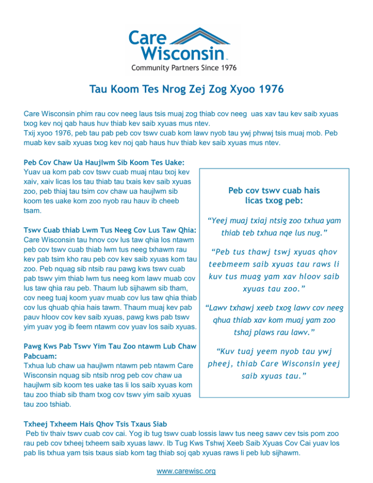 Tau Koom Tes Nrog Zej Zog Xyoo 1976 Care Wisconsin phim rau cov neeg laus tsis muaj zog thiab cov neeg uas xav tau kev saib xyuas txog kev noj qab haus huv thiab kev saib xyuas mus ntev. Txij xyoo 1976, peb tau pab peb cov tswv cuab kom lawv nyob tau ywj phwwj tsis muaj mob. Peb muab kev saib xyuas txog kev noj qab haus huv thiab kev saib xyuas mus ntev. Peb Cov Chaw Ua Haujlwm Sib Koom Tes Uake: Yuav ua kom pab cov tswv cuab muaj ntau txoj kev xaiv, xaiv licas los tau thiab tau txais kev saib xyuas zoo, peb thiaj tau tsim cov chaw ua haujlwm sib koom tes uake kom zoo nyob rau hauv ib cheeb tsam. Peb cov tswv cuab hais licas txog peb: “Yeej muaj txiaj ntsig zoo txhua yam Tswv Cuab thiab Lwm Tus Neeg Cov Lus Taw Qhia: Care Wisconsin tau hnov cov lus taw qhia los ntawm peb cov tswv cuab thiab lwm tus neeg txhawm rau kev pab tsim kho rau peb cov kev saib xyuas kom tau zoo. Peb nquag sib ntsib rau pawg kws tswv cuab pab tswv yim thiab lwm tus neeg kom lawv muab cov lus taw qhia rau peb. Thaum lub sijhawm sib tham, cov neeg tuaj koom yuav muab cov lus taw qhia thiab cov lus qhuab qhia hais tawm. Thaum muaj kev pab pauv hloov cov kev saib xyuas, pawg kws pab tswv yim yuav yog ib feem ntawm cov yuav los saib xyuas. Pawg Kws Pab Tswv Yim Tau Zoo ntawm Lub Chaw Pabcuam: Txhua lub chaw ua haujlwm ntawm peb ntawm Care Wisconsin nquag sib ntsib nrog peb cov chaw ua haujlwm sib koom tes uake tas li los saib xyuas kom tau zoo thiab sib tham txog cov tswv yim saib xyuas tau zoo tshiab. thiab teb txhua nqe lus nug.” “Peb tus thawj tswj xyuas qhov teebmeem saib xyuas tau raws li kuv tus muag yam xav hloov saib xyuas tau zoo.” “Lawv txhawj xeeb txog lawv cov neeg qhua thiab xav kom muaj yam zoo tshaj plaws rau lawv.” “Kuv tuaj yeem nyob tau ywj pheej, thiab Care Wisconsin yeej saib xyuas tau.” Txheej Txheem Hais Qhov Tsis Txaus Siab Peb tiv thaiv tswv cuab cov cai. Yog ib tug tswv cuab lossis lawv tus neeg sawv cev tsis pom zoo rau peb cov txheej txheem saib xyuas lawv. Ib Tug Kws Tshwj Xeeb Saib Xyuas Cov Cai yuav los pab lis txhua yam tsis txaus siab kom tag thiab soj qab xyuas raws li peb lub sijhawm. www.carewisc.org Kev Tswj Xyuas Tau Zoo: Care Wisconsin yeej ib txwm tsim kho peb cov kev saib xyuas kom tau zoo thiab saib xyuas kom tau zoo rau cov tswv cuab. Peb ua tau txhua yam thiab tshaj qhov lub xeev thiab tsoomfwv txoj cai saib xyuas kom tau zoo. • Daim Ntawv Tshawb Fawb Txog Kev Txaus Siab thiab pawg tswv cuab pab tswv yim tau muab cov lus taw qhia los ntawm cov tswv cuab ntawm rau cov thawj coj ntawm lub chaw ua haujlwm thiab cov chaw saib xyuas. • Ib lub chaw ua haujlwm sab nrauv yuav tau los teeb tsa kev saib xyuas feem ua haujlwm ntawm lub chaw ua haujlwm (EQRO) ib xyoos ib zaug. Los txheeb xyuas txog tej yam tseem ceeb uas zoo rau kev saib xyuas thiab kev pabcuam nyob rau ntawm lub chaw ua haujlwm. • Kev tsim kho ntau txoj haujlwm yuav cuam tshuam rau ntau tus tswv cuab, thiab muaj qhov tshwm sim tsis zoo rau cov tswv cuab. Care Wisconsin yeej siv EQRO txheeb xyuas tas li txog feem ua tau zoo tshaj plaws ntawm cov haujlwm tsim kho kev saib xyuas. • Peb tau txais kev qhua zoo txog peb li txheej txheem hais qhia txog tej yam teem meej tsis zoo nyob hauv cov ntaub ntawv thiab kev txheeb xyuas uas raug siv los tshwj xyuas tej yam teeb meem tsis zoo nrog rau tej yam muaj feem ua rau raug saib xyuas tsis zoo uas yuav pab txo kom txhob khomob yuam kev thiab ntog tsoo. Peb Lub Luag Haujlwm thiab Kev Ntseeg Yuav pab txhawb kev noj qab nyob zoo ntawm peb cov neeg hauv zej zog kom sawd daws sib pab txhawb thiab ua haujlwm uake los daws tej yam xav tau kev saib xyuas tshwj xeeb thiab kev saib xyuas mus ntev raws li lub siab xab. Yuav siv nyiaj txiag kom zoo los pab txhawb rau feem kev tsim kho kom loj hlob thiab txuas mus ntxiv rau yam tom ntej. Peb kab lis kev cai yog kev ncaj ncees, kev saib xyuas zoo thiab kev coj zoo rau peb cov tswv cuab, cov neeg ua haujlwm uake thiab muaj kev saib taus txog lub meej mom ntawm txhua tus neeg. Yog xav paub ntau ntxiv, thov hu rau peb rau ntawm tus xovtooj: Kev Sib Koom Tes thiab Kev Saib Xyuas Tsev Neeg: 1-800-963-0035 Medicaid SSI: 1-855-463-0026 TTY: Hu Rau Wisconsin Tus Xovtooj Cua (Relay System) 711 Lub Chaw Haujlwm Muab Kev Saib Xyuas Muaj Vaj Huam Sib LuagKhoom siv ID#CWB6-27-14A_HMG DHS Raug pom zoo 7/9/2014