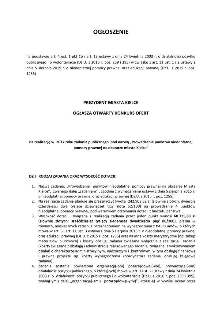 OGŁOSZENIE na podstawie art. 4 ust. 1 pkt 1b i art. 13 ustawy z dnia 24 kwietnia 2003 r. o działalności pożytku publicznego i o wolontariacie (Dz.U. z 2016 r. poz. 239 i 395) w związku z art. 11 ust. 1 i 2 ustawy z dnia 5 sierpnia 2015 r. o nieodpłatnej pomocy prawnej oraz edukacji prawnej (Dz.U. z 2015 r. poz. 1255) PREZYDENT MIASTA KIELCE OGŁASZA OTWARTY KONKURS OFERT na realizację w 2017 roku zadania publicznego pod nazwą „Prowadzenie punktów nieodpłatnej pomocy prawnej na obszarze miasta Kielce” DZ.I RODZAJ ZADANIA ORAZ WYSOKOŚĆ DOTACJI: 1. Nazwa zadania: „Prowadzenie punktów nieodpłatnej pomocy prawnej na obszarze Miasta Kielce”, zwanego dalej „zadaniem” , zgodnie z wymaganiami ustawy z dnia 5 sierpnia 2015 r. o nieodpłatnej pomocy prawnej oraz edukacji prawnej (Dz.U. z 2015 r. poz. 1255). 2. Na realizację zadania planuje się przeznaczyć kwotę 242.903,52 zł (słownie złotych: dwieście czterdzieści dwa tysiące dziewięćset trzy złote 52/100) na prowadzenie 4 punktów nieodpłatnej pomocy prawnej, pod warunkiem otrzymania dotacji z budżetu państwa. 3. Wysokość dotacji związana z realizacją zadania przez jeden punkt wynosi 60.725,88 zł (słownie złotych: sześćdziesiąt tysięcy siedemset dwadzieścia pięć 88/100), płatna w równych, miesięcznych ratach, z przeznaczeniem na wynagrodzenia z tytułu umów, o których mowa w art. 6 i art. 11 ust. 3 ustawy z dnia 5 sierpnia 2015 r. o nieodpłatnej pomocy prawnej oraz edukacji prawnej (Dz.U. z 2015 r. poz. 1255) oraz na inne koszty merytoryczne (np. zakup materiałów biurowych) i koszty obsługi zadania związane wyłącznie z realizacją zadania (koszty związane z obsługą i administracją realizowanego zadania, związane z wykonywaniem działań o charakterze administracyjnym, nadzorczym i kontrolnym, w tym obsługę finansową i prawną projektu np. koszty wynagrodzenia koordynatora zadania, obsługę księgową zadania). 4. Zadanie zostanie powierzone organizacji(-om) pozarządowej(-ym), prowadzącej(-ym) działalność pożytku publicznego, o której(-ych) mowa w art. 3 ust. 2 ustawy z dnia 24 kwietnia 2003 r. o działalności pożytku publicznego i o wolontariacie (Dz.U. z 2016 r. poz. 239 i 395), zwaną(-ymi) dalej „organizacją(-ami) pozarządową(-ymi)”, która(-e) w wyniku oceny przez Komisję Konkursową złożonych ofert, według kryteriów określonych w dziale V ust. 1 ogłoszenia otrzyma(-ją) największą liczbę punktów i jej/ ich rekomendacja zostanie przyjęta przez Prezydenta Miasta Kielce. 5. Zadania z zakresu udzielania nieodpłatnej pomocy prawnej w 2015 roku nie były realizowane, w 2016 r. na realizację zadania przeznacza się dotację w wysokości 239.784,00 zł. DZ. II TERMIN I MIEJSCE REALIZACJI ZADANIA: 1. Termin realizacji zadania: od dnia 1 stycznia 2017 roku do dnia 31 grudnia 2017 roku. 2. Miejsce realizacji zadania: zadanie będzie realizowane na obszarze miasta Kielce w następujących punktach: a) ul. Młoda 28 – dwa punkty (Punkt Nr 5 i Punkt Nr 6) usytuowane w jednym lokalu; b) ul. Miodowa 7 – dwa punkty (Punkt Nr 7 i Punkt Nr 8) usytuowane w jednym lokalu. 3. W lokalach wymienionych w ust. 2 zapewnione zostaną: 1) podstawowe meble biurowe (zamykana szafa, biurko, krzesła); 2) dostęp do sieci energetycznej, telefonicznej (w tym aparat telefoniczny wraz z przyporządkowanym numerem) i teleinformatycznej wraz z dostępem do internetu oraz komputer, drukarka, skaner; 3) właściwe warunki oczekiwania osób chcących uzyskać nieodpłatną pomoc prawną oraz dostęp do lokalu osobom niepełnosprawnym. DZ. III PODMIOTY UPRAWNIONE DO ZŁOŻENIA OFERTY: 1. Podmiotem uprawnionym do złożenia oferty jest organizacja pozarządowa, w zakresie, o którym mowa w art. 4 ust. 1 pkt 1b ustawy z dnia 24 kwietnia 2003 roku o działalności pożytku publicznego i o wolontariacie, spełniająca łącznie następujące warunki: 1) posiada co najmniej dwuletnie doświadczenie w wykonywaniu zadań wiążących się z udzielaniem porad prawnych lub informacji prawnych; 2) przedstawi zawarte umowy lub promesy ich zawarcia z adwokatem/adwokatami, radcą prawnym/radcami prawnymi, doradcą podatkowym/doradcami podatkowymi lub osobą/osobami , o której/których mowa w art. 11 ust. 3 pkt 2 ustawy z dnia 5 sierpnia 2015r. o nieodpłatnej pomocy prawnej oraz edukacji prawnej; 3) daje gwarancję należytego wykonania zadania, w szczególności przez złożenie pisemnego zobowiązania: a) zapewnienia poufności w związku z udzielaniem nieodpłatnej pomocy prawnej i jej dokumentowaniem; b) zapewnienia profesjonalnego i rzetelnego udzielania nieodpłatnej pomocy prawnej, w szczególności w sytuacji, gdy zachodzi konflikt interesów. 2. Osoby realizujące bezpośrednio zadanie muszą posiadać odpowiednie kwalifikacje i doświadczenie w tym zakresie, zgodnie z art. 5 oraz art. 11 ust. 3 ustawy o nieodpłatnej pomocy prawnej oraz edukacji prawnej. 3. O powierzenie prowadzenia punktów nieodpłatnej pomocy prawnej nie może ubiegać się organizacja pozarządowa, która w okresie dwóch lat poprzedzających przystąpienie do otwartego konkursu ofert nie rozliczyła się z dotacji przyznanej na wykonanie zadania publicznego lub wykorzystała dotację niezgodnie z celem jej przyznania, jak również organizacja pozarządowa, z którą Prezydent Miasta Kielce rozwiązał umowę. Termin dwóch lat biegnie odpowiednio od dnia rozliczenia się z dotacji i zwrotu nienależnych środków wraz z odsetkami albo rozwiązania umowy. 4. Dwie lub więcej organizacje pozarządowe działające wspólnie mogą złożyć ofertę wspólną na zasadach określonych w art. 14 ust. 3-5 ustawy z dnia 24 kwietnia 2003 r. o działalności pożytku publicznego i o wolontariacie (Dz.U. z 2016 r. poz. 239 i 395). DZ.IV TERMINY I SPOSÓB SKŁADANIA OFERT 1. Zadanie, którego dotyczy otwarty konkurs ofert zostaje podzielone na dwie części, tj. 1) Część Nr 1 „Prowadzenie Punktu Nr 5 i Punktu Nr