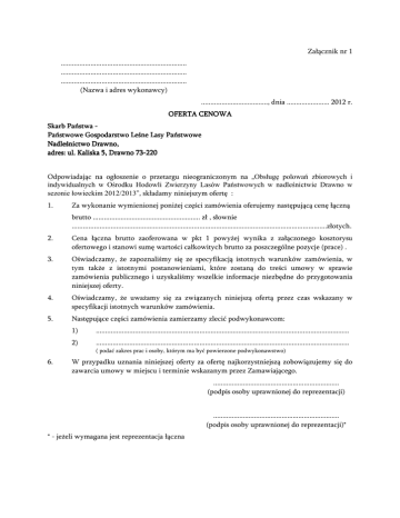 Załącznik nr 1 .................................................................... .................................................................... .................................................................... (Nazwa i adres wykonawcy) ...................................., dnia ....................... 2012 r. OFERTA CENOWA Skarb Państwa Państwowe Gospodarstwo Leśne Lasy Państwowe Nadleśnictwo Drawno, adres: ul. Kaliska 5, Drawno 7373-220 Odpowiadając na ogłoszenie o przetargu nieograniczonym na „Obsługę polowań zbiorowych i indywidualnych w Ośrodku Hodowli Zwierzyny Lasów Państwowych w nadleśnictwie Drawno w sezonie łowieckim 2012/2013”, składamy niniejszym ofertę : 1. Za wykonanie wymienionej poniżej części zamówienia oferujemy następującą cenę łączną brutto .......................................................... zł , słownie ..........................................................................................................................................złotych. 2. Cena łączna brutto zaoferowana w pkt 1 powyżej wynika z załączonego kosztorysu ofertowego i stanowi sumę wartości całkowitych brutto za poszczególne pozycje (prace) . 3. Oświadczamy, że zapoznaliśmy się ze specyfikacją istotnych warunków zamówienia, w tym także z istotnymi postanowieniami, które zostaną do treści umowy w sprawie zamówienia publicznego i uzyskaliśmy wszelkie informacje niezbędne do przygotowania niniejszej oferty. 4. Oświadczamy, że uważamy się za związanych niniejszą ofertą przez czas wskazany w specyfikacji istotnych warunków zamówienia. 5. Następujące części zamówienia zamierzamy zlecić podwykonawcom: 1) 2) ......................................................................................................................................... ......................................................................................................................................... ( podać zakres prac i osoby, którym ma być powierzone podwykonawstwo) 6. W przypadku uznania niniejszej oferty za ofertę najkorzystniejszą zobowiązujemy się do zawarcia umowy w miejscu i terminie wskazanym przez Zamawiającego. .................................................................... (podpis osoby uprawnionej do reprezentacji) .................................................................... (podpis osoby uprawnionej do reprezentacji)* * - jeżeli wymagana jest reprezentacja łączna Załącznik nr 2 .............................................. ( pieczęć oferenta ) OŚWIADCZENIE Przystępując do udziału w postępowaniu o zamówienie publiczne na Obsługę polowań zbiorowych i indywidualnych w Ośrodku Hodowli Zwierzyny Lasów Państwowych w nadleśnictwie Drawno w sezonie łowieckim 2012/2013 oświadczamy, że: 1. Posiadamy uprawnienia niezbędne do wykonania określonych prac lub czynności, jeżeli ustawy nakładają obowiązek takich uprawnień, 2. Posiadamy niezbędną wiedzę i doświadczenie oraz potencjał techniczny, a także dysponujemy osobami zdolnymi do wykonania zamówienia, 3. Znajdujemy się w sytuacji ekonomicznej i finansowej zapewniającej wykonanie zamówienia, 4. Nie podlegamy wykluczeniu z postępowania na podstawie art. 24. ................................, dn. ...................... ......................................................... (pieczątka i podpis oferenta lub upoważnionego przedstawiciela ) Załącznik nr 3 ........................................, dnia ............................ KOSZTORYS OFERTOWY - Polowania zbiorowe i indywidualne Skarb Państwa Państwowe Gospodarstwo Leśne Lasy Państwowe Nadleśnictwo Drawno, Adres: ul. Kaliska Kaliska 5 , 7373-220 Drawno Odpowiadając na ogłoszenie o przetargu nieograniczonym na „Obsługę polowań zbiorowych i indywidualnych w Ośrodku Hodowli Zwierzyny Lasów Państwowych w nadleśnictwie Drawno w sezonie łowieckim 2012/2013”, składamy niniejszym ofertę i oferujemy następujące stawki za wykonanie zamówienia: Czynności Kompleksowa obsługa polowania zbiorowego Preparacja wieńca jelenia Preparacja oręża dzika Preparacja trofeów sarny OGÓŁEM 1. 2. 3. 4. Jedn. Ilość dzień szt. szt. szt. 20 35 10 7 X X Stawka jednostk. netto X Wartość netto PLN Stawka Podatek VAT VAT % PLN X .................................................................... (podpis osoby uprawnionej do reprezentacji) Wartość całkowita brutto Załącznik nr 4 pieczęć wykonawcy OŚWIADCZENIE Składając ofertę w trybie przetarg nieograniczony na: Obsługa polowań zbiorowych i indywidualnych w Ośrodku Hodowli Zwierzyny Lasów Państwowych w Nadleśnictwie Drawno , w sezonie łowieckim 2012/2013 oświadczamy, że brak jest podstaw do wykluczenia nas na podstawie okoliczności, o których mowa w art. 24 ust. 1 ustawy z dnia 29 stycznia 2004 roku Prawo Zamówień Publicznych (Dz. U. z 2010 r. Nr 113, poz. 759, z późn. zm.), zgodnie z którym z postępowania o udzielenie zamówienia wyklucza się: 1) wykonawców, którzy wyrządzili szkodę, nie wykonując zamówienia lub wykonując je nienależycie, jeżeli szkoda ta została stwierdzona orzeczeniem sądu, które uprawomocniło się w okresie 3 lat przed wszczęciem postępowania; 1a) wykonawców, z którymi dany zamawiający rozwiązał albo wypowiedział umowę w sprawie zamówienia publicznego albo odstąpił od umowy w sprawie zamówienia publicznego, z powodu okoliczności, za które wykonawca ponosi odpowiedzialność, jeżeli rozwiązanie albo wypowiedzenie umowy albo odstąpienie od niej nastąpiło w okresie 3 lat przed wszczęciem postępowania, a wartość niezrealizowanego zamówienia wyniosła co najmniej 5% wartości umowy; 2) wykonawców, w stosunku do których otwarto likwidację lub których upadłość ogłoszono, z wyjątkiem wykonawców, którzy po ogłoszeniu upadłości zawarli układ zatwierdzony prawomocnym postanowieniem sądu, jeżeli układ nie przewiduje zasp