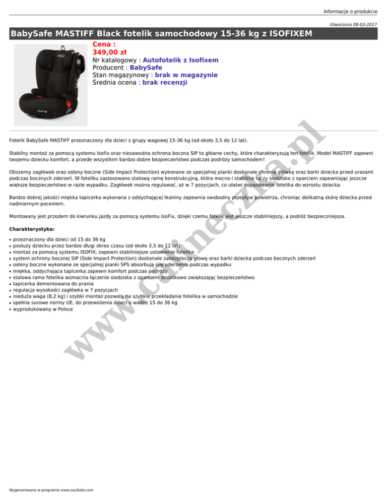 Informacje o produkcie Utworzono 08-03-2017 BabySafe MASTIFF Black fotelik samochodowy 15-36 kg z ISOFIXEM Cena : 349,00 zł Fotelik BabySafe MASTIFF przeznaczony dla dzieci z grupy wagowej 15-36 kg (od około 3,5 do 12 lat). pl Nr katalogowy : Autofotelik z Isofixem Producent : BabySafe Stan magazynowy : brak w magazynie Średnia ocena : brak recenzji zk a. Stabilny montaż za pomocą systemu Isofix oraz niezawodna ochrona boczna SIP to główne cechy, które charakteryzują ten fotelik. Model MASTIFF zapewni twojemu dziecku komfort, a przede wszystkim bardzo dobre bezpieczeństwo podczas podróży samochodem! Obszerny zagłówek oraz osłony boczne (Side Impact Protection) wykonane ze specjalnej pianki doskonale chronią główkę oraz barki dziecka przed urazami podczas bocznych zderzeń. W foteliku zastosowano stalową ramę konstrukcyjną, która mocno i stabilnie łączy siedzisko z oparciem zapewniając jeszcze większe bezpieczeństwo w razie wypadku. Zagłówek można regulować, aż w 7 pozycjach, co ułatwi dopasowanie fotelika do wzrostu dziecka. ec Bardzo dobrej jakości miękka tapicerka wykonana z oddychającej tkaniny zapewnia swobodny przepływ powietrza, chroniąc delikatną skórę dziecka przed nadmiernym poceniem. Montowany jest przodem do kierunku jazdy za pomocą systemu IsoFix, dzięki czemu fotelik jest jeszcze stabilniejszy, a podróż bezpieczniejsza. Charakterystyka: ● ● ● ● ● ● ● ● w w ● in ● przeznaczony dla dzieci od 15 do 36 kg posłuży dziecku przez bardzo długi okres czasu (od około 3,5 do 12 lat) montaż za pomocą systemu ISOFIX, zapewni stabilniejsze ustawienie fotelika system ochrony bocznej SIP (Side Impact Protection) doskonale zabezpiecza głowę oraz barki dziecka podczas bocznych zderzeń osłony boczne wykonane ze specjalnej pianki SPS absorbują siłę uderzenia podczas wypadku miękka, oddychająca tapicerka zapewni komfort podczas podróży stalowa rama fotelika wzmacnia łączenie siedziska z oparciem dodatkowo zwiększając bezpieczeństwo tapicerka demontowana do prania regulacja wysokości zagłówka w 7 pozycjach nieduża waga (8,2 kg) i szybki montaż pozwolą na szybkie przekładanie fotelika w samochodzie spełnia surowe normy UE, do przewożenia dzieci o wadze 15 do 36 kg wyprodukowany w Polsce .c al ● w ● Wygenerowano w programie www.oscGold.com w w pl zk a. ec in .c al w