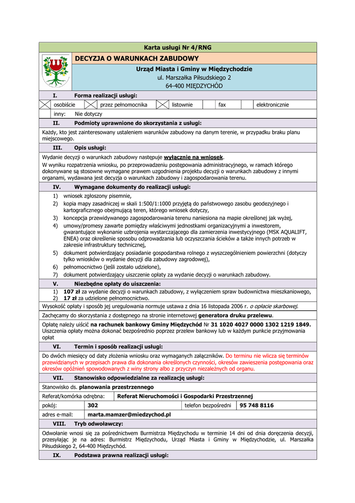 Karta usługi Nr 4/RNG DECYZJA O WARUNKACH ZABUDOWY Urząd Miasta i Gminy w Międzychodzie ul. Marszałka Piłsudskiego 2 64-400 MIĘDZYCHÓD I. Forma realizacji usługi: inny: Nie dotyczy osobiście przez pełnomocnika listownie II. Podmioty uprawnione do skorzystania z usługi: III. Opis usługi: fax elektronicznie Każdy, kto jest zainteresowany ustaleniem warunków zabudowy na danym terenie, w przypadku braku planu miejscowego. Wydanie decyzji o warunkach zabudowy następuje wyłącznie na wniosek. W wyniku rozpatrzenia wniosku, po przeprowadzeniu postępowania administracyjnego, w ramach którego dokonywane są stosowne wymagane prawem uzgodnienia projektu decyzji o warunkach zabudowy z innymi organami, wydawana jest decyzja o warunkach zabudowy i zagospodarowania terenu. IV. 1) 2) 3) 4) 5) 6) 7) Wymagane dokumenty do realizacji usługi: wniosek zgłoszony pisemnie, kopia mapy zasadniczej w skali 1:500/1:1000 przyjętą do państwowego zasobu geodezyjnego i kartograficznego obejmującą teren, którego wniosek dotyczy, koncepcja przewidywanego zagospodarowania terenu naniesiona na mapie określonej jak wyżej, umowy/promesy zawarte pomiędzy właściwymi jednostkami organizacyjnymi a inwestorem, gwarantujące wykonanie uzbrojenia wystarczającego dla zamierzenia inwestycyjnego (MSK AQUALIFT, ENEA) oraz określenie sposobu odprowadzania lub oczyszczania ścieków a także innych potrzeb w zakresie infrastruktury technicznej, dokument potwierdzający posiadanie gospodarstwa rolnego z wyszczególnieniem powierzchni (dotyczy tylko wniosków o wydanie decyzji dla zabudowy zagrodowej), pełnomocnictwo (jeśli zostało udzielone), dokument potwierdzający uiszczenie opłaty za wydanie decyzji o warunkach zabudowy. V. Niezbędne opłaty do uiszczenia: 1) 107 zł za wydanie decyzji o warunkach zabudowy, z wyłączeniem spraw budownictwa mieszkaniowego, 2) 17 zł za udzielone pełnomocnictwo. Wysokość opłaty i sposób jej uregulowania normuje ustawa z dnia 16 listopada 2006 r. o opłacie skarbowej. Zachęcamy do skorzystania z dostępnego na stronie internetowej generatora druku przelewu. Opłatę należy uiścić na rachunek bankowy Gminy Międzychód Nr 31 1020 4027 0000 1302 1219 1849. Uiszczenia opłaty można dokonać bezpośrednio poprzez przelew bankowy lub w każdym punkcie przyjmowania opłat VI. Termin i sposób realizacji usługi: VII. Stanowisko odpowiedzialne za realizację usługi: Do dwóch miesięcy od daty złożenia wniosku oraz wymaganych załączników. Do terminu nie wlicza się terminów przewidzianych w przepisach prawa dla dokonania określonych czynności, okresów zawieszenia postępowania oraz okresów opóźnień spowodowanych z winy strony albo z przyczyn niezależnych od organu. Stanowisko ds. planowania przestrzennego Referat/komórka odrębna: pokój: adres e-mail: 302 Referat Nieruchomości i Gospodarki Przestrzennej [email protected] VIII. Tryb odwoławczy: IX. Podstawa prawna realizacji usługi: telefon bezpośredni 95 748 8116 Odwołanie wnosi się za pośrednictwem Burmistrza Międzychodu w terminie 14 dni od dnia doręczenia decyzji, przesyłając je na adres: Burmistrz Międzychodu, Urząd Miasta i Gminy w Międzychodzie, ul. Marszałka Piłsudskiego 2, 64-400 Międzychód. 1) 2) 3) X. ustawa z dnia 14 czerwca 1960 r. Kodeks postępowania administracyjnego, ustawa z dnia 27 marca 2003 r. o planowaniu i zagospodarowaniu przestrzennym, ustawa z dnia 16 listopada 2006 r. o opłacie skarbowej . Dodatkowe informacje/uwagi: Nie wymagają wydania decyzji o warunkach zabudowy roboty budowlane polegające na remoncie, montażu lub przebudowie, jeżeli nie powodują zmiany sposobu zagospodarowania terenu i użytkowania obiektu budowlanego oraz nie zmieniają jego formy architektonicznej, a także nie są zaliczone do przedsięwzięć wymagających przeprowadzenia postępowania w sprawie oceny oddziaływania na środowisko, w rozumieniu przepisów o ochronie środowiska, albo niewymagające pozwolenia na budowę. Wydanie decyzji o warunkach zabudowy jest możliwe jedynie w przypadku łącznego spełnienia następujących warunków – art. 61 ust. 1 ustawy o planowaniu i zagospodarowaniu przestrzennym: 1) co najmniej jedna działka sąsiednia, dostępna z tej samej drogi publicznej, jest zabudowana w sposób pozwalający na określenie wymagań dotyczących nowej zabudowy w zakresie kontynuacji funkcji, parametrów, cech i wskaźników kształtowania zabudowy oraz zagospodarowania terenu, w tym gabarytów i formy architektonicznej obiektów budowlanych, linii zabudowy oraz intensywności wykorzystania terenu; 2) teren ma dostęp do drogi publicznej; 3) istniejące lub projektowane uzbrojenie terenu, z uwzględnieniem ust.5, jest wystarczające dla zamierzenia budowlanego; 4) teren nie wymaga uzyskania zgody na zmianę przeznaczenia gruntów rolnych i leśnych na cele nierolnicze i nieleśne albo jest objęty zgodą uzyskaną przy sporządzaniu miejscowych planów, które utraciły moc na podstawie art. 67 ustawy, o której mowa w art. 88 ust. 1; 5)decyzja jest zgodna z przepisami odrębnymi. XI. 1) Formularze i wnioski do usługi: wniosek o wydanie decyzji o warunkach zabudowy. Niniejsza karta zawiera opis podstawowej procedury i może nie uwzględniać szczególnych przypadków związanych z załatwieniem danej sprawy, wynikających z obowiązujących przepisów prawa. Treść karty nie może być źródłem praw lub obowiązków wnioskodawcy, organu lub osób trzecich.
