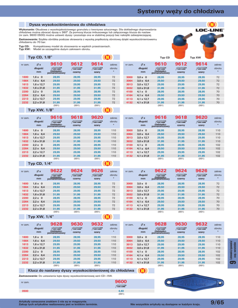 Systemy węży do chłodziwa Dysza wysokociśnieniowa do chłodziwa Wykonanie: Obudowa z wysokojakościowego granulatu z tworzywa sztucznego. Dla dokładnego doprowadznia chłodziwa można obracać dyszę o 360°. Za pomocą klucza imbusowego lub załączonego klucza do nastaw (nr zam. 9600 0500) można ustawić dyszę i pozostaje ona w stabilnej pozycji bez nakrętki zabezpieczającej. Zastosowanie: Szybka obróbka podczas skrawania z wysoką prędkością obrotową dzięki wysokociśnieniowemu chłodzeniu do 70 bar. Typ CD: Typ XW: Kompaktoewy model do stosowania w wąskich przestrzeniach. Model ze szczególnie dużym zakresem obrotu. Typ CD, 1/8" nr zam. 1600 1664 1613 1632 2200 2264 2213 2232 Typ XW Typ CD x długość mm 9610 9612 9614 niebieskopomarańczowy czarny 1,6 x 0 1,6 x 6,4 1,6 x 12,7 1,6 x 31,8 2,2 x 0 2,2 x 6,4 2,2 x 12,7 2,2 x 31,8 28,95 29,50 29,95 31,95 28,95 29,50 29,95 31,95 (991) nr zam. szary zakres obrotu ° 28,95 29,50 29,95 31,95 28,95 29,50 29,95 31,95 28,95 29,50 29,95 31,95 28,95 29,50 29,95 31,95 72 72 72 72 72 72 72 72 3000 3064 3013 3032 4100 4164 4113 4132 (991) (991) x długość mm 9610 9612 9614 niebieskopomarańczowy czarny szary zakres obrotu ° 3,0 x 0 3,0 x 6,4 3,0 x 12,7 3,0 x 31,8 4,1 x 0 4,1 x 6,4 4,1 x 12,7 4,1 x 31,8 28,95 29,50 29,95 31,95 28,95 29,50 29,95 31,95 28,95 29,50 29,95 31,95 28,95 29,50 29,95 31,95 28,95 29,50 29,95 31,95 28,95 29,50 29,95 31,95 72 72 72 72 70 70 70 70 (991) (991) (991) 9620 Typ XW, 1/8" nr zam. 1600 1664 1613 1632 2200 2264 2213 2232 x długość mm 9616 9618 9620 niebieskopomarańczowy czarny 1,6 x 0 1,6 x 6,4 1,6 x 12,7 1,6 x 31,8 2,2 x 0 2,2 x 6,4 2,2 x 12,7 2,2 x 31,8 28,95 29,50 29,95 31,95 28,95 29,50 29,95 31,95 nr zam. szary zakres obrotu ° 28,95 29,50 29,95 31,95 28,95 29,50 29,95 31,95 28,95 29,50 29,95 31,95 28,95 29,50 29,95 31,95 110 110 110 110 110 110 110 110 3000 3064 3013 3032 4100 4164 4113 4132 (991) (991) (991) x długość mm 9616 9618 niebieskopomarańczowy czarny szary zakres obrotu ° 3,0 x 0 3,0 x 6,4 3,0 x 12,7 3,0 x 31,8 4,1 x 0 4,1 x 6,4 4,1 x 12,7 4,1 x 31,8 28,95 29,50 29,95 31,95 28,95 29,50 29,95 31,95 28,95 29,50 29,95 31,95 28,95 29,50 29,95 31,95 28,95 29,50 29,95 31,95 28,95 29,50 29,95 31,95 110 110 110 110 102 102 102 102 (991) (991) (991) Typ CD, 1/4" nr zam. 1600 1664 1613 1632 2200 2264 2213 2232 x długość mm 9622 9624 9626 niebieskopomarańczowy czarny 1,6 x 0 1,6 x 6,4 1,6 x 12,7 1,6 x 31,8 2,2 x 0 2,2 x 6,4 2,2 x 12,7 2,2 x 31,8 28,95 29,50 29,95 31,95 28,95 29,50 29,95 31,95 (991) nr zam. szary zakres obrotu ° 28,95 29,50 29,95 31,95 28,95 29,50 29,95 31,95 28,95 29,50 29,95 31,95 28,95 29,50 29,95 31,95 72 72 72 72 72 72 72 72 3000 3064 3013 3032 4100 4164 4113 4132 (991) (991) x długość mm 9622 9624 9626 niebieskopomarańczowy czarny szary zakres obrotu ° 3,0 x 0 3,0 x 6,4 3,0 x 12,7 3,0 x 31,8 4,1 x 0 4,1 x 6,4 4,1 x 12,7 4,1 x 31,8 28,95 29,50 29,95 31,95 28,95 29,50 29,95 31,95 28,95 29,50 29,95 31,95 28,95 29,50 29,95 31,95 28,95 29,50 29,95 31,95 28,95 29,50 29,95 31,95 72 72 72 72 70 70 70 70 (991) (991) (991) 9632 1600 1664 1613 1632 2200 2264 2213 2232 x długość mm 9628 9630 9632 niebieskopomarańczowy czarny 1,6 x 0 1,6 x 6,4 1,6 x 12,7 1,6 x 31,8 2,2 x 0 2,2 x 6,4 2,2 x 12,7 2,2 x 31,8 28,95 29,50 29,95 31,95 28,95 29,50 29,95 31,95 (991) nr zam. szary zakres obrotu ° 28,95 29,50 29,95 31,95 28,95 29,50 29,95 31,95 28,95 29,50 29,95 31,95 28,95 29,50 29,95 31,95 110 110 110 110 110 110 110 110 3000 3064 3013 3032 4100 4164 4113 4132 (991) (991) x długość mm 9628 9630 niebieskopomarańczowy czarny szary zakres obrotu ° 3,0 x 0 3,0 x 6,4 3,0 x 12,7 3,0 x 31,8 4,1 x 0 4,1 x 6,4 4,1 x 12,7 4,1 x 31,8 28,95 29,50 29,95 31,95 28,95 29,50 29,95 31,95 28,95 29,50 29,95 31,95 28,95 29,50 29,95 31,95 28,95 29,50 29,95 31,95 28,95 29,50 29,95 31,95 110 110 110 110 102 102 102 102 (991) (991) (991) Klucz do nastawy dyszy wysokociśnieniowej do chłodziwa Zastosowanie: Do ustawiania kąta dyszy wysokociśnieniowej serii CD i XW. nr zam. 9600 0500 4,40 (991) Artykuły oznaczone znakiem ◊ nie są w magazynie. Zakup tych artykułów realizowany jest w krótkim terminie. Nie wszystkie artykuły są dostępne w każdym kraju. 9/65 9 nr zam. Lutowanie/spawanie/ zaop. warsztatów Typ XW, 1/4" Systemy węży do chłodziwa Zestaw węża do chłodziwa 1/4" Wykonanie: Zestaw gietkich węży z tworzywa do dostarczania cieczy chłodząco-smarującej do strefy skrawania. System kompatybilny z innymi systemami chłodzącymi. Zastosowanie: Do chłodzenia przedmiotów obrabianych na wszystkich obrabiarkach np. przy wierceniu, frezowaniu, kręceniu, szlifowaniu i erodowaniu. nr zam. wykonanie 9600 0002 8-części 16,55 zawartość zestawu 2 węże przegubowe, 147 mm 1 dysza płaska, szerokość 24 mm 3 dysza okrągła, ∅ 1,5; 3,0; 6,0 mm 2 łączniki gwintowane, R 1/8" i 1/4" (991) Zestaw węża do chłodzenia 1/4" Flexi Box Wykonanie: Zestaw gietkich węży z tworzywa do dostarczania cieczy chłodząco-smarującej do strefy skrawania. System kompatybilny z innymi systemami chłodzącymi. Dostawa w stabilnej walizce z tworzywa sztucznego. Zastosowanie: Do chłodzenia przedmiotów obrabianych na wszystkich obrabiarkach np. przy wierceniu, frezowaniu, kręceniu, szlifowaniu i erodowaniu. nr zam. wykonanie 9600 0004 27-części 86,21 zawartość zestawu 6 szt. 7-częściowych elementów węża po 105 mm 2 łączniki gwintowane NPT, 1/8" 2 łączniki gwintowane NPT, 1/4" 2 dysze okrągłe, ∅ 1,5 mm 2 dysze okrągłe, ∅ 3,0 mm 2 dysze okrągłe, ∅ 6,0 mm 1 dysza szerokostrumieniowa, 25 mm 1 dysza z 5 otworami, ∅ 1,5 mm 1 dysza z 7 otworami, ∅ 1,0 mm 1 dysza płaska, 12 x 1,0 mm 1 dysza płaska, 12 x 1,5 mm 1 dysza natryskowa z przegubem, 16 otworów ∅ 1,0 mm 1 pierścień zaciskowy ze śrubą 1 rozgałęźnik Y 1 zawór zwrotny, 1/4" 1 zawór odcinający z połączeniem segmetowym 1 kleszcze montażowe (991) Zestaw węży kabłąkowych 90° 1/4" Wykonanie: Sys