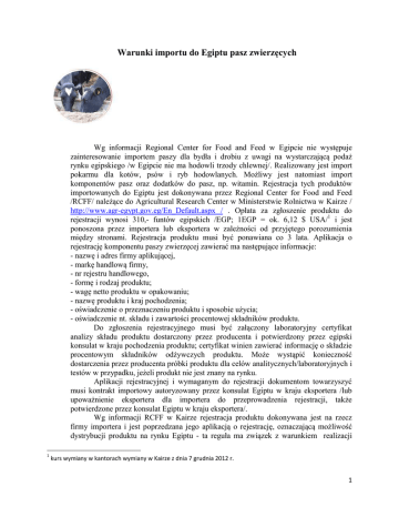 Warunki importu do Egiptu pasz zwierzęcych Wg informacji Regional Center for Food and Feed w Egipcie nie występuje zainteresowanie importem paszy dla bydła i drobiu z uwagi na wystarczającą podaż rynku egipskiego /w Egipcie nie ma hodowli trzody chlewnej/. Realizowany jest import pokarmu dla kotów, psów i ryb hodowlanych. Możliwy jest natomiast import komponentów pasz oraz dodatków do pasz, np. witamin. Rejestracja tych produktów importowanych do Egiptu jest dokonywana przez Regional Center for Food and Feed /RCFF/ należące do Agricultural Research Center w Ministerstwie Rolnictwa w Kairze / http://www.agr-egypt.gov.eg/En_Default.aspx / . Opłata za zgłoszenie produktu do rejestracji wynosi 310,- funtów egipskich /EGP; 1EGP = ok. 6,12 $ USA/1 i jest ponoszona przez importera lub eksportera w zależności od przyjętego porozumienia między stronami. Rejestracja produktu musi być ponawiana co 3 lata. Aplikacja o rejestrację komponentu paszy zwierzęcej zawierać ma następujące informacje: - nazwę i adres firmy aplikującej, - markę handlową firmy, - nr rejestru handlowego, - formę i rodzaj produktu; - wagę netto produktu w opakowaniu; - nazwę produktu i kraj pochodzenia; - oświadczenie o przeznaczeniu produktu i sposobie użycia; - oświadczenie nt. składu i zawartości procentowej składników produktu. Do zgłoszenia rejestracyjnego musi być załączony laboratoryjny certyfikat analizy składu produktu dostarczony przez producenta i potwierdzony przez egipski konsulat w kraju pochodzenia produktu; certyfikat winien zawierać informację o składzie procentowym składników odżywczych produktu. Może wystąpić konieczność dostarczenia przez producenta próbki produktu dla celów analitycznych/laboratoryjnych i testów w przypadku, jeżeli produkt nie jest znany na rynku. Aplikacji rejestracyjnej i wymaganym do rejestracji dokumentom towarzyszyć musi kontrakt importowy autoryzowany przez konsulat Egiptu w kraju eksportera /lub upoważnienie eksportera dla importera do przeprowadzenia rejestracji, także potwierdzone przez konsulat Egiptu w kraju eksportera/. Wg informacji RCFF w Kairze rejestracja produktu dokonywana jest na rzecz firmy importera i jest poprzedzana jego aplikacją o rejestrację, oznaczającą możliwość dystrybucji produktu na rynku Egiptu - ta reguła ma związek z warunkiem realizacji 1 kurs wymiany w kantorach wymiany w Kairze z dnia 7 grudnia 2012 r. 1 importu towarowego do Egiptu. Oznacza to, że w przypadku zmiany importera rejestracja produktu musi być przeprowadzona ponownie. Opracowanie: Tomasz Przygoda I-szy Sekretarz 2