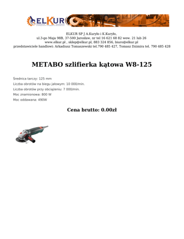ELKUR SP J A.Kuryło i K.Kuryło, ul.3-go Maja 98B, 37-500 Jarosław, nr tel 16 621 68 82 wew. 21 lub 26 www.elkur.pl , [email protected], 883 324 856, [email protected] przedstawiciele handlowi: Arkadiusz Tomaszewski tel.790 485 427, Tomasz Dzimira tel. 790 485 428 METABO szlifierka kątowa W8-125 Średnica tarczy: 125 mm Liczba obrotów na biegu jałowym: 10 000/min. Liczba obrotów przy obciążeniu: 7 000/min. Moc znamionowa: 800 W Moc oddawana: 490W Cena brutto: 0.00zł
