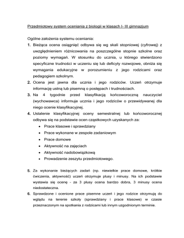 Przedmiotowy system oceniania z biologii w klasach I- III gimnazjum Ogólne założenia systemu oceniania: 1. Bieżąca ocena osiągnięć odbywa się wg skali stopniowej (cyfrowej) z uwzględnieniem różnicowania na poszczególne stopnie szkolne oraz poziomy wymagań. W stosunku do ucznia, u którego stwierdzono specyficzne trudności w uczeniu się lub deficyty rozwojowe, obniża się wymagania edukacyjne w porozumieniu z jego rodzicami oraz pedagogiem szkolnym. 2. Ocena jest jawna dla ucznia i jego rodziców. Uczeń otrzymuje informację ustną lub pisemną o postępach i trudnościach. 3. Na 4 tygodnie przed klasyfikacją końcoworoczną nauczyciel (wychowawca) informuje ucznia i jego rodziców o przewidywanej dla niego ocenie klasyfikacyjnej. 4. Ustalenie klasyfikacyjnej oceny semestralnej lub końcoworocznej odbywa się na podstawie ocen cząstkowych uzyskanych za: Prace klasowe i sprawdziany Prace wykonane w zespole zadaniowym Prace domowe Aktywność na zajęciach Aktywność nadobowiązkową Prowadzenie zeszytu przedmiotowego. 5. Za wykonanie bieżących zadań (np. niewielkie prace domowe, krótkie ćwiczenia, aktywność) uczeń otrzymuje plusy i minusy. Na ich podstawie wystawia się ocenę – za 3 plusy ocena bardzo dobra, 3 minusy ocena niedostateczna. 6. Sprawdzone i ocenione prace pisemne uczeń i jego rodzice otrzymują do wglądu na terenie szkoły (sprawdziany i prace klasowe) w czasie przeznaczonym na spotkania z rodzicami lub innym uzgodnionym terminie. 7. Uczeń może 2 razy w semestrze zgłosić nieprzygotowanie do zajęć bez żadnych konsekwencji. 8. Informacje o terminie, formie i zakresie planowanych sprawdzianów i testów podawane są z tygodniowym wyprzedzeniem (dokonuje się wpisu do dziennika lekcyjnego). 9. Jeżeli uczeń z przyczyn losowych nie może napisać sprawdzianu w ustalonym wcześniej terminie, ma obowiązek uczynić to na najbliższej kolejnej lekcji. 10. Uczeń ma prawo poprawić niekorzystną ocenę ze sprawdzianu w tylko wyznaczonym przez nauczyciela terminie. Ocena z poprawy jest ostateczna i zostaje wpisana obok oceny pierwotnej. Uczeń pisze poprawę tylko jeden raz. 11. Przełożenie sprawdzianu na prośbę uczniów nie powoduje zmiany terminu sprawdzianów z innych przedmiotów wcześniej na ten dzień zapowiedzianych. 12. Kartkówki obejmują najwyżej 3 poprzednie lekcje i nie muszą być zapowiedziane. Ocena z kartkówki nie podlega poprawie. 13. Uczeń otrzymuje punkty dodatnie (plusy) oraz ujemne (minusy), które może uzyskać za różnorakie prace: niewielkie prace domowe, pojedyncze ćwiczenia, aktywność obowiązkową i nadobowiązkową, brak zeszytu przedmiotowego lub zeszytu ćwiczeń. 14. Prowadzenie zeszytu przedmiotowego jest obowiązkowe i podlega bieżącej kontroli. Ocena końcowa nie jest średnią ocen uzyskanych z różnych form sprawdzania osiągnięć ucznia. Oceny uzyskane ze sprawdzianów, kartkówek i odpowiedzi ustnych są cenione wyżej niż inne uzyskiwane stopnie. Poziom twórczy: na ocenę celującą uczeń 1. krytycznie analizuje wybraną informację dotyczącą biologii pochodzącą z prasy kolorowej 2. rozpoznaje struktury komórkowe, obserwując nieomawiane wcześniej komórki 3. formułuje argumenty uzasadniające jedność organizmów 4. planuje i przeprowadza doświadczenie potwierdzające znaczenie bakterii, glonów lub grzybów w środowisku 5. projektuje oraz prowadzi obserwacje i doświadczenia ilustrujące wpływ warunków życia na rozwój rośliny, prowadzi ich dokumentację 6. posługuje się modelami do objaśniania procesów osmozy i dyfuzji zachodzących w roślinie 7. ocenia skutki kolonizacji nowych środowisk przez rośliny 8. rozpoznaje przedstawicieli wybranych roślin okrytonasiennych Anna Zdziennicka PROGRAM NAUCZANIA BIOLOGII W GIMNAZJUM „PULS ŻYCIA” SPIS TREŚCI Wstęp I. Zapisy w podstawie programowej kształcenia ogólnego 1. Cele kształcenia ogólnego 2. Najważniejsze umiejętności zdobywane przez ucznia 3. Zadania szkoły II. Zapisy w podstawie programowej dotyczące kształcenia biologicznego 1. Cele kształcenia – wymagania ogólne 2. Treści nauczania – wymagania szczegółowe 3. Zalecane doświadczenia i obserwacje III. Charakterystyka programu IV. Uwagi o wariantach realizacji programu V. Cele szczegółowe, materiał nauczania, proponowane procedury osiągania celów, środki dydaktyczne VI. Oczekiwane osiągnięcia ucznia VII. Procedury osiągania celów VIII. Metody oceny osiągnięć ucznia WSTĘP Celem edukacji w gimnazjum jest przygotowanie uczniów do funkcjonowania w warunkach współczesnego świata, wzbogacenie oraz ugruntowanie ich wiedzy i umiejętności nabytych w trakcie wcześniejszej nauki w szkole podstawowej. Niezwykle ważne jest też integrowanie zdobywanej wiedzy z zasadami zrównoważonego rozwoju w skali lokalnej, regionalnej i globalnej oraz przygotowanie uczniów do dalszych etapów kształcenia. Prezentowany program jest zgodny z rozporządzeniem Ministra Edukacji Narodowej z dnia 23 grudnia 2008 roku Dz U nr 4 poz. 18 w sprawie podstawy programowej wychowania przedszkolnego oraz kształcenia ogólnego w poszczególnych typach szkół (załącznik nr 4). Koncepcja programu powstała na bazie najnowszych osiągnięć z takich dziedzin, jak dydaktyka biologii, pedagogika i psychologia. Założeniem tego programu jest zachęcenie nauczycieli do stwarzania takich sytuacji dydaktycznych, w których uczeń sam podejmie inicjatywę odkrywania porządku i harmonii w środowisku życia, zrozumie nierozłączność wszystkich jego elementów, wzajemnych zależności, znajdzie w nim swoje miejsce i poczuje odpowiedzialność za jego stan oraz przyszłość. Zakłada się też, że uczeń pozna zasady funkcjonowania organizmów roślinnych i zwierzęcych oraz zależności zachodzące pomiędzy nimi a środowiskiem ich życia. W programie szczególny nacisk położono na zagadnienia związane z ochroną środowiska. W realizacji założeń prog