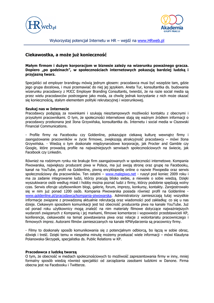 Wykorzystaj potencjał Internetu w HR – wejdź na www.HRweb.pl Ciekawostka, a moŜe juŜ konieczność Małym firmom i duŜym korporacjom w biznesie zaleŜy na wizerunku powaŜnego gracza. Dopiero „po godzinach”, w społecznościach internetowych pokazują bardziej ludzką i przyjazną twarz. Specjaliści od employer brandingu mówią jednym głosem: pracodawca musi być wszędzie tam, gdzie jego grupa docelowa, i musi przemawiać do niej jej językiem. Aneta Tur, konsultantka ds. budowania wizerunku pracodawcy z MJCC Employer Branding Consultants, twierdzi, Ŝe na razie social media są przez wielu pracodawców postrzegane jako moda, za chwilę jednak korzystanie z nich moŜe okazać się koniecznością, stałym elementem polityki rekrutacyjnej i wizerunkowej. Szukaj nas w Internecie Pracodawcy podąŜają za nowinkami i szukają niesztampowych moŜliwości kontaktu z obecnymi i przyszłymi pracownikami. O tym, Ŝe społeczności internetowe stają się waŜnym źródłem informacji o pracodawcy przekonana jest Ilona Grzywińska, konsultantka ds. Internetu i social media w Ciszewski Financial Communications. - Profile firmy na Facebooku czy Goldenline, pokazujące ciekawą kulturę wewnątrz firmy i zaangaŜowanie pracowników w Ŝycie firmowe, zwiększają atrakcyjność pracodawcy – mówi Ilona Grzywińska. - Wiedzą o tym doskonale międzynarodowe korporacje, jak Procter and Gamble czy Google, które prowadzą profile na najwaŜniejszych serwisach społecznościowych na świecie, jak Facebook czy Linkedin. RównieŜ na rodzimym rynku nie brakuje firm zaangaŜowanych w społeczności internetowe. Kompania Piwowarska, największy producent piwa w Polsce, ma juŜ swoją stronę oraz grupę na Facebooku, kanał na YouTube, profil na Goldenline, piwną encyklopedię online o nazwie Piwopedia oraz serwis społecznościowy dla pracowników. Ten ostatni – www.malepiwo.net - ruszył pod koniec 2009 roku i ma za zadanie integrowanie ludzi, którzy pracują blisko siebie, a niewiele o sobie wiedzą. Dzięki wyszukiwarce osób według miast i hobby moŜna poznać ludzi z firmy, którzy podobnie spędzają wolny czas. Serwis oferuje uŜytkownikom blogi, galerie, forum, imprezy, konkursy, kontakty. Zarejestrowało się w nim juŜ ponad 1200 osób. Kompania Piwowarska posiada równieŜ profil na Goldenline www.goldenline.pl/pracodawca/kompania-piwowarska. Administratorzy zamieszczają tutaj wszystkie informacje związane z prowadzoną aktualnie rekrutacją oraz wiadomości pod zakładką: co się u nas dzieje. Ciekawym sposobem komunikacji jest teŜ obecność producenta piwa na kanale YouTube. JuŜ od ponad roku uŜytkownicy mogą znaleźć na nim materiały filmowe dotyczące najwaŜniejszych wydarzeń związanych z Kompanią i jej markami, filmowe komentarze i wypowiedzi przedstawicieli KP, konferencje, ciekawostki na temat powstawiania piwa oraz relacje z wolontariatu pracowniczego i firmowych imprez. Autorami filmów zamieszczanych na kanale KPWydarzenia są pracownicy firmy. - Filmy to doskonały sposób komunikowania się z potencjalnym odbiorcą, bo łączą w sobie obraz, dźwięk i treść. Dzięki temu w niespełna minutę moŜemy przekazać wiele informacji – mówi Klaudyna Polanowska-Skrzypek, specjalistka ds. Public Relations w KP. Pracodawca z ludzką twarzą O tym, Ŝe obecność w mediach społecznościowych to moŜliwość zaprezentowania firmy w inny, mniej formalny sposób wiedzą równieŜ specjaliści od zarządzania zasobami ludzkimi w Danone. Firma obecna jest na Facebooku i Twitterze. Wykorzystaj potencjał Internetu w HR – wejdź na www.HRweb.pl - Dobry profil pozwala kandydatom niejako zajrzeć do środka firmy – decyzję o wyborze portali społecznościowych do komunikacji z obecnymi i przyszłymi pracownikami tłumaczy Katarzyna ZadroŜna z Działu Zarządzania Zasobami Ludzkimi firmy Danone. - Chcąc przyciągnąć uwagę kandydatów, naleŜy pamiętać, Ŝeby informacje były interesujące i regularnie uzupełniane. Danone na swoim profilu na Facebooku umieszcza zdjęcia z pikników rodzinnych firmy, dni integracyjnych praktykantów, z targów pracy. Wchodząc na http://www.facebook.com/PracawDanone moŜna obejrzeć filmy (a wśród nich przygody Małego Głoda), relacje z tego, co się dzieje w firmie, informacje o nagrodach dla Danone. - Stworzyliśmy teŜ kalendarium dla osób, które chcą się z nami spotkać na targach pracy. Umieszczamy w nim równieŜ daty wydarzeń firmowych (pikników, rozgrywek piłkarskich, dni integracyjnych) – mówi Katarzyna ZadroŜna. - Danone obecny jest takŜe na Twitterze. Ten mikroblog pozwolił nam na przeprowadzenie relacji z targów pracy i dotarcie do tych wszystkich, którzy na targach nie mogli się pojawić. Komunikacja przemyślana i systematyczna Co zamieszczać na swoim profilu i jak nim moderować, Ŝeby wzbudzić zainteresowanie wśród uŜytkowników portali społecznościowych i zyskać jak najwięcej fanów? Nie wystarczy załoŜyć profil i od czasu do czasu wrzucić temat do dyskusji. Budowanie społeczności internetowej wokół firmy to cięŜka, ale przede wszystkim systematyczna praca. - Chcąc zadbać o regularność naszych postów, korzystamy z usług agencji zewnętrznej, która wspiera nas w aktualizowaniu profilu – kulisy funkcjonowania Danone wśród społeczności internetowej zdradza Katarzyna ZadroŜna. - To rozwiązanie gwarantuje, Ŝe kandydaci zawsze znajdą na naszych profilach aktualne informacje. Według Anety Tur, decyzja o tym, kto będzie odpowiedzialny za koordynację działań w social media jest kluczowa i musi zapaść jeszcze przed wkroczeniem pracodawcy w ten obszar. - Powinna to być osoba obdarzona lekkim piórem. Naturalnymi kandydatami są pracownicy zajmujący się w firmie employer brandingiem, komunikacją wewnętrzną lub PR-em - mają duŜą wiedzę o firmie i polityce komunikacji – wylicza Aneta Tur. - Warto takŜe rozwaŜyć, czy nie powinna to być wi