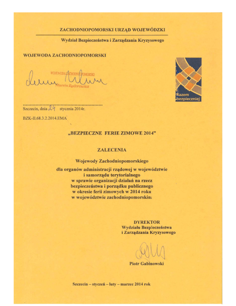 Ferie zimowe, które w województwie zachodniopomorskim przypadają w terminie od 17 lutego do 02 marca 2014 r., będą czasem zwiększonego ruchu turystycznego, zwłaszcza dzieci i młodzieży uczestniczącej w różnych formach zorganizowanego wypoczynku zarówno na obszarze kraju, województwa oraz za granicą. Okres ten, corocznie powoduje zmiany w zakresie stanu zagrożeń przestępczością i patologiami społecznymi, szczególnie w odniesieniu do dzieci i młodzieży oraz występowanie zdarzeń specyficznych dla okresu zimowego, które będą mieć bezpośredni wpływ na stan bezpieczeństwa i porządku publicznego dla wypoczywającej młodzieży szkolnej, jak i osób przebywających w województwie zachodniopomorskim. Ograniczenie skali tych zagrożeń i zapewnienie właściwego poziomu bezpieczeństwa dla dzieci i młodzieży korzystającej z ferii zimowych, jak i przyjeżdżającej na wypoczynek do naszego województwa, to zasadnicze zadanie w tym okresie dla organów administracji rządowej w województwie i samorządu terytorialnego, odpowiedzialnych za bezpieczeństwo i porządek publiczny. Mając na uwadze bezpieczeństwo podczas ferii zimowych, należy pamiętać również o bezpieczeństwie dzieci i młodzieży pozostającej w miejscach swego zamieszkania, zapewniając im szczególną ochronę oraz zaoferować atrakcyjne formy oraz sposoby spędzania czasu wolnego. Realizacji tych zadań powinny towarzyszyć konsekwentne działania przedstawicieli wszystkich organów administracji rządowej w województwie oraz samorządu terytorialnego. Bezpieczny okres ferii zimowych, to także realizacja wspólnych inicjatyw z podmiotami pozarządowymi oraz innymi instytucjami organizującymi wypoczynek dla dzieci i młodzieży. Tylko takie, kompleksowe działania zagwarantują pełne bezpieczeństwo i pozwolą zapobiec niepożądanym zjawiskom w miejscach licznie odwiedzanych przez dzieci i młodzież. 1. Na podstawie prowadzonych analiz dotyczących stanu bezpieczeństwa i porządku publicznego w województwie zachodniopomorskim, stwierdza się, że w okresie zimowym do głównych przyczyn powstawania zagrożeń dla bezpieczeństwa i porządku oraz życia i zdrowia należą: − wypadki drogowe w trakcie dojazdu (powrotu) do (z) miejsc wypoczynku, które powstają najczęściej w wyniku nie dostosowania prędkości jazdy do zimowych i często zmieniających się warunków pogodowych i drogowych, − drobna przestępczość: kradzieże, włamania, bójki, która popełniana jest często przez osoby będące pod wpływem alkoholu lub środków odurzających, − brak dbałości o zachowanie odpowiednich zasad higieny, szczególnie w zakresie zbiorowego żywienia, − niefrasobliwość dorosłych, jak również dzieci i młodzieży w zakresie korzystania z walorów zimy podczas wypoczynku, w tym szczególnie zabaw na zamarzniętych naturalnych zbiornikach wodnych. Organizując i przygotowując tegoroczne przedsięwzięcia, należy przyjąć że powinny one być realizowane w obszarach najbardziej zagrożonych tj.: a) na drogach oraz w komunikacji kolejowej, ze szczególnym uwzględnieniem tras wiodących do najczęściej uczęszczanych rejonów województwa, b) w miejscach zorganizowanego wypoczynku dzieci i młodzieży, c) w miejscach publicznych oraz miejscu zamieszkania. 2. Planowane i realizowane działania w zakresie zapewnienia bezpieczeństwa w okresie ferii zimowych, powinny przyczynić się do osiągnięcia następujących celów: − stworzenia właściwych warunków do bezpiecznego pobytu i wypoczynku dzieci i młodzieży oraz osób przebywających w naszym województwie, − zapewnienie bezpieczeństwa i porządku publicznego wszystkim mieszkańcom województwa w okresie trwania całego sezonu zimowego, − ograniczenia ilości występowania czynów przestępczych oraz zjawisk patologii społecznych, szczególnie dokonywanych wobec osób nieletnich. 3. Kierunkowe działania w ramach zapewnienia bezpieczeństwa i porządku publicznego powinny obejmować: 2 a) na drogach: − kompleksową kontrolę przestrzegania przepisów ruchu drogowego, w tym szczególnie w zakresie przestrzegania prędkości jazdy, trzeźwości kierowców, używania pasów bezpieczeństwa, bezpiecznego przewozu dzieci, − daleko idącą pomoc i ułatwienia młodzieży i dzieciom podróżującym autokarami turystycznymi, − stały monitoring zimowej przejezdności dróg samochodowych, − przygotowanie i prowadzenie szerokiej i wszechstronnej działalności informacyjnej i edukacyjnej w zakresie bezpiecznego poruszania się po drogach, − podejmowane działania winny być koordynowane w ramach terytorialnej odpowiedzialności przez Komendanta Wojewódzkiego Policji w Szczecinie, przy współudziale Wojewódzkiego Inspektora Transportu Drogowego, Straży Granicznej, Żandarmerii Wojskowej oraz służb i instytucji odpowiedzialnych za stan techniczny dróg oraz ich zimowe utrzymanie, − przygotowanie i utrzymanie w gotowości interwencyjnej sił i środków ratownictwa drogowego, − przygotowanie i utrzymanie w gotowości do użycia sił i środków państwowego ratownictwa medycznego; b) w miejscach wypoczynku: − szeroko zakrojoną prewencję i prowadzenie działań zmierzających do rozpoznawania źródeł przestępczości oraz minimalizacji zagrożeń i walki ze sprawcami przestępstw, jak również zachowań patologicznych i kryminogennych, głównie wśród nieletnich, − nadzór nad bezpiecznym funkcjonowaniem infrastruktury wypoczynkowo - rekreacyjnej i właściwym wypełnianiem obowiązków przez osoby ją obsługujące, − nadzór nad funkcjonowaniem miejsc rozrywki i bezpiecznym przebiegiem organizowanych imprez masowych, rozrywkowych, sportowych itp., − propagowanie i egzekwowanie bezpiecznych zachowań wśród uczestników wypoczynku, − kontrolę przygotowania organizatorów wypoczynku dla dzieci i młodzieży przed rozpoczęciem ferii pod względem: dopełnienia obowiązku rejestrac
