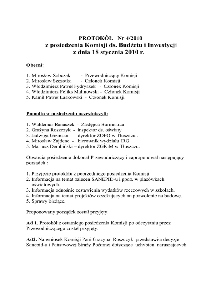 PROTOKÓŁ Nr 4/2010 z posiedzenia Komisji ds. Budżetu i Inwestycji z dnia 18 stycznia 2010 r. Obecni: 1. Mirosław Sobczak - Przewodniczący Komisji 2. Mirosław Szczotka - Członek Komisji 3. Włodzimierz Paweł Fydryszek - Członek Komisji 4. Włodzimierz Feliks Malinowski - Członek Komisji 5. Kamil Paweł Laskowski - Członek Komisji Ponadto w posiedzeniu uczestniczyli: 1. Waldemar Banaszek - Zastępca Burmistrza 2. Grażyna Roszczyk - inspektor ds. oświaty 3. Jadwiga Gizińska - dyrektor ZOPO w Tłuszczu . 4. Mirosław Zajdenc - kierownik wydziału IRG 5. Mariusz Dembiński – dyrektor ZGKiM w Tłuszczu. Otwarcia posiedzenia dokonał Przewodniczący i zaproponował następujący porządek : 1. Przyjęcie protokółu z poprzedniego posiedzenia Komisji. 2. Informacja na temat zaleceń SANEPID-u i ppoż. w placówkach oświatowych. 3. Informacja odnośnie zestawienia wydatków rzeczowych w szkołach. 4. Informacja na temat projektów oczekujących na pozwolenie na budowę. 5. Sprawy bieżące. Proponowany porządek został przyjęty. Ad 1. Protokół z ostatniego posiedzenia Komisji po odczytaniu przez Przewodniczącego został przyjęty. Ad2. Na wniosek Komisji Pani Grażyna Roszczyk przedstawiła decyzje Sanepid-u i Państwowej Straży Pożarnej dotyczące uchybień naruszających 2 przepisy przeciwpożarowe, które zostały opisane w protokóle czynności kontrolno-rozpoznawczych w następujących placówkach oświatowych. 1. Zespół Szkół w Jasienicy . Zalecenia zostały opisane w decyzji PZ.55809-25/2/2009 z dnia 04.03.2009 r , która stanowi załącznik Nr 1 do niniejszego protokółu. Przy omawianiu zaleceń i przeprowadzeniu dyskusji Komisja stwierdziła, że budynek szkoły jest tak stary, że aby dostosować go do wymogów, należałoby postawić nowy. W obecnej sytuacji, aby zrealizować zalecenia i zadbać o bezpieczeństwo dzieci, należy jednak znaleźć rozwiązanie. W związku z tym Komisja wnioskuje : o powołanie eksperta, który oceni stan klatki schodowej w budynku szkoły podstawowej w Jasienicy i wskaże zastępcze rozwiązanie odnośnie ewakuacji z I piętra. Podczas kontroli stwierdzono, że część budynku OSP w Jasienicy zaadoptowana na Przedszkole nie jest wyposażona w sieć wodociągową wewnętrzną, a zgodnie z Rozporządzeniem Ministra Spraw Wewnętrznych i Administracji z dnia 2 kwietnia 2006 r., budynki ze strefami zakwalifikowanymi do kategorii zagrożenia ludzi ZL II, jakim są Przedszkola o powierzchni przekraczającej 200m2 , należy wyposażać w hydranty wewnętrzne 25. Po przeprowadzonej dyskusji Komisja wnioskuje: o zamontowanie hydrantu wewnętrznego 25 w budynku Przedszkola Samorządowego w Jasienicy, zgodnie z powyższą decyzją. 2. Przedszkole Samorządowe „Baśniowa Kraina” w Tłuszczu. Zalecenia opisane w decyzji PZ5580-9-8/32009 z dnia 27.022009 r. stanowią załącznik Nr 2 do niniejszego protokółu. Nie wykonano tylko jednego zalecenia tj. wyposażyć sale zajęć oraz korytarze w autonomiczne czujki dymu. W związku z powyższym, Komisja wnioskuje: o zobowiązanie Pani Dyrektor Przedszkola Samorządowego do zrealizowania zaleceń ppoż. odnośnie wyposażenia sal zajęć oraz korytarzy w automatyczne czujki dymu. 3. Szkoła Podstawowa im. J. Pawła II w Tłuszczu. Zalecenia opisane w decyzji PPIS/HDIM/065/6304/3/09 z dnia 24.11.2009 r. stanowią załącznik nr 3 do niniejszego protokółu. Zalecenia należało wykonać do dnia 31.08.2010 r, ale na skutek podania wniesionego przez Pana Dyrektora Szkoły Podstawowej w Tłuszczu z dnia 3 12.08.2010 r. o przedłużenie terminu wykonania zaleceń z powodu dużych kosztów nakładczych, Państwowy Powiatowy Inspektor Sanitarny w Wołominie zmienił powyższą decyzję w części punktu 1-2 i przedłużył termin wykonania obowiązku do dnia 27.02.2011 r . nadając znak sprawy : HDiM6304/2/2010 z dnia 25.08.2010 r. Pismo stanowi załącznik Nr 4 do niniejszego protokółu. Komisja zobowiązała Panią inspektor Grażynę Roszczyk do zaproszenia dyrektora szkoły podstawowej w Tłuszczu na następne posiedzenie Komisji celem wyjaśnienia, dlaczego 2 zalecenia nie zostały zrealizowane i o wystosowanie przez dyrektora szkoły w trybie pilnym pisma do Państwowego Powiatowego Inspektora Sanitarnego o przedłużenie terminu realizacji tych zaleceń do 20 sierpnia 2011 r. Ad3. Pani Jadwiga Gizińska przedstawiła planowane wydatki rzeczowe na 2011 r. w poszczególnych placówkach oświatowych zgodnie z załącznikiem Nr 5 do niniejszego protokółu. Komisja po przeanalizowaniu i przedyskutowaniu planu wydatków rzeczowych w placówkach oświatowych ,zwróciła się do Pani Jadwigi Gizińskiej, dyrektora ZOPO, aby zobowiązała dyrektorów szkół do przedstawienia Komisji – zakresu obowiązków konserwatorów zatrudnionych w szkołach. Komisja wnioskuje także o dostarczenie informacji odnośnie rozpisania dochodów z wynajmu i dzierżaw lokali w szkołach. Ad4. Zaproszony na posiedzenie Komisji Pan Mirosław Zajdenc przedstawił listę projektów oczekujących na pozwolenie na budowę, która stanowi załącznik Nr 6 do niniejszego protokółu. Komisja zwróciła się z wnioskiem do Pana Mirosława Zajdenca o uaktualnienie projektu „ budowa zaplecza i szatni w szkole w Stryjkach”, którego termin ważności upływa 18.07.2011 r. Radny Włodzimierz Malinowski poinformował, że przy ulicy Słowackiego 3 w Tłuszczu znajduje się budynek, który prawdopodobnie jest własnością gminy i należałoby zlecić ekspertyzę tego budynku, celem rozważenia możliwości zaadoptowania go na cele oświatowe. 4 Pan Mirosław Zajdenc odpowiedział, ze zanim zleci się wykonanie ekspertyzy budynku, należy : 1. stwierdzić stan techniczny budynku, 2. jakie będą koszty związane z zaadoptowaniem budynku na powyższy cel, 3. jaki jest stan prawny budynku. Budynek ten miał przejść na własność gminy, w wyniku toczącego się postępowania sądowego w sprawie stwierdzenia nabycia spadku