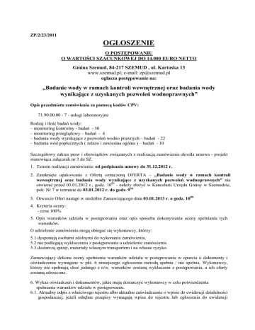 ZP/2/23/2011 OGŁOSZENIE O POSTĘPOWANIU O WARTOŚCI SZACUNKOWEJ DO 14.000 EURO NETTO Gmina Szemud, 84-217 SZEMUD , ul. Kartuska 13 www.szemud.pl; e-mail: [email protected] ogłasza postępowanie na: „Badanie wody w ramach kontroli wewnętrznej oraz badania wody wynikające z uzyskanych pozwoleń wodnoprawnych” Opis przedmiotu zamówienia za pomocą kodów CPV: 71.90.00.00 - 7 - usługi laboratoryjne Rodzaj i ilość badań wody: – monitoring kontrolny - badań - 30 – monitoring przeglądowy – badań - 4 – badania wody wynikające z pozwoleń wodno prawnych – badań - 22 – badania wód popłucznych ( Ŝelazo i zawiesina ogólna ) – badań - 10 Szczegółowy zakres praw i obowiązków związanych z realizacją zamówienia określa umowa - projekt stanowiąca załącznik nr 3 do SZ. 1. Termin realizacji zamówienia: od podpisania umowy do 31.12.2012 r. 2. Zamknięte opakowanie z Ofertą oznaczoną OFERTA – „Badanie wody w ramach kontroli wewnętrznej oraz badania wody wynikające z uzyskanych pozwoleń wodnoprawnych” nie otwierać przed 03.01.2012 r., godz. 1000 - naleŜy złoŜyć w Kancelarii Urzędu Gminy w Szemudzie, pok. Nr 7 w terminie do 03.01.2012 r. do godz. 930 3. Otwarcie Ofert nastąpi w siedzibie Zamawiającego dnia 03.01.2013 r. o godz. 1000. 4. Kryteria oceny: - cena 100% 5. Opis warunków udziału w postępowaniu oraz opis sposobu dokonywania oceny spełniania tych warunków. O udzielenie zamówienia mogą ubiegać się wykonawcy, którzy: 5.1 dysponują osobami zdolnymi do wykonania zamówienia, 5.2 nie podlegają wykluczeniu z postępowania o udzielenie zamówienia. 5.3.dostarczą sprzęt, materiały własnym transportem i na własne ryzyko. Zamawiający dokona oceny spełnienia warunków udziału w postępowaniu w oparciu o dokumenty i oświadczenia wymagane w pkt. 6 niniejszego ogłoszenia metodą spełnia / nie spełnia. Wykonawcy, którzy nie spełniają choć jednego z n/w. warunków zostaną wykluczeni z postępowania, a ich oferty zostaną odrzucone. 6. Wykaz oświadczeń i dokumentów, jakie mają dostarczyć wykonawcy w celu potwierdzenia spełniania warunków udziału w postępowaniu. 6.1. Aktualny odpis z właściwego rejestru albo aktualne zaświadczenie o wpisie do ewidencji działalności gospodarczej, jeŜeli odrębne przepisy wymagają wpisu do rejestru lub zgłoszenia do ewidencji działalności gospodarczej, wystawiony nie wcześniej niŜ 6 miesięcy przed upływem terminu składania ofert. 6.2 Wykaz wykonanych, a w przypadku świadczeń okresowych lub ciągłych równieŜ wykonywanych, usług w zakresie niezbędnym do wykazania spieniania warunku wiedzy i do świadczenia w okresie ostatnich trzech lat przed upływem terminu składania ofert albo wniosków o dopuszczenie do udziału w postępowaniu, a jeŜeli okres prowadzenia działalności jest krótszy w tym okresie, z podaniem ich wartości, przedmiotu, dat wykonania i odbiorców, oraz załączeniem dokumentu potwierdzającego, Ŝe te usługi zostały wykonane lub są wykonywane naleŜycie tj: - Wykonawca jest zobowiązany przedstawić (min 1 usługa polegająca na badaniu wody odpowiadającą przedmiotowi zamówienia o wartości nie niŜszej niŜ 30.000,00zł brutto w skali roku (zał. nr 4 do SZ). 6.3 Wypełniony załącznik nr 1, 2 i 4. 7. UpowaŜnionymi do kontaktów z Wykonawcami są pracownicy Urzędu Gminy Szemud: w sprawach dotyczących specyfikacji zamówienia i przedmiotu zamówienia - P. Ryszard Dampc i P. Marcin Machaliński pok. Nr 9 i 8, tel./fax: 58 676-44-28 8. Komplet dokumentów przetargowych moŜna odebrać bezpłatnie w pok. Nr 11 U.G. Szemud w godz. od 800 do 15 00 lub na stronie internetowej www.szemud.pl.