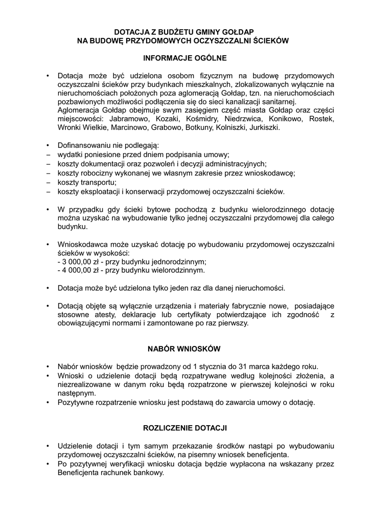 DOTACJA Z BUDŻETU GMINY GOŁDAP NA BUDOWĘ PRZYDOMOWYCH OCZYSZCZALNI ŚCIEKÓW INFORMACJE OGÓLNE • Dotacja może być udzielona osobom fizycznym na budowę przydomowych oczyszczalni ścieków przy budynkach mieszkalnych, zlokalizowanych wyłącznie na nieruchomościach położonych poza aglomeracją Gołdap, tzn. na nieruchomościach pozbawionych możliwości podłączenia się do sieci kanalizacji sanitarnej. Aglomeracja Gołdap obejmuje swym zasięgiem część miasta Gołdap oraz części miejscowości: Jabramowo, Kozaki, Kośmidry, Niedrzwica, Konikowo, Rostek, Wronki Wielkie, Marcinowo, Grabowo, Botkuny, Kolniszki, Jurkiszki. • – – – – – Dofinansowaniu nie podlegają: wydatki poniesione przed dniem podpisania umowy; koszty dokumentacji oraz pozwoleń i decyzji administracyjnych; koszty robocizny wykonanej we własnym zakresie przez wnioskodawcę; koszty transportu; koszty eksploatacji i konserwacji przydomowej oczyszczalni ścieków. • W przypadku gdy ścieki bytowe pochodzą z budynku wielorodzinnego dotację można uzyskać na wybudowanie tylko jednej oczyszczalni przydomowej dla całego budynku. • Wnioskodawca może uzyskać dotację po wybudowaniu przydomowej oczyszczalni ścieków w wysokości: - 3 000,00 zł - przy budynku jednorodzinnym; - 4 000,00 zł - przy budynku wielorodzinnym. • Dotacja może być udzielona tylko jeden raz dla danej nieruchomości. • Dotacją objęte są wyłącznie urządzenia i materiały fabrycznie nowe, posiadające stosowne atesty, deklaracje lub certyfikaty potwierdzające ich zgodność z obowiązującymi normami i zamontowane po raz pierwszy. NABÓR WNIOSKÓW • • • Nabór wniosków będzie prowadzony od 1 stycznia do 31 marca każdego roku. Wnioski o udzielenie dotacji będą rozpatrywane według kolejności złożenia, a niezrealizowane w danym roku będą rozpatrzone w pierwszej kolejności w roku następnym. Pozytywne rozpatrzenie wniosku jest podstawą do zawarcia umowy o dotację. ROZLICZENIE DOTACJI • • Udzielenie dotacji i tym samym przekazanie środków nastąpi po wybudowaniu przydomowej oczyszczalni ścieków, na pisemny wniosek beneficjenta. Po pozytywnej weryfikacji wniosku dotacja będzie wypłacona na wskazany przez Beneficjenta rachunek bankowy. JAK ZŁOŻYĆ WNIOSEK ? Przed złożeniem wniosku o dotację, przed złożeniem wniosku o dotację oraz przed przystąpieniem do realizacji inwestycji należy uzyskać w Starostwie Powiatowym w Gołdapi decyzję o pozwoleniu na budowę lub złożyć zgłoszenie zamiaru budowy przydomowej oczyszczalni ścieków. Wnioskodawca, przed przystąpieniem do realizacji inwestycji, składa w terminie od 1 stycznia do 31 marca każdego roku w Urzędzie Miejskim w Gołdapi w Punkcie Obsługi Mieszkańca pisemny wniosek wraz z następującymi dokumentami: 1) upoważnienie do zawarcia umowy o dotację udzielone wnioskodawcy przez wszystkich współwłaścicieli nieruchomości, 2) kopię ostatecznej decyzji o pozwoleniu na budowę lub zgłoszenia zamiaru budowy przydomowej oczyszczalni ścieków do Starosty Gołdapskiego wraz z oświadczeniem wnioskodawcy, że w terminie 30 dni od dnia zgłoszenia zamiaru wykonania robót budowlanych organ nie wniósł sprzeciwu. 3) oświadczenie, że wydatki na budowę przydomowej oczyszczalni ścieków nie zostały sfinansowane w całości lub części z udziałem środków publicznych. Druki wniosków i załączników dostępne są w Urzędzie Miejskim w Gołdapi w Punkcie Obsługi Mieszkańca oraz na stronie www.goldap.pl. Sprawy związane z dofinansowaniem budowy przydomowych oczyszczalni ścieków prowadzi inspektor Elżbieta Sakowicz - Wydział Gospodarki Przestrzennej Ochrony Środowiska i Nieruchomości Urzędu Miejskiego w Gołdapi, pok. 25, tel. 87 615 60 23.