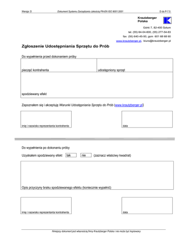 Wersja: D Dokument Systemu Zarządzania Jakością PN-EN ISO 9001:2001 D do P-7.5 Krautzberger Polska Górki 7, 82-400 Sztum tel. (55) 64-04-600, (55) 277-54-83 fax (55) 640-45-50, gsm 601 68 68 60 www.krautzberger.pl, [email protected] Zgłoszenie Udostępniania Sprzętu do Prób Do wypełnienia przed dokonaniem próby pieczęć kontrahenta udostępniony sprzęt spodziewany efekt Zapoznałem się i akceptuję Warunki Udostępniania Sprzętu do Prób (www.krautzberger.pl) imię i nazwisko reprezentanta kontrahenta data Do wypełnienia po dokonaniu próby Uzyskałem spodziewany efekt tak nie (zaznacz właściwy kwadrat) Opis przyczyny braku spodziewanego efektu (koniecznie wypełnić) imię i nazwisko reprezentanta kontrahenta data Niniejszy dokument jest własnością firmy Krautzberger Polska i nie może być kopiowany