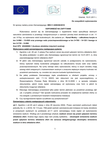 Gdańsk, 10.01.2011 r. Do wszystkich wykonawców Nr sprawy nadany przez Zamawiającego: MW.I1-3200/46/2010 ODPOWIEDŹ NA ZAPYTANIE Wykonawca zwrócił się do Zamawiającego o wyjaśnienie treści specyfikacji istotnych warunków zamówienia w przetargu nieograniczonym o wartości poniżej kwot określonych w art. 11 ust. 8 Pzp, na wykonanie robót budowlanych, dla zadania pn.: Kanał Modry – odbudowa koryta w km 3+860 – 13+920 oraz prawego wału przeciwpowodziowego w km 3+765 – 5+125 i lewego w km 3+735 – 5+060 Kod CPV 45240000-1 (budowa obiektów inżynierii wodnej) Wykonawca zadał zamawiającemu następujące pytania: 1. Zgodnie z art. 45 ust. 3 ustawy Pzp wadium wnosi się przed upływem terminu składania ofert. Na jakiej podstawie i w jakim celu Zamawiający ograniczył ten termin do 12.01.2011, tj. dnia poprzedzającego termin składania ofert? 2. W jakim celu Zamawiający ograniczył warunki udziału w postępowaniu do wykonawców, którzy wykonali roboty budowlane polegające na odbudowaniu koryta rzeki oraz wałów przeciwpowodziowych. Na rynku istnieje wielu wykonawców, którzy w swym dorobku mają szereg robót związanych z budownictwem wodnym o znacznie większym stopniu trudności niż przedmiot zamówienia, np. morskie lub rzeczne budowle hydrotechniczne. 3. Na jakiej podstawie Zamawiający żąda przedłożenia w ofertach projektu umowy z podwykonawcami (pkt. 7.1.14 SIWZ) taki dokument nie jest wyszczególniony w Rozporządzeniu Prezesa Rady Ministrów z dnia 30.12.2009 r. w sprawie rodzajów dokumentów, jakich może żądać zamawiający od wykonawcy oraz form w jakich te dokumenty mogą być składane. 4. Dlaczego Zamawiający przewidział tylko jeden termin płatności za przedmiot przetargu (§3 ust. 2 projektu umowy)? Taki sposób rozliczenia prowadzi do zwiększenia wartości oferty co ma związek z poniesionymi kosztami kredytowania inwestycji. 5. Czy wynagrodzenie będzie ryczałtowe czy powykonawcze? Zamawiający udziela następujących odpowiedzi: ad.1. Zgodnie z art.45 ust.2 ustawy z dnia 29 stycznia 2004r. Prawo zamówień publicznych (tekst jednolity Dz. U. z 2010r. Nr 113 poz. 759) jeżeli wartość zamówienia jest mniejsza niż kwoty określone w przepisach wydanych na podstawie art.11 ust.8, zamawiający może żądać od wykonawców wniesienia wadium. Według ust.3 powołanego artykułu wadium wnosi się przed upływem terminu składania ofert. Analiza tego zapisu daje nam prostą wykładnie, - obowiązek wniesienia wadium przed upływem terminu składania ofert nie oznacza obligatoryjnego obowiązku wniesienia wadium w dniu składania ofert. 1 Zamawiający może w SIWZ i ogłoszeniu wskazać konkretną datę oznaczoną co do dnia i godziny, do której nadejścia wykonawca będzie zobowiązany wnieść wadium. Zamawiający może także żądać od wykonawcy aby wraz z ofertą przedłożył dowód wniesienia wadium. Przepis ust.3 zezwala na wniesienie wadium wraz ze złożeniem oferty. Oznacza to, że czynności tych można dokonywać równocześnie. Istotne pozostaje, by wykonawca wniósł wadium przed terminem składania ofert (patrz: Prawo Zamówień Publicznych Komentarz pod redakcją Tomasza Czajkowskiego Jerzy Behr, Tomasz Czajkowski, Włodzimierz Dzierżanowski, Tomasz Kwieciński, Waldemar Łysakowski, wydanie trzecie, stan prawny na 1 styczeń 2008r.). Zgodnie z art.45 ust. 3 ustawy prawo zamówień publicznych nie jest dozwolone wnoszenie wadium po upływie terminu (godzinie) składania ofert. Dowodem wniesienia wadium nie może być dokument wykonania operacji bankowej – dyspozycji przelewu, lecz pokwitowanie przelewu tej kwoty przez bank Zamawiającego. W sytuacji, kiedy uznanie rachunku bankowego poprzez zaksięgowanie kwoty wadium nastąpiło po terminie (godzinie) otwarcia ofert należy uznać, iż wadium nie zostało wniesione, a zatem stosownie do postanowień art.24 ust.2 pkt 4 ustawy Prawo zamówień publicznych Zamawiający zobligowany jest do wykluczenia wykonawcy i odrzucenia oferty (Wyrok Zespołu Arbitrów z dnia 25 kwietnia 2007r. Sygn. akt UZP/ZO/0-462/07). Zamawiający, określając datę (godzinę) wniesienia wadium, brał pod uwagę m.in. powyższy wyrok oraz dotychczasową praktykę wnoszenia wadium. Niewątpliwie, sporny zapis zabezpiecza interesy wykonawców. Nie jest celem Zamawiającego doprowadzenie do sytuacji, w której musiałby wykluczać czy też odrzucać wykonawców z przedmiotowego postępowania. Wniesienie wadium ma na celu zabezpieczenie interesów zamawiającego na wypadek, gdyby wykonawca którego oferta została wybrana odmówił podpisania umowy na warunkach określonych w ofercie, nie wniósł wymaganego zabezpieczenia należytego wykonania umowy lub gdyby zawarcie umowy stało się niemożliwe z przyczyn leżących po stronie wykonawcy. Treść i formę wadium określa ustawa natomiast w SIWZ Zamawiający określa termin wniesienia wadium (Wyrok Zespołu Arbitrów z dnia 23 września 2004r. Sygn. akt UZP/ZO/0-1531/04). Termin składania ofert został określony na dzień 13.01.2011r. Wniesienie wadium zostało określone na dzień 12.01.2011r., czyli przed upływem terminu składania ofert. ad.2. Wymóg wykazania doświadczenia zawodowego polegającego na wykonywaniu robót związanych z odbudową koryt rzecznych i wałów przeciwpowodziowych stanowi dla Zamawiającego niezbędną informację, że Wykonawca, który złożył ofertę posiada niezbędne doświadczenie, które pozwoli mu na rzetelne wykonanie przedmiotu zamówienia. Skoro oczekujemy, że Wykonawca powinien udokumentować, że wykonywał roboty budowlane odpowiadające przedmiotowi zamówienia związane z odbudową koryt rzek i wałów przeciwpowodziowych, to uważamy, że inne prace hydrotechniczne nie odpowiadają temu przedmiotowi zamówienia. Zgodnie z wyrokiem Sądu Okręgowego w Białymstoku II Wydział Cywilny Odwoławczy z 28.02.2006 (sygn. akt II Ca 85/06) oczywistym jest, że określenie przedmiotu zamówienia w sposó