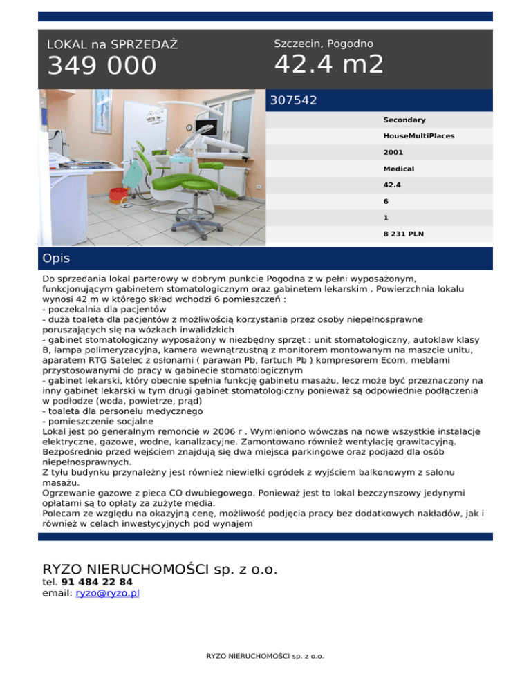 LOKAL na SPRZEDAŻ 349 000 Szczecin, Pogodno 42.4 m2 307542 Secondary HouseMultiPlaces 2001 Medical 42.4 6 1 8 231 PLN Opis Do sprzedania lokal parterowy w dobrym punkcie Pogodna z w pełni wyposażonym, funkcjonującym gabinetem stomatologicznym oraz gabinetem lekarskim . Powierzchnia lokalu wynosi 42 m w którego skład wchodzi 6 pomieszczeń : - poczekalnia dla pacjentów - duża toaleta dla pacjentów z możliwością korzystania przez osoby niepełnosprawne poruszających się na wózkach inwalidzkich - gabinet stomatologiczny wyposażony w niezbędny sprzęt : unit stomatologiczny, autoklaw klasy B, lampa polimeryzacyjna, kamera wewnątrzustną z monitorem montowanym na maszcie unitu, aparatem RTG Satelec z osłonami ( parawan Pb, fartuch Pb ) kompresorem Ecom, meblami przystosowanymi do pracy w gabinecie stomatologicznym - gabinet lekarski, który obecnie spełnia funkcję gabinetu masażu, lecz może być przeznaczony na inny gabinet lekarski w tym drugi gabinet stomatologiczny ponieważ są odpowiednie podłączenia w podłodze (woda, powietrze, prąd) - toaleta dla personelu medycznego - pomieszczenie socjalne Lokal jest po generalnym remoncie w 2006 r . Wymieniono wówczas na nowe wszystkie instalacje elektryczne, gazowe, wodne, kanalizacyjne. Zamontowano również wentylację grawitacyjną. Bezpośrednio przed wejściem znajdują się dwa miejsca parkingowe oraz podjazd dla osób niepełnosprawnych. Z tyłu budynku przynależny jest również niewielki ogródek z wyjściem balkonowym z salonu masażu. Ogrzewanie gazowe z pieca CO dwubiegowego. Ponieważ jest to lokal bezczynszowy jedynymi opłatami są to opłaty za zużyte media. Polecam ze względu na okazyjną cenę, możliwość podjęcia pracy bez dodatkowych nakładów, jak i również w celach inwestycyjnych pod wynajem RYZO NIERUCHOMOŚCI sp. z o.o. tel. 91 484 22 84 email: [email protected] RYZO NIERUCHOMOŚCI sp. z o.o. Powered by TCPDF (www.tcpdf.org)