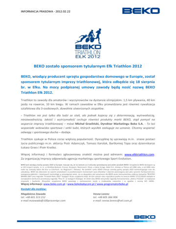 INFORMACJA PRASOWA - 2012.02.22 BEKO zostało sponsorem tytularnym Ełk Triathlon 2012 BEKO, wiodący producent sprzętu gospodarstwa domowego w Europie, został sponsorem tytularnym imprezy triathlonowej, która odbędzie się 18 sierpnia br. w Ełku. Na mocy podpisanej umowy zawody będą nosić nazwę BEKO Triathlon Ełk 2012. Triathlon to zawody dla amatorów i wyczynowców na dystansie olimpijskim: 1,5 km pływania, 40 km jazdy na rowerze, 10 km biegu. W ramach zawodów w Ełku przewidziana jest również rywalizacja sztafetowa dla 3-osobowych, dowolnie utworzonych zespołów. - Triathlon nie jest tylko dla ludzi ze stali, ale jednak kojarzy się z determinacją, wytrwałością, niezawodnością. Jakość i wytrzymałość cechuje również produkty marki BEKO, stąd pomysł na wsparcie imprezy triathlonowej – mówi Michał Grzeliński, Dyrektor Marketingu Beko S.A. - To też wspaniałe widowisko sportowe i setki ludzi, których wysiłek zasługuje na uznanie. Chcemy wspierać odwagę i sportowego ducha – dodaje. Triathlon zyskuje w Polsce coraz większą popularność. Dyscyplinę tę uprawiają m.in. znane postaci życia publicznego m.in. aktorzy Piotr Adamczyk, Tomasz Karolak, Bartłomiej Topa oraz dziennikarze Łukasz Grass i Piotr Kraśko. Więcej informacji i formularz zgłoszeniowy znaleźć można pod adresem: www.elktriathlon.com. Za organizację Imprezy odpowiada agencja marketingu sportowego Sport Evolution. BEKO jest wiodącą marką sprzętu AGD w Europie. Szacuje się, że na świecie co 2 sekundy sprzedawany jest jeden produkt BEKO. Urządzenia BEKO dostępne są w 101 krajach świata, m. in. w Wielkiej Brytanii, Francji, Hiszpanii, Niemczech i Rosji, a także Kongo. Beko S.A. istnieje w Polsce od 1998 roku, a od 2005 roku stało się centralą także dla biur w Czechach, na Węgrzech i Słowacji. Na polskim rynku BEKO oferuje szeroką gamę sprzętu AGD wolnostojącego oraz do zabudowy. BEKO do obecności ze swoimi produktami w przełomowych momentach życia klientów i obecnie postrzegana jest jako synonim funkcjonalności, energooszczędności i światowych technologii w przystępnej cenie, na co dowodem jest przyznana dla BEKO przez konsumentów srebrna statuetka TRUSTED BRAND 2007 oraz nagroda "Produkt Roku 2007" kategorii Duże urządzenia AGD. W tym samym roku najszybsza pralka na świecie WMD 57122 BEKO zdobyła w europejskim konkursie prestiżową nagrodę "Plus X"; w kategorii Ekologia. W 2010 roku BEKO otrzymała nagrodę Konsumentów „Dobry Produkt” za najlepsze zmywarki i kuchenki. Wszystkie urządzenia BEKO powstają z zachowaniem troski o środowisko naturalne i w zgodzie z normą ISO 14001. Więcej informacji: www.beko.com.pl / www.bekobabycare.pl / www.programatorbeko.pl Kontakt dla mediów: Magdalena Zawada tel. +48 601 313 212 e-mail [email protected] Vesna Lorenc tel. +48 605 366 906 e-mail: [email protected]