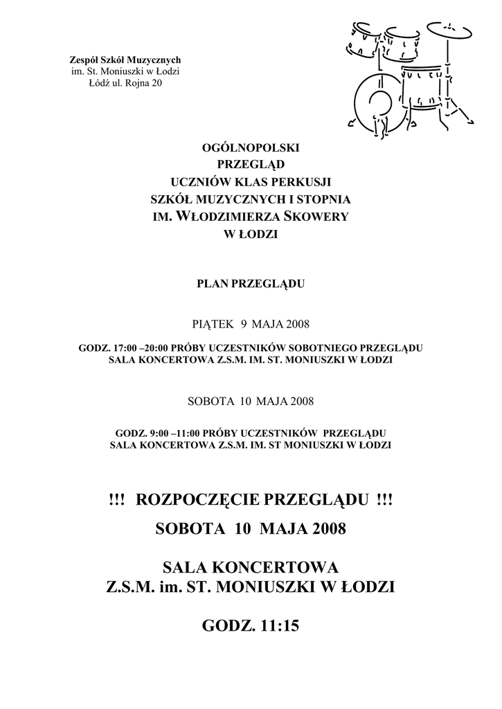 Zespół Szkół Muzycznych im. St. Moniuszki w Łodzi Łódź ul. Rojna 20 OGÓLNOPOLSKI PRZEGLĄD UCZNIÓW KLAS PERKUSJI SZKÓŁ MUZYCZNYCH I STOPNIA IM. WŁODZIMIERZA SKOWERY W ŁODZI PLAN PRZEGLĄDU PIĄTEK 9 MAJA 2008 GODZ. 17:00 –20:00 PRÓBY UCZESTNIKÓW SOBOTNIEGO PRZEGLĄDU SALA KONCERTOWA Z.S.M. IM. ST. MONIUSZKI W ŁODZI SOBOTA 10 MAJA 2008 GODZ. 9:00 –11:00 PRÓBY UCZESTNIKÓW PRZEGLĄDU SALA KONCERTOWA Z.S.M. IM. ST MONIUSZKI W ŁODZI !!! ROZPOCZĘCIE PRZEGLĄDU !!! SOBOTA 10 MAJA 2008 SALA KONCERTOWA Z.S.M. im. ST. MONIUSZKI W ŁODZI GODZ. 11:15 godz. 11:15 Grupa najmłodsza - klasa I cykl sześcioletni 1. Zuzanna Stępnik 2. Aleksandra Świat 3. Wiktor Gordon 4. Kacper Kacprzak 5. Marcin Lindemann 6. Antoni Olesik OSM I i II st. im. H. Wieniawskiego klasa mgr Małgorzaty Kolasy PSM I i II st. im. F. Chopina w Olsztynie klasa mgr Karola Jurczaka ZSM im. St. Moniuszki w Łodzi klasa mgr Sebastiana Dworczaka PSM I i II st. w Pabianicach klasa mgr Bogusławy Stelmach PSM I i II st. im. F. Chopina w Olsztynie klasa mgr Karola Jurczaka POSM I st. im. St. Moniuszki w Katowicach klasa mgr Franciszka Osadzina 7. Agnieszka Krzemińska OSM I i II st. im. K. Lipińskiego w Lublinie klasa mgr Dominika Augustowskiego 8. Paweł Pawłowski PSM I st. w Lidzbarku Warmińskim klasa mgr Jacka Wójcika godz. 11:45 Przerwa godz.12:00 Grupa I -klasa II cykl sześcioletni -klasa I cykl czteroletni 1. Milan Rabij 2. Karen Labiak 3. Szymon Kuźmiński 4. Olga Grzankowska 5. Wojciech Palma 6. Patryk Sierakowski 7. Oliwia Adamowicz POSM I st. im. St. Moniuszki w Katowicach klasa mgr Franciszka Osadzina ZSM im. K. Szymanowskiego w Toruniu klasa mgr Violetty Wronieckiej ZSM im. St. Moniuszki w Łodzi klasa mgr Dariusza Kaśnickiego ZSM im. St. Moniuszki w Łodzi klasa mgr Sebastiana Dworczaka PSM I i II st. w Zduńskiej Woli klasa mgr Małgorzaty Kolasy PSM I st. im. A. Tansmana w Łodzi klasa mgr Miłosza Cicheckiego ZSM im. K. Szymanowskiego w Toruniu klasa mgr Violetty Wronieckiej godz.12:45 Przerwa godz.13:00 Grupa II -klasa III cykl sześcioletni -klasa II cykl czteroletni 1. Robert Małolepszy 2. Kesja Koszewska 3. Michał Boniecki 4 .Bartosz Bielak 5. Anita Bieńkowska ZSM im. St. Moniuszki w Łodzi klasa mgr Sebastiana Dworczaka PSM I i II st. im. K. Kurpińskiego w Kutnie klasa mgr Macieja Matczaka PSM I i II st. w Pabianicach klasa mgr Bogusławy Stelmach ZSM im. K. Szymanowskiego w Toruniu klasa mgr Violetty Wronieckiej PSM I i II st. im. K. Kurpińskiego w Kutnie klasa mgr Magdaleny Kowalczyk godz. 14:00 Przerwa godz. 14 :15 Grupa III -klasa IV cykl sześcioletni -klasa III cykl czteroletni 1. Filip Wolski 2. Maciej Klebbda 3. Jan Makary Fryczak OSM I i II st. im. H. Wieniawskiego klasa mgr Witolda Grabowskiego ZSM im. K. Szymanowskiego w Toruniu klasa mgr Macieja Marciniaka ZSM im. St. Moniuszki w Łodzi klasa mgr Radosława Bolewskiego godz. 14:45 Grupa IV -klasa V i VI cykl sześcioletni -klasa IV cykl czteroletni 1.Ozeasz Błaszczyk 2. Damian Maranda 3. Piotr Heleniak ZSM im. St. Moniuszki w Łodzi klasa mgr Dariusza Kaśnickiego ZSM im. St. Moniuszki w Łodzi klasa mgr Radosława Bolewskiego PSM I st. im. A. Tansmana w Łodzi klasa mgr Bożeny Kozłowskiej godz. 16:00 Ogłoszenie wyników Ogólnopolskiego Przeglądu Uczniów Klas Perkusji Szkół Muzycznych I stopnia. JURY prof. Urszula Bereźnicka-Pniak Akademia Muzyczna im. Grażyny i Kiejstuta Bacewiczów w Łodzi prof. Grzegorz Jurczyk Akademia Muzyczna im. Feliksa Nowowiejskiego w Bydgoszczy prof. Stanisław Proksa Akademia Muzyczna im. Karola Szymanowskiego w Katowicach Sekretarz Przeglądu mgr Sebastian Dworczak ZSM im. St. Moniuszki w Łodzi