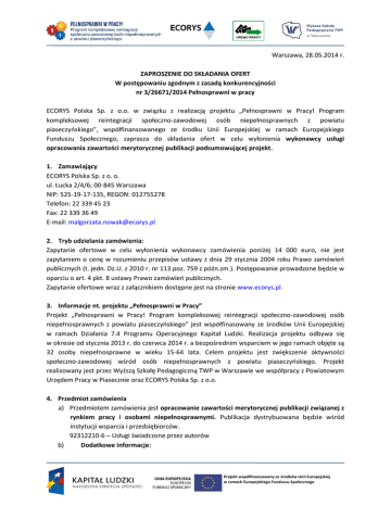 Warszawa, 28.05.2014 r. ZAPROSZENIE DO SKŁADANIA OFERT W postępowaniu zgodnym z zasadą konkurencyjności nr 3/26671/2014 Pełnosprawni w pracy ECORYS Polska Sp. z o.o. w związku z realizacją projektu „Pełnosprawni w Pracy! Program kompleksowej reintegracji społeczno-zawodowej osób niepełnosprawnych z powiatu piaseczyńskiego”, współfinansowanego ze środku Unii Europejskiej w ramach Europejskiego Funduszu Społecznego, zaprasza do składania ofert w celu wyłonienia wykonawcy usługi opracowania zawartości merytorycznej publikacji podsumowującej projekt. 1. Zamawiający ECORYS Polska Sp. z o. o. ul. Łucka 2/4/6; 00-845 Warszawa NIP: 525-19-17-135, REGON: 012755278 Telefon: 22 339 45 23 Fax: 22 339 36 49 E-mail: [email protected] 2. Tryb udzielania zamówienia: Zapytanie ofertowe w celu wyłonienia wykonawcy zamówienia poniżej 14 000 euro, nie jest zapytaniem o cenę w rozumieniu przepisów ustawy z dnia 29 stycznia 2004 roku Prawo zamówień publicznych (t. jedn. Dz.U. z 2010 r. nr 113 poz. 759 z późn.zm.). Postępowanie prowadzone będzie w oparciu o art. 4 pkt. 8 ustawy Prawo zamówień publicznych. Zapytanie ofertowe wraz z załącznikiem dostępne jest na stronie www.ecorys.pl. 3. Informacje nt. projektu „Pełnosprawni w Pracy” Projekt „Pełnosprawni w Pracy! Program kompleksowej reintegracji społeczno-zawodowej osób niepełnosprawnych z powiatu piaseczyńskiego” jest współfinasowany ze środków Unii Europejskiej w ramach Działania 7.4 Programu Operacyjnego Kapitał Ludzki. Realizacja projektu odbywa się w okresie od stycznia 2013 r. do czerwca 2014 r. a bezpośrednim wsparciem w jego ramach objęte są 32 osoby niepełnosprawne w wieku 15-64 lata. Celem projektu jest zwiększenie aktywności społeczno-zawodowej wśród osób niepełnosprawnych z powiatu piaseczyńskiego. Projekt realizowany jest przez Wyższą Szkołę Pedagogiczną TWP w Warszawie we współpracy z Powiatowym Urzędem Pracy w Piasecznie oraz ECORYS Polska Sp. z o.o. 4. Przedmiot zamówienia a) Przedmiotem zamówienia jest opracowanie zawartości merytorycznej publikacji związanej z rynkiem pracy i osobami niepełnosprawnymi. Publikacja dystrybuowana będzie wśród instytucji wsparcia i przedsiębiorców. 92312210-6 – Usługi świadczone przez autorów b) Dodatkowe informacje: Projekt współfinansowany ze środków Unii Europejskiej w ramach Europejskiego Funduszu Społecznego Przewidywana liczba stron tekstu (strona = 1800 znaków) – ok. 32 Zakres tematyczny: - Projekt Pełnosprawni w pracy! – idea, podsumowanie efektów (20 str.)- tekst wzbogacony o wypowiedzi uczestników i uczestniczek oraz specjalistów udzielających wsparcia (opiekunów, trenerów, doradców, brokera), zawierający zestawienie „projekt w liczbach”, grafiki i fotografie - Przykłady dobrych praktyk (10 str.) - kilka przykładów zakładów pracy zatrudniających osoby niepełnosprawne, zawierających mini-wywiady z pracodawcami - Podsumowanie zawartości publikacji wraz odniesieniem do tekstu eksperckiego (2 str.) Zamawiający dostarczy wykonawcy wszelkich niezbędnych materiałów źródłowych, wgląd w dokumentację projektową oraz listę kontaktów do osób, z którymi można przeprowadzić mini-wywiady. 5. Termin realizacji usługi: Termin wykonania usługi ustalony zostanie na 3 tygodnie od dokonania wyboru wykonawcy przez Zamawiającego, nie później jednak niż 30.06.2014r. 6. Wykonawca zobowiązany będzie do: Zapoznania się z dokumentacją projektową i przekazanymi przez Zamawiającego materiałami, Umówienia spotkań i/lub rozmów z uczestnikami i uczestniczkami projektu, specjalistami udzielającymi wsparcia oraz pracodawcami w powiatu piaseczyńskiego zatrudniającymi osoby niepełnosprawne. Opracowania zawartości merytorycznej infografik i tabel odpowiadających treści publikacji, Przygotowania treści publikacji zgodnie z wymaganiami Zamawiającego, 7. Warunki udziału w postępowaniu: I. O udzielenie Zamówienia mogą ubiegać się wykonawcy, którzy posiadają: a) Wykształcenie wyższe b) Doświadczenie w świadczeniu usług o charakterze zbliżonym do przedmiotu zapytania Brak spełnienia jakiegokolwiek z powyższych kryteriów dostępu spowoduje automatycznie niedopuszczenie do udziału w postępowaniu. II. Z udziału w postępowaniu wyłączone są osoby/podmioty, powiązane osobowo lub kapitałowo z ECORYS Polska Sp. z o.o. (przez powiązanie kapitałowe lub osobowe rozumie się wzajemne powiązania między ECORYS Polska Sp. z o.o. lub osobami wykonującymi w imieniu ECORYS Polska Sp. z o.o. czynności związane z przygotowaniem i przeprowadzeniem procedury wyboru wykonawcy z oferentem, polegające w szczególności na: uczestniczeniu w spółce jako wspólnik spółki cywilnej lub spółki osobowej, posiadaniu co najmniej 10% udziałów lub akcji, pełnieniu funkcji członka organu nadzorczego lub zarządzającego, prokurenta, pełnomocnika, pozostawaniu w związku małżeńskim, w stosunku pokrewieństwa Projekt współfinansowany ze środków Unii Europejskiej w ramach Europejskiego Funduszu Społecznego lub powinowactwa w linii prostej, pokrewieństwa lub powinowactwa w linii bocznej do drugiego stopnia lub w stosunku przysposobienia, opieki lub kurateli). 8. Kryterium wyboru oferty: Przy ocenie i porównaniu ofert zastosowane będą następujące kryteria: 1. Cena usługi brutto – maks. 60% (maks. 60 pkt), obliczana według wzoru: C = (Cn/Co) x 60, gdzie: Cn – cena oferty najkorzystniejszej Co – cena oferty rozpatrywanej 2. Doświadczenie w świadczeniu usług o charakterze zbliżonym do przedmiotu zapytania wykazane w CV – maks. 20% (maks. 20 pkt) obliczane według wzoru: D = (Do/Dn) x 20, gdzie: Do – liczba punktów uzyskanych przez danego oferenta, Dn – największa liczba punktów uzyskanych przez oferentów. 3. Znajomość tematyki rynku pracy i zatrudniania osób niepełnosprawnych wykazane poprzez próbkę tekstu (maks. 1 strona – 1800 znak