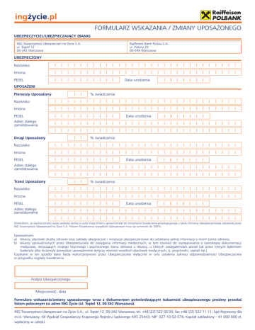 FORMULARZ WSKAZANIA / ZMIANY UPOSAŻONEGO UBEZPIECZYCIEL/UBEZPIECZAJĄCY (BANK) ING Towarzystwo Ubezpieczeń na Życie S.A. ul. Topiel 12 00-342 Warszawa Raiffeisen Bank Polska S.A. ul. Piękna 20 00-549 Warszawa UBEZPIECZONY Nazwisko ||||||||||||||||||||||||||||| Imiona ||||||||||||||||||||||||||||| PESEL |||||||||| Data urodzenia ||||||| UPOSAŻENI Pierwszy Uposażony || % świadczenia Nazwisko ||||||||||||||||||||||||||||| Imiona ||||||||||||||||||||||||||||| PESEL |||||||||| Adres stałego zameldowania ||||||||||||||||||||||||||||| Data urodzenia ||||||| ||||||||||||||||||||||||||||| || % świadczenia Drugi Uposażony Nazwisko ||||||||||||||||||||||||||||| Imiona ||||||||||||||||||||||||||||| PESEL |||||||||| Adres stałego zameldowania ||||||||||||||||||||||||||||| Data urodzenia ||||||| ||||||||||||||||||||||||||||| || % świadczenia Trzeci Uposażony Nazwisko ||||||||||||||||||||||||||||| Imiona ||||||||||||||||||||||||||||| PESEL |||||||||| Adres stałego zameldowania ||||||||||||||||||||||||||||| Data urodzenia ||||||| ||||||||||||||||||||||||||||| Stwierdzam, że wyznaczona(e) wyżej osoba(y) jest/są w razie mojej śmierci uprawniona(e) do otrzymania Świadczenia przysługującego z tytułu Ochrony ubezpieczeniowej udzielanej przez ING Towarzystwo Ubezpieczeń na Życie S.A. Procent Świadczenia wszystkich Uposażonych musi się sumować do 100%. Upoważniam: a) lekarzy, placówki służby zdrowia oraz zakłady ubezpieczeń i instytucje ubezpieczeniowe do udzielania pełnej informacji o moim stanie zdrowia, b) lekarzy upoważnionych przez Ubezpieczyciela do zasięgania informacji medycznych, w tym również do występowania o kserokopię dokumentacji medycznej, dotyczących mojego fizycznego i psychicznego stanu zdrowia u lekarzy, u których zasięgałem/am porad lub przez których byłem/am badany/a albo leczony/a (powyższe upoważnienie dotyczy również wszelkich placówek medycznych, tj. przychodni, szpitali itp.). Uzyskane w ten sposób dane będą wykorzystywane przez Ubezpieczyciela wyłącznie w celu ustalenia zakresu odpowiedzialności Ubezpieczyciela w przypadku wypłaty świadczenia. Podpis Ubezpieczonego Miejscowość, data Formularz wskazania/zmiany uposażonego wraz z dokumentem potwierdzającym tożsamość ubezpieczonego prosimy przesłać listem poleconym na adres ING Życie (ul. Topiel 12, 00-342 Warszawa). ING Towarzystwo Ubezpieczeń na Życie S.A.; ul. Topiel 12, 00-342 Warszawa; tel. +48 (22) 522 00 00, fax +48 (22) 522 11 11; Sąd Rejonowy dla m.st. Warszawy; XII Wydział Gospodarczy Krajowego Rejestru Sądowego KRS 25443; NIP: 527-10-02-574; Kapitał zakładowy - 41 000 000 zł, wpłacony w całości