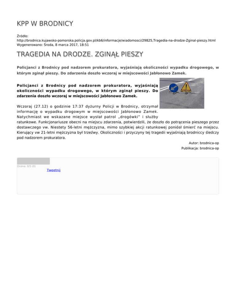 KPP W BRODNICY Źródło: http://brodnica.kujawsko-pomorska.policja.gov.pl/kb6/informacje/wiadomosci/29825,Tragedia-na-drodze-Zginal-pieszy.html Wygenerowano: Środa, 8 marca 2017, 18:51 TRAGEDIA NA DRODZE. ZGINĄŁ PIESZY Policjanci z Brodnicy pod nadzorem prokuratora, wyjaśniają okoliczności wypadku drogowego, w którym zginął pieszy. Do zdarzenia doszło wczoraj w miejscowości Jabłonowo Zamek. Policjanci z Brodnicy pod nadzorem prokuratora, wyjaśniają okoliczności wypadku drogowego, w którym zginął pieszy. Do zdarzenia doszło wczoraj w miejscowości Jabłonowo Zamek. Wczoraj (27.12) o godzinie 17:37 dyżurny Policji w Brodnicy, otrzymał informację o wypadku drogowym w miejscowości Jabłonowo Zamek. Natychmiast we wskazane miejsce wysłał patrol „drogówki” i służby ratunkowe. Funkcjonariusze obecni na miejscu zdarzenia, potwierdzili, że doszło do potrącenia pieszego przez dostawczego vw. Niestety 56-letni mężczyzna, mimo szybkiej akcji ratunkowej poniósł śmierć na miejscu. Kierujący vw 21-letni mężczyzna był trzeźwy. Okoliczności i przyczyny tej tragedii wyjaśniają brodniccy śledczy pod nadzorem prokuratora. Autor: brodnica-op Publikacja: brodnica-op Ocena: 0/5 (0) Tweetnij