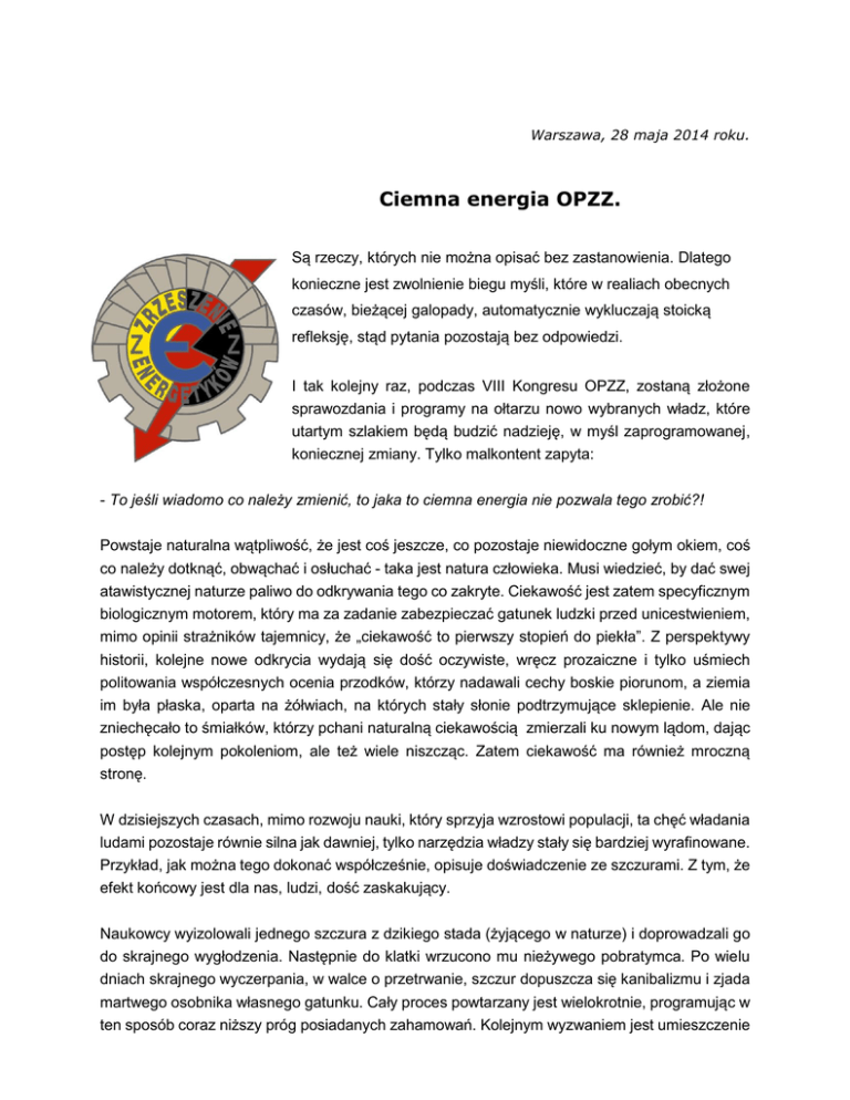 Warszawa, 28 maja 2014 roku. Ciemna energia OPZZ. Są rzeczy, których nie można opisać bez zastanowienia. Dlatego konieczne jest zwolnienie biegu myśli, które w realiach obecnych czasów, bieżącej galopady, automatycznie wykluczają stoicką refleksję, stąd pytania pozostają bez odpowiedzi. I tak kolejny raz, podczas VIII Kongresu OPZZ, zostaną złożone sprawozdania i programy na ołtarzu nowo wybranych władz, które utartym szlakiem będą budzić nadzieję, w myśl zaprogramowanej, koniecznej zmiany. Tylko malkontent zapyta: - To jeśli wiadomo co należy zmienić, to jaka to ciemna energia nie pozwala tego zrobić?! Powstaje naturalna wątpliwość, że jest coś jeszcze, co pozostaje niewidoczne gołym okiem, coś co należy dotknąć, obwąchać i osłuchać - taka jest natura człowieka. Musi wiedzieć, by dać swej atawistycznej naturze paliwo do odkrywania tego co zakryte. Ciekawość jest zatem specyficznym biologicznym motorem, który ma za zadanie zabezpieczać gatunek ludzki przed unicestwieniem, mimo opinii strażników tajemnicy, że „ciekawość to pierwszy stopień do piekła”. Z perspektywy historii, kolejne nowe odkrycia wydają się dość oczywiste, wręcz prozaiczne i tylko uśmiech politowania współczesnych ocenia przodków, którzy nadawali cechy boskie piorunom, a ziemia im była płaska, oparta na żółwiach, na których stały słonie podtrzymujące sklepienie. Ale nie zniechęcało to śmiałków, którzy pchani naturalną ciekawością zmierzali ku nowym lądom, dając postęp kolejnym pokoleniom, ale też wiele niszcząc. Zatem ciekawość ma również mroczną stronę. W dzisiejszych czasach, mimo rozwoju nauki, który sprzyja wzrostowi populacji, ta chęć władania ludami pozostaje równie silna jak dawniej, tylko narzędzia władzy stały się bardziej wyrafinowane. Przykład, jak można tego dokonać współcześnie, opisuje doświadczenie ze szczurami. Z tym, że efekt końcowy jest dla nas, ludzi, dość zaskakujący. Naukowcy wyizolowali jednego szczura z dzikiego stada (żyjącego w naturze) i doprowadzali go do skrajnego wygłodzenia. Następnie do klatki wrzucono mu nieżywego pobratymca. Po wielu dniach skrajnego wyczerpania, w walce o przetrwanie, szczur dopuszcza się kanibalizmu i zjada martwego osobnika własnego gatunku. Cały proces powtarzany jest wielokrotnie, programując w ten sposób coraz niższy próg posiadanych zahamowań. Kolejnym wyzwaniem jest umieszczenie w klatce - ze szczurem kanibalem - żywego osobnika tego gatunku, z tym że skrajnie wyczerpanego. Tym razem poprzeczka jest postawiona o stopień wyżej. Szczur musi zdecydować, czy ma zamordować by dalej przeżyć. W konsekwencji zabija i zjada nieszczęśnika. Cały proces kolejnego programowania jest powtarzany wielokrotnie z coraz silniejszymi osobnikami, serwowanymi jako danie podstawowe. W finale prowadzonego eksperymentu, każdy nowy szczur wkładany do klatki jest rozszarpywany w ułamku sekundy przez swojego ziomka. Cała ta zabawa ma jednak swój ukryty cel i nie jest to koniec historii. Szczura z klatki przywraca się jego byłemu stadu żyjącemu na wolności. Zaobserwowane zjawiska pokazują, że kanibalizm stał się integralną cechą zainfekowanego szczura. W gromadzie wyszukuje on osobnika będącego w oddaleniu od stada i zagryza go by w ten sposób zdobywać pożywienie. Po czasie proceder zostaje wykryty przez resztę społeczności. Zaskakujące jest to, że szczur kanibal nie zostaje uśmiercony, lecz porzucony, a cała populacja wyprowadza się z miejsca, w którym do tej pory żyła - i znika. W przypadku szczurów nie dochodzi do złamania tabu, natura chroni populacje przed infekcją nienaturalnych adaptacji, które może nie definiuje w kategorii dobra i zła, ale instynktownie jako zbiorowość wie, co jest konieczne by przeciwstawić się „ciemnej energii”. Z ludźmi wydaje się, że powinno być podobnie. Mimo to oklaskujemy chciwość, godzimy się na eutanazję naszych seniorów, złodziejstwo władzy już nas tak nie razi, bylejakość szkolnictwa jest większości obojętna, oklapła nam chęć zainteresowania się sąsiadem, problemy branży w której pracujemy są tylko naszymi problemami (mimo deklaracji, że jest inaczej), patriotyzm i honor stają się tematem drwin, a na końcu „baba z brodą” wygrywa Eurowizję i cały świat nam każe wierzyć, że to symbol nowoczesności gdzie myślących inaczej naznacza się anatemą. Z takiej „ciemnej energii” są obecnie budowane społeczeństwa, bo tylko buntuje się mniejszość, co ujawniają kolejne wybory w parlamentach całego świata. Trudno z tej perspektywy uznać, że infekcja ominęła OPZZ lub inne związki zawodowe. Paradoksalnie może ktoś uznać, że łatwo zaprzeczyć tym słowom, pokazując zamierzenia, co należy poprawić by było dobrze, spisane i uwiarygodnione pieczęcią przeciw złu. Tylko, że to są słowa a nie czyny, bo czyny to kwestia wyboru odpowiednich ludzi, tak jak w przypadku opisanej historii szczurów. Całą tą zagadkę i odpowiedź na pytanie, które zostało postawione we wstępie, rozwikłał filozof i teolog z IV w. n.e. św. Augustyn z Hippony - kiedy jeszcze nie było OPZZ - stawiając bardzo świecką diagnozę, że „Można mieć uszy, a nie słuchać”, dodając: „Czas to ludzie, bo to ludzie tworzą czasy, dobre lub złe” i dlatego: „Nie mówmy, że czasy są złe. My jesteśmy czasem. Bądźmy dobrymi, a czasy będą dobre.”