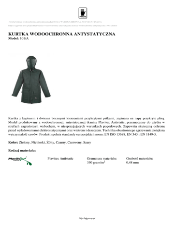 /oferta/Odzież wodoochronna antystatyczna/KURTKA WODOOCHRONNA ANTYSTATYCZNA https://ajgroup-pros.pl/pl/offer/odziez-wodoochronna-antystatyczna/kurtka-wodoochronna-antystatyczna-101-a.html/ KURTKA WODOOCHRONNA ANTYSTATYCZNA Model: 101/A Kurtka z kapturem i dwiema bocznymi kieszeniami przykrytymi patkami, zapinana na napy przykryte plisą. Model produkowany z wodoochronnej, antystatycznej tkaniny Plavitex Antistatic, przeznaczony do użytku w strefach zagrożonych wybuchem, w niesprzyjających warunkach pogodowych. Zapewnia skuteczną ochronę przed wyładowaniami elektrostatycznymi oraz wiatrem i deszczem. Technika obustronnego zgrzewania zwiększa wytrzymałość szwów. Produkt spełnia standardy europejskich norm: EN ISO 13688, EN 343 i EN 1149-5. Kolor: Zielony, Niebieski, Żółty, Czarny, Czerwony, Szary Rodzaj materiału: Plavitex Antistatic Gramatura materiału: 350 gram/m² http://ajgroup.pl Grubość materiału: 0,48 mm Rozmiar: 48, 50, 52, 54, 56, 58, 60, 62 Tabela rozmiarów: S Rozmiar 48 Wzrost 164 Obwód 96-100 klat. piersiowej Obwód w 80-84 pasie M 50 170 100-104 L 52 176 104-108 L 54 176 108-112 XL 56 182 112-116 XXL 58 188 116-120 XXXL 60 194 120-124 XXXXL 62 198 124-128 80-84 84-88 84-88 88-92 92-96 96-100 96-100 Normy: Cechy specyficzne: EN ISO 13688 Odzież ochronna wymagania ogólne. EN 343 Odzież ochronna. Ochrona przed deszczem. EN 1149-5 Odzież ochronna. Właściwości elektrostatyczne. -50ºC Produkt odporny na zginanie przy dużych ujemnych temperaturach. Obustronne zgrzewanie 2 kieszenie Kaptur Kieszeń nagrzewana Napy przykryte plisą Wentylacja karczek http://ajgroup.pl Powered by TCPDF (www.tcpdf.org)