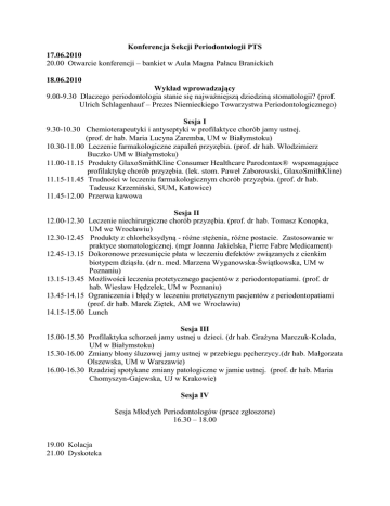 Konferencja Sekcji Periodontologii PTS 17.06.2010 20.00 Otwarcie konferencji – bankiet w Aula Magna Pałacu Branickich 18.06.2010 Wykład wprowadzający 9.00-9.30 Dlaczego periodontologia stanie się najważniejszą dziedziną stomatologii? (prof. Ulrich Schlagenhauf – Prezes Niemieckiego Towarzystwa Periodontologicznego) Sesja I 9.30-10.30 Chemioterapeutyki i antyseptyki w profilaktyce chorób jamy ustnej. (prof. dr hab. Maria Lucyna Zaremba, UM w Białymstoku) 10.30-11.00 Leczenie farmakologiczne zapaleń przyzębia. (prof. dr hab. Włodzimierz Buczko UM w Białymstoku) 11.00-11.15 Produkty GlaxoSmithKline Consumer Healthcare Parodontax® wspomagające profilaktykę chorób przyzębia. (lek. stom. Paweł Zaborowski, GlaxoSmithKline) 11.15-11.45 Trudności w leczeniu farmakologicznym chorób przyzębia. (prof. dr hab. Tadeusz Krzemiński, SUM, Katowice) 11.45-12.00 Przerwa kawowa Sesja II 12.00-12.30 Leczenie niechirurgiczne chorób przyzębia. (prof. dr hab. Tomasz Konopka, UM we Wrocławiu) 12.30-12.45 Produkty z chlorheksydyną - różne stężenia, różne postacie. Zastosowanie w praktyce stomatologicznej. (mgr Joanna Jakielska, Pierre Fabre Medicament) 12.45-13.15 Dokoronowe przesunięcie płata w leczeniu defektów związanych z cienkim biotypem dziąsła. (dr n. med. Marzena Wyganowska-Świątkowska, UM w Poznaniu) 13.15-13.45 Możliwości leczenia protetycznego pacjentów z periodontopatiami. (prof. dr hab. Wiesław Hędzelek, UM w Poznaniu) 13.45-14.15 Ograniczenia i błędy w leczeniu protetycznym pacjentów z periodontopatiami (prof. dr hab. Marek Ziętek, AM we Wrocławiu) 14.15-15.00 Lunch Sesja III 15.00-15.30 Profilaktyka schorzeń jamy ustnej u dzieci. (dr hab. Grażyna Marczuk-Kolada, UM w Białymstoku) 15.30-16.00 Zmiany błony śluzowej jamy ustnej w przebiegu pęcherzycy.(dr hab. Małgorzata Olszewska, UM w Warszawie) 16.00-16.30 Rzadziej spotykane zmiany patologiczne w jamie ustnej. (prof. dr hab. Maria Chomyszyn-Gajewska, UJ w Krakowie) Sesja IV Sesja Młodych Periodontologów (prace zgłoszone) 16.30 – 18.00 19.00 Kolacja 21.00 Dyskoteka 19.06.2010 Sesja I 9.00-10.00 Implants as part of the modern treatment planning. Theory and practice. (dr Eli Friedwald, Izrael) 10.00-11.00 Prevention and treatment of periimplantitis. (prof. Niklaus Lang, Szwajcaria/ Hong Kong) 11.00-11.45 Technologia triklosan/kopolimer w profilaktyce i leczeniu chorób przyzębia. (prof. Fotinos Panagakos, Colgate-Palmolive) 11.45-12.00 Przerwa kawowa 12.00 – 12.30 12.30 – 13.00 13.00 – 13.30 13.30 – 14.30 Sesja II Leczenie podtrzymujące. (prof. dr hab. Jadwiga Banach, PAM, Szczecin) Możliwości ortodontycznej stabilizacji warunków zgryzowych u pacjentów z periodontopatiami. (prof. Thomas Gedrange, Niemcy) Diagnostyka radiologiczna periodontopatii. (dr hab. Ingrid RóżyłoKalinowska, UM w Lublinie) Lunch Panel interdyscyplinarny Cele i zadania periodontologii w trosce o zdrowie ogólne pacjenta 15.00 – 16.30 Aula Magna Pałacu Branickich wstęp wolny Moderatorzy: prof. dr hab. Renata Górska, prof. dr hab. Marek Naruszewicz Udział wezmą: prof. dr hab. Jadwiga Banach, prof. dr hab. Maria Chomyszyn-Gajewska, prof. dr hab. Maria Górska, prof. dr hab. Małgorzata Szelachowska, prof. dr hab. Beata Wożakowska-Kapłon, prof. dr hab. Edward Franek, prof. dr hab. Tomasz Konopka, prof. dr hab. Włodzimierz Musiał, prof. dr hab. Wanda Stokowska, prof. dr hab. Maria Lucyna Zaremba, prof. dr hab. Marek Ziętek 16.30 Koktajl na zakończenie konferencji / Ogłoszenie wyników konkursu na najlepsze wystąpienie w Sesji Młodych Periodontologów i Sesji Plakatowej. Sesja Plakatowa (w trakcie trwania konferencji)