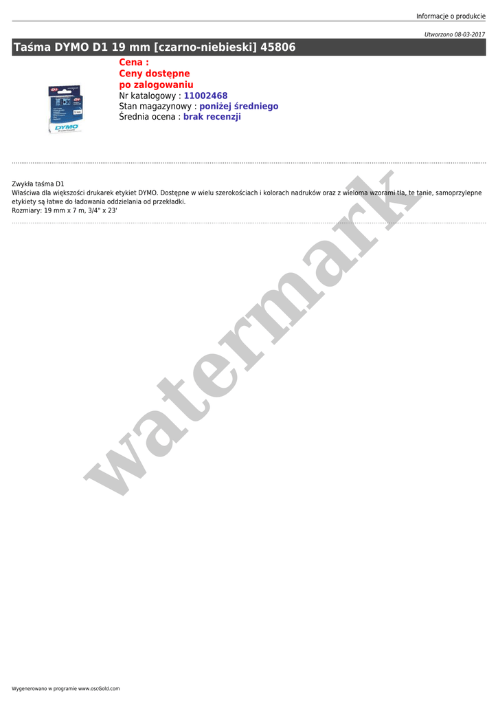 Informacje o produkcie Utworzono 08-03-2017 Taśma DYMO D1 19 mm [czarno-niebieski] 45806 Cena : Ceny dostępne po zalogowaniu Nr katalogowy : 11002468 Stan magazynowy : poniżej średniego Średnia ocena : brak recenzji w at er m ar k Zwykła taśma D1 Właściwa dla większości drukarek etykiet DYMO. Dostępne w wielu szerokościach i kolorach nadruków oraz z wieloma wzorami tła, te tanie, samoprzylepne etykiety są łatwe do ładowania oddzielania od przekładki. Rozmiary: 19 mm x 7 m, 3/4" x 23' Wygenerowano w programie www.oscGold.com