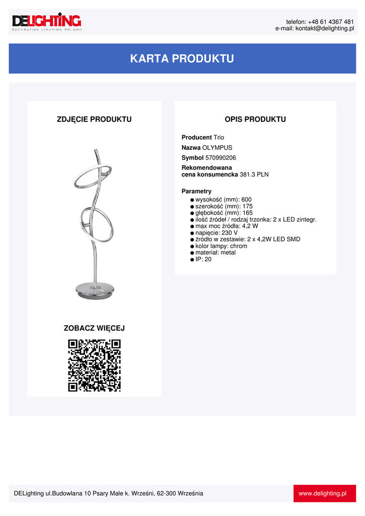 telefon: +48 61 4367 481 e-mail: [email protected] KARTA PRODUKTU ZDJĘCIE PRODUKTU OPIS PRODUKTU Producent Trio Nazwa OLYMPUS Symbol 570990206 Rekomendowana cena konsumencka 381.3 PLN Parametry ● wysokość (mm): 600 ● szerokość (mm): 175 ● głębokość (mm): 165 ● ilość źródeł / rodzaj trzonka: 2 x LED zintegr. ● max moc źródła: 4,2 W ● napięcie: 230 V ● źródło w zestawie: 2 x 4,2W LED SMD ● kolor lampy: chrom ● materiał: metal ● IP: 20 ZOBACZ WIĘCEJ DELighting ul.Budowlana 10 Psary Małe k. Wrześni, 62-300 Września www.delighting.pl