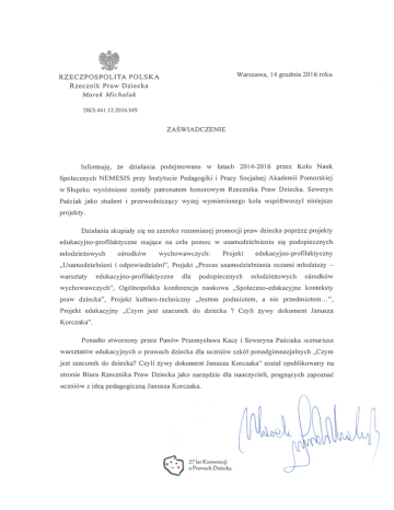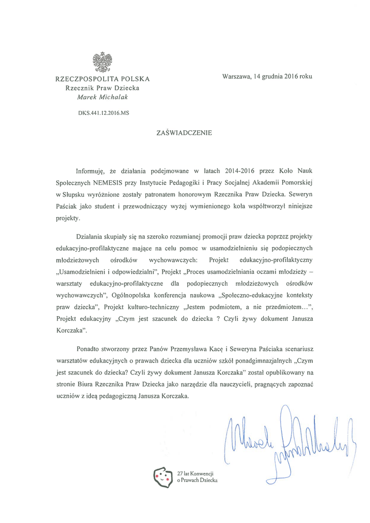 Warszawa, 14 grudnia 2016 roku RZECZPOSPOLITA POLSKA Rzecznik Praw Dziecka Marek Michalak DKS.441.12.201 6.MS ZAŚWIADCZENI E Informuję, że działania podejmowane w latach 2014-2016 przez Koło Nauk Społecznych NEMESIS przy Instytucie Pedagogiki i Pracy Socjalnej Akademii Pomorskiej w Słupsku wyróżnione zostały patronatem honorowym Rzecznika Praw Dziecka. Seweryn Paściak jako student i przewodniczący wyżej wymienionego koła wspóltworzył niniejsze projekty. Działania skupiały się na szeroko rozumianej promocji praw dziecka poprzez projekty edukacyjno-profilaktyczne mające na celu pomoc w usamodzielnieniu się podopiecznych młodzieżowych ośrodków wychowawczych: Projekt edukacyjno-profilaktyczny „Usamodzielnieni i odpowiedzialni”, Projekt „Proces usamodzielniania oczami młodzieży warsztaty edukacyjno-profilaktyczne dla podopiecznych młodzieżowych — ośrodków wychowawczych”, Ogólnopolska konferencja naukowa „Społeczno-edukacyjne konteksty praw dziecka”, Projekt kulturo-techniczny „Jestem podmiotem, a nie przedmiotem...”, Projekt edukacyjny „Czym jest szacunek do dziecka ? Czyli żywy dokument Janusza Korczaka”. Ponadto stworzony przez Panów Przemysława Kacę i Seweryna Paściaka scenariusz warsztatów edukacyjnych o prawach dziecka dla uczniów szkół ponadgimnazjalnych „Czyrn jest szacunek do dziecka? Czyli żywy dokument Janusza Korczaka” został opublikowany na stronie Biura Rzecznika Praw Dziecka jako narzędzie dla nauczycieli, pragnących zapoznać uczniów z ideą pedagogiczną Janusza Korczaka. • 27 lat Konwencji o Prawach Dziecka