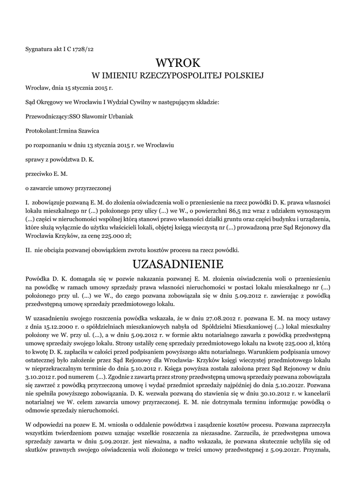 Sygnatura akt I C 1728/12 WYROK W IMIENIU RZECZYPOSPOLITEJ POLSKIEJ Wrocław, dnia 15 stycznia 2015 r. Sąd Okręgowy we Wrocławiu I Wydział Cywilny w następującym składzie: Przewodniczący:SSO Sławomir Urbaniak Protokolant:Irmina Szawica po rozpoznaniu w dniu 13 stycznia 2015 r. we Wrocławiu sprawy z powództwa D. K. przeciwko E. M. o zawarcie umowy przyrzeczonej I. zobowiązuje pozwaną E. M. do złożenia oświadczenia woli o przeniesienie na rzecz powódki D. K. prawa własności lokalu mieszkalnego nr (...) położonego przy ulicy (...) we W., o powierzchni 86,5 m2 wraz z udziałem wynoszącym (...) części w nieruchomości wspólnej którą stanowi prawo własności działki gruntu oraz części budynku i urządzenia, które służą wyłącznie do użytku właścicieli lokali, objętej księgą wieczystą nr (...) prowadzoną prze Sąd Rejonowy dla Wrocławia Krzyków, za cenę 225.000 zł; II. nie obciąża pozwanej obowiązkiem zwrotu kosztów procesu na rzecz powódki. UZASADNIENIE Powódka D. K. domagała się w pozwie nakazania pozwanej E. M. złożenia oświadczenia woli o przeniesieniu na powódkę w ramach umowy sprzedaży prawa własności nieruchomości w postaci lokalu mieszkalnego nr (...) położonego przy ul. (...) we W., do czego pozwana zobowiązała się w dniu 5.09.2012 r. zawierając z powódką przedwstępną umowę sprzedaży przedmiotowego lokalu. W uzasadnieniu swojego roszczenia powódka wskazała, że w dniu 27.08.2012 r. pozwana E. M. na mocy ustawy z dnia 15.12.2000 r. o spółdzielniach mieszkaniowych nabyła od Spółdzielni Mieszkaniowej (...) lokal mieszkalny położony we W. przy ul. (...), a w dniu 5.09.2012 r. w formie aktu notarialnego zawarła z powódką przedwstępną umowę sprzedaży swojego lokalu. Strony ustaliły cenę sprzedaży przedmiotowego lokalu na kwotę 225.000 zł, którą to kwotę D. K. zapłaciła w całości przed podpisaniem powyższego aktu notarialnego. Warunkiem podpisania umowy ostatecznej było założenie przez Sąd Rejonowy dla Wrocławia- Krzyków księgi wieczystej przedmiotowego lokalu w nieprzekraczalnym terminie do dnia 5.10.2012 r. Księga powyższa została założona przez Sąd Rejonowy w dniu 3.10.2012 r. pod numerem (...). Zgodnie z zawartą przez strony przedwstępną umową sprzedaży pozwana zobowiązała się zawrzeć z powódką przyrzeczoną umowę i wydać przedmiot sprzedaży najpóźniej do dnia 5.10.2012r. Pozwana nie spełniła powyższego zobowiązania. D. K. wezwała pozwaną do stawienia się w dniu 30.10.2012 r. w kancelarii notarialnej we W. celem zawarcia umowy przyrzeczonej. E. M. nie dotrzymała terminu informując powódką o odmowie sprzedaży nieruchomości. W odpowiedzi na pozew E. M. wniosła o oddalenie powództwa i zasądzenie kosztów procesu. Pozwana zaprzeczyła wszystkim twierdzeniom pozwu uznając wszelkie roszczenia za niezasadne. Zarzuciła, że przedwstępna umowa sprzedaży zawarta w dniu 5.09.2012r. jest nieważna, a nadto wskazała, że pozwana skutecznie uchyliła się od skutków prawnych swojego oświadczenia woli złożonego w treści umowy przedwstępnej z 5.09.2012r. Przyznała, że istotnie zawarła z powódką umowę przedwstępną kupna sprzedaży nieruchomości, w której strony ustaliły, że do dnia 5.10.2012r. zostanie zawarta umowa przyrzeczona. Wyjaśniła dalej, że do zawarcia umowy przedwstępnej doszło wskutek wieloletnich zabiegów córki powódki - S. K. będącej sąsiadką pozwanej. Istotne jednak było to, że zawierając umowę przedwstępną S. K., która przez cały czas działała w imieniu powódki, zapewniała pozwaną, iż w zamian za sprzedaż swojej nieruchomości otrzyma na własność inne mieszkanie we W.. Ustalenie to nie zostało jednak zawarte w treści umowy. Pozwana podnosi, że wydanie przedmiotu umowy jakie zawarte zostało w postanowieniach umowy przedwstępnej jest nierealne albowiem pozwana i jej rodzina nie ma gdzie się wyprowadzić, nie zostało zapewnione jej inne mieszkanie. Pozwana ma pięcioro dorosłych już dzieci, w tym jedno z dzieci jest niepełnosprawne. Rodzina pozwanej żyła w bardzo trudnych warunkach. Wobec zadłużenia z tytułu opłat za mieszkanie prowadzone było postępowanie eksmisyjne i wyrokiem z dnia 23.07.2004 r. Sąd orzekł eksmisję pozwanej i jej rodziny. Zadłużenie wobec spółdzielni na dzień 30.11.2009 r. wyniosło 186.334,83zł i warunkiem odstąpienia od eksmisji było uregulowanie całości długów wobec Spółdzielni. S. K. znała sytuację rodzinną i finansową pozwanej i podjęła się, z udziałem własnych środków finansowych, działań mających na celu spłacenie długu pozwanej i zapewnienie jej i jej rodzinie innego mieszkania. Pozwana darzyła S. K. zaufaniem ze względu na jej zaangażowanie i pozycję społeczną i podporządkowała się wszelkim jej poczynaniom. Z tego powodu podpisywała też wiele umów notarialnych, w tym umowę z dnia 5.09.2012r. Odnosząc się do treści uzgodnień jakie zostały zawarte w przedwstępnej umowie sprzedaży pozwana stanowczo zaprzeczyła, by otrzymała pieniądze od powódki D. K. jako cenę sprzedaży nieruchomości. Jak wskazała doszło jedynie do zapłaty kwoty ok. 150.000zł na konto Spółdzielni Mieszkaniowej (...) tytułem zadłużenia. Zaprzeczyła również by strony wspólnie ustalały cenę sprzedaży nieruchomości. W ocenie pozwanej umowa z dnia 5.09.2012r. jest nieważna także z tego powodu, że brak jest ekwiwalentności świadczeń we wzajemnych zobowiązaniach stron. Zaproponowana cena sprzedaży odbiega od realnych wartości rynkowych takich nieruchomości bowiem według wiedzy pozwanej wartość przedmiotowego mieszkania kształtuje się w granicach 450.000zł. Najistotniejsza kwestią w ocenie pozwanej pozostaje jednak to, że pozwana obok pokrycia długów w spółdzielni miała otrzymać inne mieszkanie- odpowiednie do zamieszkania pozwanej i jej rodziny, co jednak nie nastąpiło. Wyjaśnia dalej, ż