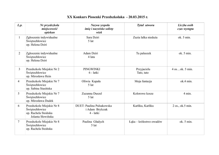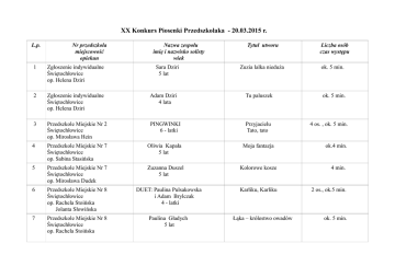 XX Konkurs Piosenki Przedszkolaka - 20.03.2015 r. L.p. Nr przedszkola miejscowość opiekun Nazwa zespołu imię i nazwisko solisty wiek Sara Dziri 5 lat Tytuł utworu Zuzia lalka nieduża Liczba osób czas występu 1 Zgłoszenie indywidualne Świętochłowice op. Helena Dziri 2 Zgłoszenie indywidualne Świętochłowice op. Helena Dziri Adam Dziri 4 lata Tu paluszek 3 Przedszkole Miejskie Nr 2 Świętochłowice op. Mirosława Hein PINGWINKI 6 - latki Przyjacielu Tato, tato 4 Przedszkole Miejskie Nr 7 Świętochłowice op. Sabina Stasińska Oliwia Kapała 5 lat Moja fantazja 5 Przedszkole Miejskie Nr 7 Świętochłowice op. Mirosława Dudek Zuzanna Duszel 5 lat Kolorowe kosze 4 min. 6 Przedszkole Miejskie Nr 8 Świętochłowice op. Rachela Stoińska Jolanta Słowińska DUET: Paulina Pulsakowska i Adam Brylczak 4 - latki Karliku, Karliku 2 os., ok.5 min. 7 Przedszkole Miejskie Nr 8 Świętochłowice op. Rachela Stoińska Paulina Gładych 5 lat Łąka – królestwo owadów ok. 5 min. ok. 5 min. 4 os. , ok. 5 min. ok.4 min. ok. 5 min. 8 Przedszkole Miejskie Nr 9 Świętochłowice op. Barbara Kwolek MOTYLKI 5 - latki 9 Przedszkole Miejskie Nr 9 Świętochłowice op. Agnieszka Szaduja Karol Margos 5 lat Maszeruje wiosna ok. 2 min 10 Przedszkole Miejskie Nr 9 Świętochłowice op. Agnieszka Szaduja Liliana Glodny 4 lata O kochaniu misia ok. 3 min. 11 Przedszkole Miejskie Nr 9 Świętochłowice op. Agnieszka Szaduja Marta Minko 5 lat Kwiatowa wróżka ok. 2 min. 12 Przedszkole Miejskie Nr 9 Świętochłowice op. Aleksandra Florkowska - Niemiec Dorian Kasprzyk 4 lata Jestem sobie przedszkolaczek ok. 2 min. 13 Przedszkole Miejskie Nr 9 Świętochłowice op. Aleksandra Florkowska - Niemiec Martyna Watała 4 lata Kotek Puszek 14 Przedszkole Miejskie Nr 9 Świętochłowice op. Wioletta Altman Aleksandra Błaut SŁONECZKA 6 - latki Taniec Mai Mam moc 6 osób, ok. 7 min 15 Przedszkole Miejskie Nr 9 Świętochłowice op. Magdalena Makowska - Pomietło Zając Tup 2 osoby, ok. 2 min. DUET: Maks Wojtaszczyk 5 l. Adam Koloch 4 lata Parasole 5 osób, ok. 5 min. 1 min. 16 Przedszkole Miejskie Nr 9 Świętochłowice op. Justyna Duda ŻABKI 5 - latki Zgadzam się 7 osób, ok. 5 min. 17 Przedszkole Miejskie Nr 9 Świętochłowice op. Justyna Duda ŻABKI 5 - latki Frelka śląska 4 osoby, ok. 5 min. 18 Przedszkole Miejskie Nr 9 Świętochłowice op. Justyna Duda ŻABKI 5 - latki To nasza Ojczyzna 19 Przedszkole Miejskie Nr 13 Świętochłowice op. Justyna Malecha TYGRYSKI 5 - latki Tra – ta - ta 20 Przedszkole Miejskie Nr 13 Świętochłowice op. Ewa Dawid BIEDRONKI 4 -5 latki Jesienny deszcz Magiczne miejsce 12 os., ok. 2 min. ok. 3 min. 21 Przedszkole Miejskie Nr 13 Świętochłowice op. Joanna Bujar KOTKI 6 - latki Dorotka 15 osób ok. 3 min. 22 Przedszkole Miejskie Nr 13 Świętochłowice op. Justyna Malecha Sonia Gęgotek 5 lat Dżungla ok. 2 min. 23 Przedszkole Miejskie Nr 13 Świętochłowice op. Marzena Szurlej MYSZKI 4 – 5 lat W naszym ogródeczku 24 Przedszkole Miejskie Nr 13 Świętochłowice op. Iwona Utnik Julia Langer 4 lata Wiosenna poleczka 3 osoby, ok. 5 min 25 osób, ok. 2 min. 24 osoby 1 min. 1 min. 25 Przedszkole Miejskie Nr 13 Świętochłowice op. Bogumiła Durasiewicz 26 Przedszkole Miejskie Nr 13 Świętochłowice op. Jadwiga Kapturska PSZCZÓŁKI Emilia Wnęk – solistka 5 – 6 latki ŻABKI 5 – 6 latki Dyrygent Marcowe żaby 25 osób, 3 min. 25 osób, ok. 2 min.