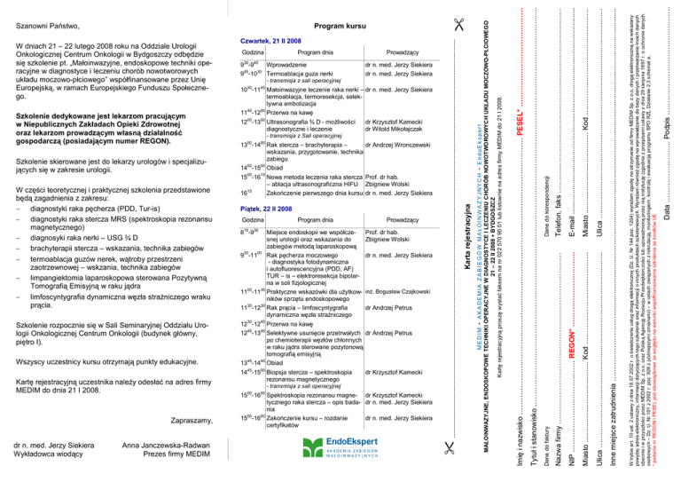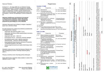 Prof. dr hab. Zbigniew Wolski dr n. med. Jerzy Siekiera inŜ. Bogusław Czajkowski dr Andrzej Petrus 1245-1345 Selektywne usunięcie przetrwałych dr Andrzej Petrus po chemioterapii węzłów chłonnych w raku jądra sterowane pozytonową tomografią emisyjną transmisja z sali operacyjnej 1345-1445 -Obiad 1445-1500 Biopsja stercza – spektroskopia rezonansu magnetycznego dr Krzysztof Kamecki - transmisja z sali operacyjnej 1500-1600 Spektroskopia rezonansu magne- dr Krzysztof Kamecki tycznego raka stercza – opis bada- dr n. med. Jerzy Siekiera nia 1500-1600 Zakończenie kursu – rozdanie dr n. med. Jerzy Siekiera certyfikatów Data ……………...…….. Podpis …………………………..…………. W trybie art. 10 ust. 2 ustawy z dnia 18.07.2002 r. o świadczeniu usług drogą elektroniczną (Dz. U. Nr 144 poz. 1204) wyraŜam zgodę na otrzymanie od firmy MEDIM Sp. z o.o. drogą elektroniczną na wskazany powyŜej adres elektroniczny, informacji dotyczących tego szkolenia oraz informacji o innych produktach szkoleniowych. WyraŜam równieŜ zgodę na wprowadzenie do bazy danych i przetwarzanie moich danych obecnie i w przyszłości przez MEDIM Sp. z o.o. oraz Polską Agencję Rozwoju Przedsiębiorczości lub upowaŜnioną przez nią instytucję (zgodnie z przepisami ustawy z dnia 29 sierpnia 1997 r. o ochronie danych osobowych – Dz. U. Nr 101 z 2002 r. poz. 926 z późniejszymi zmianami) – w celach związanych z rekrutacją, monitoringiem, kontrolą i ewaluacją programu SPO RZL Działanie 2.3 schemat a. * podanie nr REGON i PESEL jest obowiązkowe ze względu na warunki współfinansowania szkolenia ze środków UE Miejsce endoskopii we współczesnej urologii oraz wskazania do zabiegów metodą laparoskopową 930-1100 Rak pęcherza moczowego - diagnostyka fotodynamiczna i autofluorescencyjna (PDD, AF) TUR – is – elektroresekcja bipolarna w soli fizjologicznej transmisja zwskazówki sali operacyjnej 1100-1130 -Praktyczne dla uŜytkowników sprzętu endoskopowego 1130-1230 Rak prącia – limfoscyntygrafia dynamiczna węzła straŜniczego 1230-1245 Przerwa na kawę Inne miejsce zatrudnienia ………………………........................................................................................................................................................ 8 -9 Prowadzący Ulica ….................................................................................................... Program dnia 30 Ulica …............................................................................................. 15 Miasto ........................................ Kod …………..………...…....…...……. Godzina Miasto ........................................ Kod …………..………...…………. Piątek, 22 II 2008 E-mail ...................................................................................................... Prof. dr hab. Zbigniew Wolski dr n. med. Jerzy Siekiera NIP …………………………..…… REGON* …………………………. dr Andrzej Wronczewski Telefon, faks ........................................................................................... Anna Janczewska-Radwan Prezes firmy MEDIM - transmisja z Sali operacyjnej 1300-1400 Rak stercza – brachyterapia – wskazania, przygotowanie, technika zabiegu 1400-1500 Obiad 1500-1615 Nowa metoda leczenia raka stercza – ablacja ultrasonograficzna HIFU 1615 Zakończenie pierwszego dnia kursu Nazwa firmy …………………………………………………………..… Zapraszamy, - transmisja z sali operacyjnej 1030-1145 Małoinwazyjne leczenie raka nerki – dr n. med. Jerzy Siekiera termoablacja, termoresekcja, selektywna embolizacja 1145-1200 Przerwa na kawę 1200-1300 Ultrasonografia ¾ D - moŜliwości dr Krzysztof Kamecki diagnostyczne i leczenie dr Witold Mikołajczak Dane do korespondencji Kartę rejestracyjną uczestnika naleŜy odesłać na adres firmy MEDIM do dnia 21 I 2008. dr n. med. Jerzy Siekiera dr n. med. Jerzy Siekiera Dane do faktury Wszyscy uczestnicy kursu otrzymają punkty edukacyjne. 9 -9 Wprowadzenie 945-1030 Termoablacja guza nerki Prowadzący Tytuł i stanowisko ……………………………………………………………………………………………………………………………………..….…....... Szkolenie rozpocznie się w Sali Seminaryjnej Oddziału Urologii Onkologicznej Centrum Onkologii (budynek główny, piętro I). Program dnia 45 Imię i nazwisko …………………………………………………………………………………………………… PESEL* …….……………………………. W części teoretycznej i praktycznej szkolenia przedstawione będą zagadnienia z zakresu: − diagnostyki raka pęcherza (PDD, Tur-is) − diagnostyki raka stercza MRS (spektroskopia rezonansu magnetycznego) − diagnosyki raka nerki – USG ¾ D − brachyterapii stercza – wskazania, technika zabiegów − termoablacja guzów nerek, wątroby przestrzeni zaotrzewnowej – wskzania, technika zabiegów − limpangiektomia laparoskopowa sterowana Pozytywną Tomografią Emisyjną w raku jądra − limfoscyntygrafia dynamiczna węzła straŜniczego wraku prącia. 30 Karta rejestracyjna Szkolenie skierowane jest do lekarzy urologów i specjalizujących się w zakresie urologii. Godzina MEDIM • AKADEMIA ZABIEGÓW MAŁOINWAZYJNYCH • EndoEkspert MAŁOINWAZYJNE, ENDOSKOPOWE TECHNIKI OPERACYJNE W DIAGNOSTYCE I LECZENIU CHORÓB NOWOTWOROWYCH UKŁADU MOCZOWO-PŁCIOWEGO 21 – 22 II 2008 BYDGOSZCZ Kartę rejestracyjną proszę wysłać faksem na nr 022 570 90 01 lub listownie na adres firmy MEDIM do 21 I 2008. Szkolenie dedykowane jest lekarzom pracującym w Niepublicznych Zakładach Opieki Zdrowotnej oraz lekarzom prowadzącym własną działalność gospodarczą (posiadającym numer REGON). Czwartek, 21 II 2008 W dniach 21 – 22 lutego 2008 roku na Oddziale Urologii Onkologicznej Centrum Onkologi