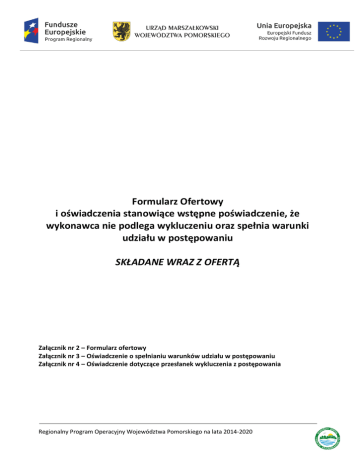 Formularz Ofertowy i oświadczenia stanowiące wstępne poświadczenie, że wykonawca nie podlega wykluczeniu oraz spełnia warunki udziału w postępowaniu SKŁADANE WRAZ Z OFERTĄ Załącznik nr 2 – Formularz ofertowy Załącznik nr 3 – Oświadczenie o spełnianiu warunków udziału w postępowaniu Załącznik nr 4 – Oświadczenie dotyczące przesłanek wykluczenia z postępowania Regionalny Program Operacyjny Województwa Pomorskiego na lata 2014-2020 Załącznik nr 2 do SIWZ FORMULARZ OFERTOWY Informacje dotyczące wykonawcy (Identyfikacja wykonawcy): Odpowiedź: (wypełnia wykonawca) 1 Nazwa i adres pocztowy wykonawcy : Numer NIP: Numer REGON: [……] 2 [……] Dane teleadresowe wykonawcy: Adres pocztowy: Telefon: Faks: Adres e-mail: [……] [……] [……] [……] Czy wykonawca jest mikroprzedsiębiorstwem bądź 3 małym lub średnim przedsiębiorstwem ? [ ] Tak [ ] Nie Dane osoby upoważnionej do reprezentowania wykonawcy w postępowaniu: Imię i nazwisko: [……] Stanowisko: [……] Podstawa umocowania: [……] Czy dokumentacja, z której wynika sposób reprezentacji wykonawcy (np. organ uprawniony do reprezentacji podmiotu) można uzyskać za pomocą 4 bezpłatnych i ogólnodostępnych baz danych : Jeżeli powyższe dane są dostępne w formie elektronicznej, proszę wskazać dane niezbędne do ich pobrania: [ ] Tak, można uzyskać za pomocą bezpłatnych i ogólnodostępnych baz danych [ ] Nie (np. adres internetowy, wydający urząd lub organ, dokładne dane referencyjne dokumentacji, identyfikator wydruku): [……] 1 W przypadku składania oferty przez podmioty występujące wspólnie podać nazwy (firmy) i dokładne adresy wszystkich członków konsorcjum lub spółki cywilnej. 2 W przypadku składania oferty przez podmioty występujące wspólnie numer NIP i REGON wszystkich członków konsorcjum lub spółki cywilnej. 3 Patrz rozdział X ust. 18 SIWZ. 4 Patrz rozdział VI ust. 5 pkt. 2 SIWZ. 2 Regionalny Program Operacyjny Województwa Pomorskiego na lata 2014-2020 Województwo Pomorskie - Pomorski Zespół Parków Krajobrazowych w Słupsku ul. Poniatowskiego 4A 76-200 Słupsk W odpowiedzi na ogłoszenie o zamówieniu prowadzonym w trybie przetargu nieograniczonego na robotę dla zadania pn. „Przebudowa i rozbudowa istniejącego budynku garażowo- gospodarczego ze zmianą sposobu użytkowania na obiekt edukacyjno- administracyjny we Władysławowie”, niniejszym: 1. 2. 3. 4. 5. 6. 7. SKŁADAMY ofertę na wykonanie przedmiotu zamówienia zgodnie ze Specyfikacją Istotnych Warunków Zamówienia. OŚWIADCZAMY, że zapoznaliśmy się ze Specyfikacją Istotnych Warunków Zamówienia i uznajemy się za związanych określonymi w niej postanowieniami i zasadami postępowania. OFERUJEMY wykonanie przedmiotu zamówienia za łączną cenę brutto (wynagrodzenie ryczałtowe) ……………………………….………zł, w tym VAT w wysokości …..….%. OŚWIADCZAMY, że przedmiot zamówienia zrealizujemy w terminie określonym w SIWZ. UWAŻAMY SIĘ za związanych niniejszą ofertą przez czas wskazany w specyfikacji istotnych warunków zamówienia, tj. przez okres 30 dni od upływu terminu składania ofert. OŚWIADCZAMY, że zapoznaliśmy się ze wzorem umowy i zobowiązujemy się, w przypadku wyboru naszej oferty, do zawarcia umowy zgodnej z niniejszą ofertą, na warunkach określonych w Specyfikacji Istotnych Warunków Zamówienia, w miejscu i terminie wyznaczonym przez Zamawiającego. ZAMÓWIENIE ZREALIZUJEMY sami/ ZAMIERZAMY powierzyć podwykonawcom wykonanie następujących części zamówienia (niepotrzebne skreślić): _____________________________________________________________ _____________________________________________________________ ZAMIERZAMY powierzyć wykonanie części zamówienia następującym podwykonawcom: _____________________________________________________________ _____________________________________________________________ 8. 9. 5 6 5 OŚWIADCZAMY, że termin gwarancji (który będzie oceniany w kryterium oceny ofert „Termin gwarancji” ) będzie wynosił _____________ miesięcy licząc od dnia odbioru końcowego robót. OŚWIADCZAMY, iż na potrzeby realizacji niniejszego zamówienia proponujemy kierownika budowy posiadającego wymagane w rozdziale V ust. 1 pkt. 3.2 ppkt. 3.2.1 SIWZ uprawnienia oraz kwalifikacje zawodowe i doświadczenie jak poniżej (które będzie oceniane w kryterium oceny ofert „Doświadczenie 6 kierownika budowy” ): Zgodnie z rozdziałem XIII ust. 3 SIWZ. Zgodnie z rozdziałem XIII ust. 4 SIWZ. 3 Regionalny Program Operacyjny Województwa Pomorskiego na lata 2014-2020 Imię i nazwisko Kwalifikacje zawodowe i doświadczenie (Kierownik budowy) (Uzupełnić w sposób pozwalający ocenić doświadczenie na podstawie kryteriów oceny ofert) Nazwa inwestycji Inwestor (Zamawiający) Funkcja pełniona na inwestycji Czasookres pełnienia funkcji na inwestycji Podać okres: Wartość kontraktowa inwestycji od (m-c/rok) do (m-c/rok) 1 2 3 4 5 6 10. OŚWIADCZAMY, iż informacje i dokumenty zawarte na stronach nr od ____ do ____ - stanowią tajemnicę przedsiębiorstwa w rozumieniu przepisów o zwalczaniu nieuczciwej konkurencji, co wykazaliśmy w załączniku nr ___ do oferty i zastrzegamy, że nie mogą być one udostępniane. 11. OFERTĘ składamy na _________ stronach. 12. ZAŁĄCZNIKAMI do oferty, stanowiącymi jej integralną część są: 1) _________ 2) _________ 3) _________ .................................. , dnia ...................... …….………......................................................... (podpis osoby upoważnionej do reprezentacji) 4 Regionalny Program Operacyjny Województwa Pomorskiego na lata 2014-2020 Załącznik nr 3 do SIWZ ………………………………. Pieczęć Wykonawcy OŚWIADCZENIE WYKONAWCY składane na podstawie art. 25a ust. 1 ustawy Pzp O SPEŁNIANIU WARUNKÓW UDZIAŁU W POSTĘPOWANIU Przystępując do postępowania o udzielenie zamówienia publicznego w 