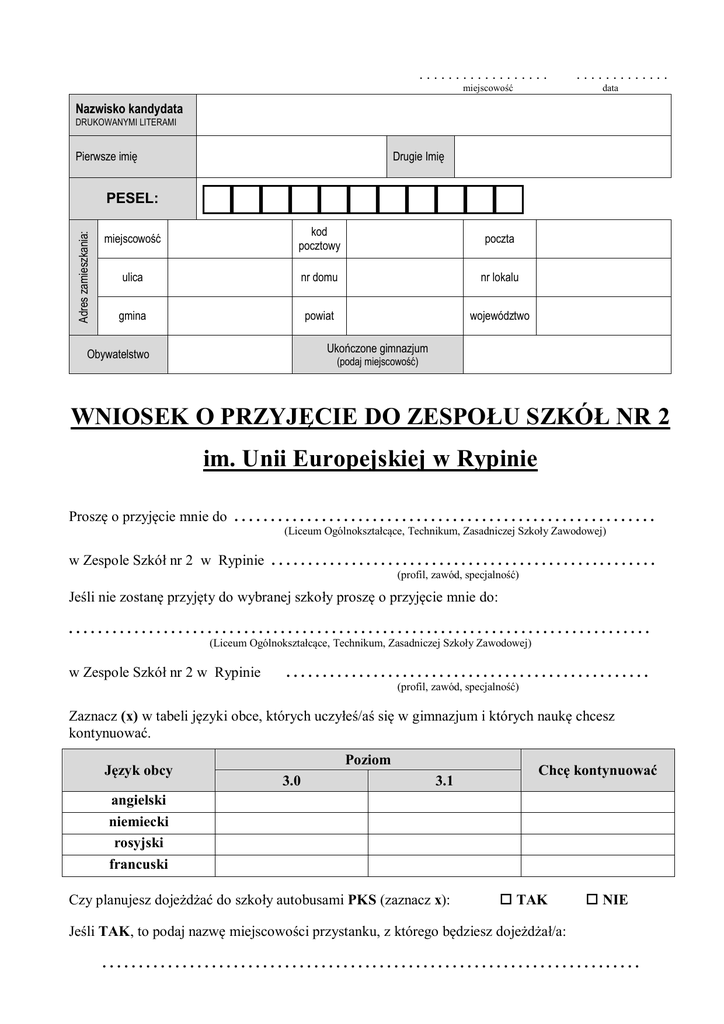 .................. miejscowość ............. data Nazwisko kandydata DRUKOWANYMI LITERAMI Pierwsze imię Adres zamieszkania: PESEL: Drugie Imię miejscowość kod pocztowy poczta ulica nr domu nr lokalu gmina powiat województwo Ukończone gimnazjum Obywatelstwo (podaj miejscowość) WNIOSEK O PRZYJĘCIE DO ZESPOŁU SZKÓŁ NR 2 im. Unii Europejskiej w Rypinie Proszę o przyjęcie mnie do . . . . . . . . . . . . . . . . . . . . . . . . . . . . . . . . . . . . . . . . . . . . . . . . . . . . . . . . . . (Liceum Ogólnokształcące, Technikum, Zasadniczej Szkoły Zawodowej) w Zespole Szkół nr 2 w Rypinie . . . . . . . . . . . . . . . . . . . . . . . . . . . . . . . . . . . . . . . . . . . . . . . . . . . . . (profil, zawód, specjalność) Jeśli nie zostanę przyjęty do wybranej szkoły proszę o przyjęcie mnie do: ................................................................................ (Liceum Ogólnokształcące, Technikum, Zasadniczej Szkoły Zawodowej) w Zespole Szkół nr 2 w Rypinie .................................................. (profil, zawód, specjalność) Zaznacz (x) w tabeli języki obce, których uczyłeś/aś się w gimnazjum i których naukę chcesz kontynuować. Język obcy Poziom 3.0 3.1 Chcę kontynuować angielski niemiecki rosyjski francuski Czy planujesz dojeżdżać do szkoły autobusami PKS (zaznacz x): TAK NIE Jeśli TAK, to podaj nazwę miejscowości przystanku, z którego będziesz dojeżdżał/a: .......................................................................... Dane o uczniu (uczennicy) Data urodzenia . . . . . . . . . . . . . . . . . . . . . . . . . . . . . . . . . . . . . . . . . . . . Miejsce urodzenia . . . . . . . . . . . . . . . . . . . . . . . . . . . . . . . . . . . . . . . . . . Województwo i powiat urodzenia (obecne) . . . . . . . . . . . . . . . . . . . . . . . . . . . . . . . . . . . . . . . . . e-mail: . . . . . . . . . . . . . . . . . . . . . . . . . . . . . . . . . . . . . . . . . . . . . . . . . . . . . . . . . . . . . . . . . . . . . . . Imię i nazwisko matki (prawnego opiekuna) . . . . . . . . . . . . . . . . . . . . . . . . . . . . . . . . . . . . . . . . . . . . Imię i nazwisko ojca (prawnego opiekuna) . . . . . . . . . . . . . . . . . . . . . . . . . . . . . . . . . . . . . . . . . . . . . Nauka w gimnazjum: rok rozpoczęcia . . . . . . . . . . . . . . . . . rok zakończenia . . . . . . . . . . . . . . . . Dane o rodzicach (prawnych opiekunach) (w celu szybkiego kontaktu w nagłych wypadkach) Miejsce pracy ojca . . . . . . . . . . . . . . . . . . . . . . . . . . . . . . . . . . . . . . . . . . . . . . . . . . . . . . . . . . . . . . . . . adres domowy . . . . . . . . . . . . . . . . . . . . . . . . . . . . . . . . . . . . . . . . . . . . . . . . . . . . . . . . . . . . . . . . telefon telefon zakładu pracy . . . . . . . . . . . . . . . e-mail: . . . . . . . . . . . . ............... Miejsce pracy matki . . . . . . . . . . . . . . . . . . . . . . . . . . . . . . . . . . . . . . . . . . . . . . . . . . . . . . . . . . . . . . . . adres domowy . . . . . . . . . . . . . . . . . . . . . . . . . . . . . . . . . . . . . . . . . . . . . . . . . . . . . . . . . . . . . . . . telefon telefon zakładu pracy . . . . . . . . . . . . . . . e-mail: . . . . . . . . . . . . ............... Wymagane dokumenty: Etap I (składane razem z wnioskiem)!! 2 zdjęcia, zaświadczenie lekarza medycyny pracy (dotyczy tylko kandydatów do ZSZ), zaświadczenie o przyjęciu na praktykę (dotyczy kandydatów do ZSZ, oprócz kucharzy i operatora obrabiarek skrawających – praktyka w ZS nr 2) Etap II (składane po zakończeniu roku szkolnego w gimnazjum) oryginał lub potwierdzona kopia świadectwa gimnazjalnego, oryginał lub poświadczona kopia wyników egzaminu gimnazjalnego Wymagane dokumenty należy składać w terminach określonych w Zarządzeniu Kujawsko-Pomorskiego Kuratora Oświaty w sprawie zasad rekrutacji uczniów do szkół publicznych. .............................. podpis rodziców (prawnych opiekunów) ....................... podpis kandydata UWAGA: Zawarte w podaniu informacje o kandydatach, rodzicach lub prawnych opiekunach, będą wykorzystane wyłącznie dla potrzeb szkoły. Wyrażam zgodę na przetwarzanie powyższych danych osobowych dla potrzeb niezbędnych do realizacji procesu rekrutacji, a w przypadku przyjęcia do Zespołu Szkół Nr 2 w Rypinie wyrażam zgodę na przetwarzanie tych danych osobowych do potrzeb pracy szkoły (Systemu Informacji Oświatowej, pracy sekretariatu szkoły, prowadzenia lekcji, wycieczek szkolnych, zajęć dodatkowych, realizacji projektów unijnych, Wirtualnego Dziennika Internetowego dla rodziców/opiekunów, publikowania zdjęć na stronie szkolnej), zgodnie z ustawą z dnia 29.08.1997 r. o ochronie danych osobowych Dz. U. nr 133 poz. 883. ..................................... podpis rodziców (prawnych opiekunów)
