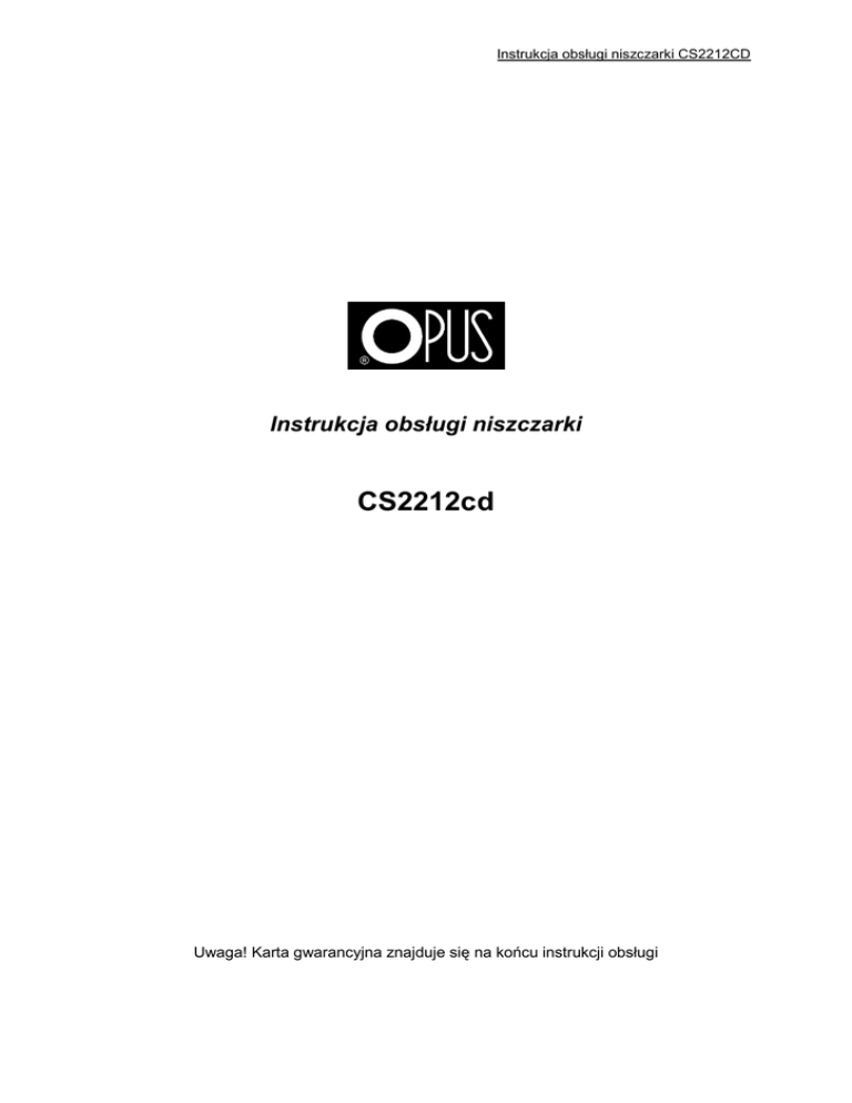 Instrukcja obsługi niszczarki CS2212CD Instrukcja obsługi niszczarki CS2212cd Uwaga! Karta gwarancyjna znajduje się na końcu instrukcji obsługi Instrukcja obsługi niszczarki CS2212CD Zasady bezpieczeństwa • Przed rozpoczęciem pracy z urządzeniem należy zapoznać się z zasadami bezpieczeństwa, zaleceniami producenta i instrukcją obsługi. Instrukcję tę należy zachować i korzystać z niej w przypadku jakichkolwiek wątpliwości dotyczących obsługi urządzenia • Nie wolno używać urządzenia do innych celów niż określone w instrukcji obsługi • Urządzenie należy ustawić na stabilnym podłożu w pobliżu gniazdka o napięciu 220-240V/50-60Hz • Urządzenie należy chronić przed wilgocią i kurzem • Nie wolno ustawiać urządzenia w pobliżu urządzeń grzejnych lub wentylacyjnych • Nie wolno używać urządzenia w pobliżu łatwopalnych gazów lub cieczy • Należy chronić przewód zasilający urządzenie przed uszkodzeniem, nie używać kabla do przenoszenia urządzenia i wyciągania wtyczki z gniazdka • W razie konieczności zdjęcia głowicy z kosza, a także przy jego opróżnianiu lub gdy urządzenie jest przenoszone, należy całkowicie wyłączyć urządzenie z sieci • Urządzenie należy trzymać poza zasięgiem dzieci i zwierząt • UWAGA! Urządzenie zawiera elementy obrotowe, które mogą spowodować wciągnięcie luźnych elementów garderoby, włosów itp • Należy zachować szczególną ostrożność sięgając w obszar szczeliny podawczej • W przypadku przegrzania urządzenia należy natychmiast wyłączyć niszczarkę z prądu. • Nie wolno kłaść ciężkich przedmiotów na niszczarkę! • Należy kontrolować sprawność urządzenia. W przypadku zauważenia jakichkolwiek nieprawidłowości w pracy, należy skontaktować się z serwisem • Urządzenie jest przeznaczone wyłącznie do pracy w pomieszczeniach zamkniętych, w temperaturze powyżej 8°C • Urządzenie należy obsługiwać zawsze zgodnie z ogólnymi zasadami BHP • Wszelkich napraw urządzenia może dokonywać jedynie osoba uprawniona • Po zakończeniu pracy należy wyłączyć urządzenie przełącznikiem głównym ustawiając go w pozycji OFF lub wyłączyć z sieci. Należy również pamiętać, że całkowite wyłączenie urządzenia następuje po wyciągnięciu wtyczki z gniazda sieciowego • Nie wolno używać w pobliżu niszczarki aerozoli, olejów czy smarów na bazie ropy naftowej lub innych palnych substancji • Nie wolno używać sprężonego powietrza w aerozolu do czyszczenia niszczarki Zalecenia producenta • Niszczarka służy do niszczenia papieru, kart kredytowych i płyt CD. Nie wolno używać urządzenia do niszczenia innych materiałów • Wyłącznik niszczarki powinien znajdować się w pozycji „OFF” • W przypadku, gdy urządzenie nie jest używane przez dłuższy czas • Należy pamiętać o opróżnianiu kosza na ścinki • Niszczarka może pracować tylko z koszem będącym w zestawie • W celu zapewnienia długiego okresu użytkowania i niezawodnego funkcjonowania nie należy niszczyć jednorazowo więcej niż 12 kartek papieru (80g/m²). Karty kredytowe i płyty CD/DVD należy niszczyć osobno. Nie wolno niszczyć miękkiej folii PCV, papieru nabłyszczanego, składanki komputerowej ani kartonu – może to doprowadzić do uszkodzenia mechanizmu tnącego • Przed zniszczeniem dokumentu, należy usunąć spinacze archiwizacyjne • Niszczarka jest odporna na zszywki oraz małe spinacze UWAGA! Niestosowanie się do powyższych zaleceń może doprowadzić do utraty gwarancji Instrukcja obsługi niszczarki CS2212CD Budowa urządzenia 1 – Dioda informująca o gotowości do pracy 2 – Dioda informująca o przegrzaniu silnika 3 – Przezroczyste okno 4 – Trójpozycyjny przełącznik Rewers/Auto/Off 5 – Szczelina na płyty CD/DVD 6 – Uchwyt do przenoszenia głowicy 7 – Głowica tnąca niszczarki 8 – Szczelina na papier 9 – Kosz na ścinki Obsługa niszczarki: • Urządzenie należy ustawić na stabilnej i równej powierzchni • Przed podłączeniem do sieci, należy upewnić się, że wyłącznik główny jest w pozycji ”OFF” • Włóż papier do szczeliny podawczej. UWAGA! Papier należy wprowadzać w środek szczeliny, po wprowadzeniu papieru niszczarka automatycznie rozpoczyna pracę. Maksymalna szerokość papieru to 220mm, jeśli kartki, które chcemy zniszczyć są szersze, należy je przyciąć lub złożyć do odpowiedniego rozmiaru. Należy pamiętać, że jednorazowo można niszczyć do 12 kartek papieru 80g/m² • Po 3 minutach ciągłej pracy, silnik urządzenia może ulec przegrzaniu. Zapali się dioda informująca o przegrzaniu, a urządzenie automatycznie zakończy pracę. Odczekaj 60min, aby silnik się schłodził Czyszczenie: Przed przystąpieniem do czyszczenia niszczarki należy upewnić się, że włącznik główny znajduje się w pozycji „OFF”, a wtyczka jest wyciągnięta z gniazda zasilającego Kiedy kosz jest przepełniony, należy wyciągnąć go z urządzenia w celu opróżnienia ze ścinków. Przepełniony kosz może powodować problemy z wprowadzaniem kartek do szczeliny podawczej. Należy regularnie opróżniać kosz na ścinki Instrukcja obsługi niszczarki CS2212CD Czyszczenie obudowy – zabrudzoną obudowę należy przetrzeć miękką ściereczką nasączoną wodą lub delikatnym detergentem. Nie wolno zanurzać urządzenia w wodzie. Nie używać benzenu, alkoholu, rozpuszczalnika do farb czy benzyny – użycie tych środków może spowodować trwałe zniszczenie obudowy Konserwacja Przed przystąpieniem do konserwacji niszczarki należy upewnić się, że włącznik główny znajduje się w pozycji „OFF” Regularne oliwienie noży tnących zapobiega zmniejszeniu wydajności, podwyższeniu głośności oraz znacznie wydłuża sprawność niszczarki Noże tnące powinno się smarować specjalnym olejem (znajdującym się w ofercie OPUS), po kilkukrotnym opróż