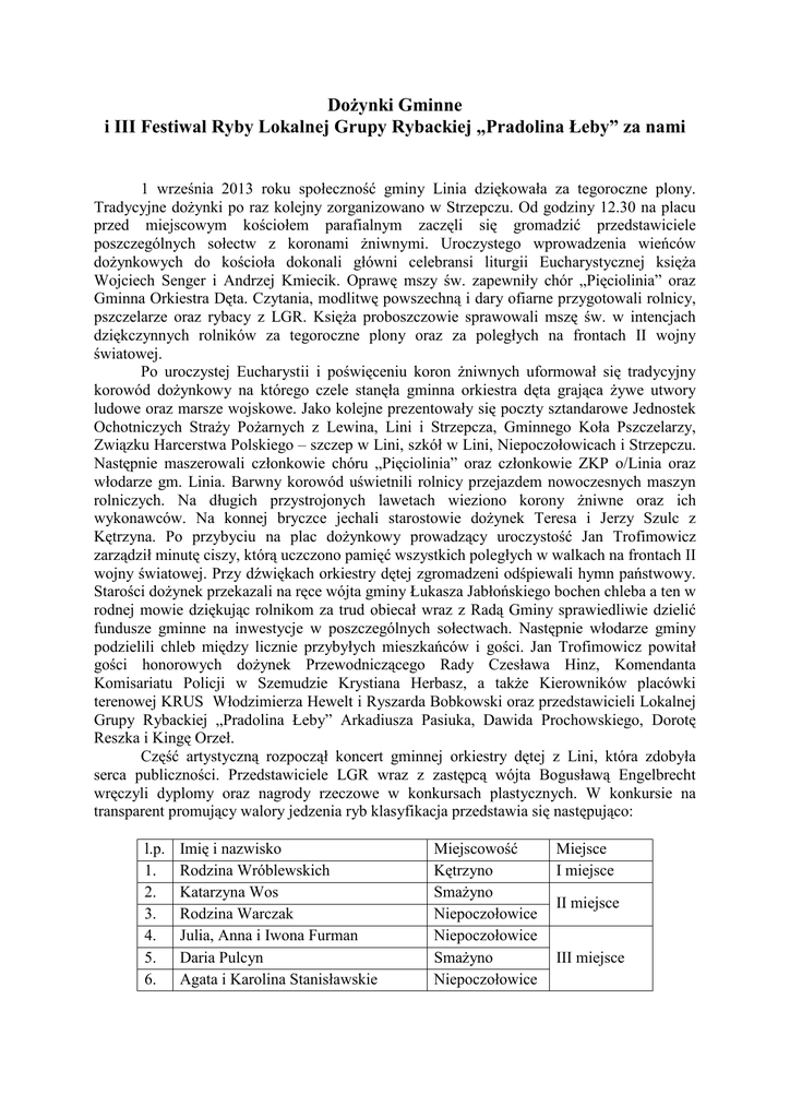 Dożynki Gminne i III Festiwal Ryby Lokalnej Grupy Rybackiej „Pradolina Łeby” za nami 1 września 2013 roku społeczność gminy Linia dziękowała za tegoroczne plony. Tradycyjne dożynki po raz kolejny zorganizowano w Strzepczu. Od godziny 12.30 na placu przed miejscowym kościołem parafialnym zaczęli się gromadzić przedstawiciele poszczególnych sołectw z koronami żniwnymi. Uroczystego wprowadzenia wieńców dożynkowych do kościoła dokonali główni celebransi liturgii Eucharystycznej księża Wojciech Senger i Andrzej Kmiecik. Oprawę mszy św. zapewniły chór „Pięciolinia” oraz Gminna Orkiestra Dęta. Czytania, modlitwę powszechną i dary ofiarne przygotowali rolnicy, pszczelarze oraz rybacy z LGR. Księża proboszczowie sprawowali mszę św. w intencjach dziękczynnych rolników za tegoroczne plony oraz za poległych na frontach II wojny światowej. Po uroczystej Eucharystii i poświęceniu koron żniwnych uformował się tradycyjny korowód dożynkowy na którego czele stanęła gminna orkiestra dęta grająca żywe utwory ludowe oraz marsze wojskowe. Jako kolejne prezentowały się poczty sztandarowe Jednostek Ochotniczych Straży Pożarnych z Lewina, Lini i Strzepcza, Gminnego Koła Pszczelarzy, Związku Harcerstwa Polskiego – szczep w Lini, szkół w Lini, Niepoczołowicach i Strzepczu. Następnie maszerowali członkowie chóru „Pięciolinia” oraz członkowie ZKP o/Linia oraz włodarze gm. Linia. Barwny korowód uświetnili rolnicy przejazdem nowoczesnych maszyn rolniczych. Na długich przystrojonych lawetach wieziono korony żniwne oraz ich wykonawców. Na konnej bryczce jechali starostowie dożynek Teresa i Jerzy Szulc z Kętrzyna. Po przybyciu na plac dożynkowy prowadzący uroczystość Jan Trofimowicz zarządził minutę ciszy, którą uczczono pamięć wszystkich poległych w walkach na frontach II wojny światowej. Przy dźwiękach orkiestry dętej zgromadzeni odśpiewali hymn państwowy. Starości dożynek przekazali na ręce wójta gminy Łukasza Jabłońskiego bochen chleba a ten w rodnej mowie dziękując rolnikom za trud obiecał wraz z Radą Gminy sprawiedliwie dzielić fundusze gminne na inwestycje w poszczególnych sołectwach. Następnie włodarze gminy podzielili chleb między licznie przybyłych mieszkańców i gości. Jan Trofimowicz powitał gości honorowych dożynek Przewodniczącego Rady Czesława Hinz, Komendanta Komisariatu Policji w Szemudzie Krystiana Herbasz, a także Kierowników placówki terenowej KRUS Włodzimierza Hewelt i Ryszarda Bobkowski oraz przedstawicieli Lokalnej Grupy Rybackiej „Pradolina Łeby” Arkadiusza Pasiuka, Dawida Prochowskiego, Dorotę Reszka i Kingę Orzeł. Część artystyczną rozpoczął koncert gminnej orkiestry dętej z Lini, która zdobyła serca publiczności. Przedstawiciele LGR wraz z zastępcą wójta Bogusławą Engelbrecht wręczyli dyplomy oraz nagrody rzeczowe w konkursach plastycznych. W konkursie na transparent promujący walory jedzenia ryb klasyfikacja przedstawia się następująco: l.p. 1. 2. 3. 4. 5. 6. Imię i nazwisko Rodzina Wróblewskich Katarzyna Wos Rodzina Warczak Julia, Anna i Iwona Furman Daria Pulcyn Agata i Karolina Stanisławskie Miejscowość Kętrzyno Smażyno Niepoczołowice Niepoczołowice Smażyno Niepoczołowice Miejsce I miejsce II miejsce III miejsce W konkursie plastycznym „Rzeka Łeba i jeziora w gminie Linia pełne ryb” klasyfikacja przedstawia się następująco: Kat. 6-9 lat l.p. 1. 2. 3. 4. 5. 6. Imię i nazwisko Katarzyna Wróblewska Julia Kleina Weronika Dawidowska Jakub i Konrad Grzenkowicz Jan Warczak Agata Niedzielan Miejscowość Kętrzyno Linia Linia Lewino Niepoczołowice Osiek Miejsce I miejsce Kat. 10 – 13 lat l.p. Imię i nazwisko 1. Łucja Malinowska 2. Weronika Wróblewska 3. Daria Pulcyn 4. Emilia Wróblewska 5. Katarzyna Teclaf Miejscowość Strzepcz Kętrzyno Smażyno Kętrzyno Lewino Miejsce I miejsce Kat. 14 lat i starsi l.p. Imię i nazwisko 1. Sylwia Wos 2. Iwona Czerwionka 3. Natalia Dosz 4. Aleksandra Warczak 5. Daria Florczyk Miejscowość Smażyno Osiek Smażyno Niepoczołowice Osiek Miejsce I miejsce II miejsce III miejsce II miejsce III miejsce II miejsce III miejsce Podsumowano także konkurs estetyzacji wsi „Piękna wieś – 2013”. W tegorocznej edycji komisja złożona z radnych gminy Linia postanowiła wyróżnić: Piotra Maszotę z Kobylasza, Mirosławę i Zbigniewa Sikorę z Pobłocia, Genowefę i Wojciecha Kwidzińskich z Pobłocia, Katarzynę i Ryszarda Sikora z Pobłocia, Agnieszkę i Jacka Szczypior z Tłuczewa, Teresę Szyca z Kętrzyna, Reginę Studzińską z Kętrzyna, Justynę i Jerzego Lidzbarskich z Niepoczołowic, Danutę i Marcina Bigus z Niepoczołowic, Józefa Darznik z Niepoczołowic, Jadwigę i Piotra Klińskich z Lini, Teresę i Andrzeja Garskich z Lini, Danutę i Edmunda Szymikowskich z Lini, Halinę Orlikowską z Lini i Haliny Stasiuk z Strzepcza. Wszyscy wyróżnienie otrzymali dyplomy oraz nagrody niespodzianki, które przydadzą się w pracy ogrodniczej. Specjalną nagrodę niespodziankę dla najładniejszej zagrody rolniczej ufundowała placówka terenowa KRUS w Wejherowie i trafiła ona do Państwa Danuty i Marcina Bigus z Niepoczołowic. W między czasie odbywał się konkurs na najsmaczniejszą potrawę rybną zorganizowany przez LGR oraz degustacja potraw rybnych. Dorota Reszka prowadziła także konkursy wiedzy o LGR dla najmłodszych. Przedstawiciele KRUS zorganizowali ponadto konkurs wiedzy rolniczej z atrakcyjnymi nagrodami. Przed publicznością wystąpiły ZPiT Kaszebsko Rodzezna pod przewodnictwem Pani Marii Zalewskiej. Na scenie podsumowano także tegoroczną akcję sprzątania świata. W sprzątaniu gminy aktywnie łączyły się wszystkie sołectwa. Komisja Ładu i Porządku Rady Gminy Linia pucharami i dyplomami nagrodziła 4 wsie sołeckie: Zakrzewo, Smażyno, Tłuczewo i Niepoczołowice. Około godz. 16.00 rozpoczęły się zmagania sportowo rekreacyjne w dorocznym Tu