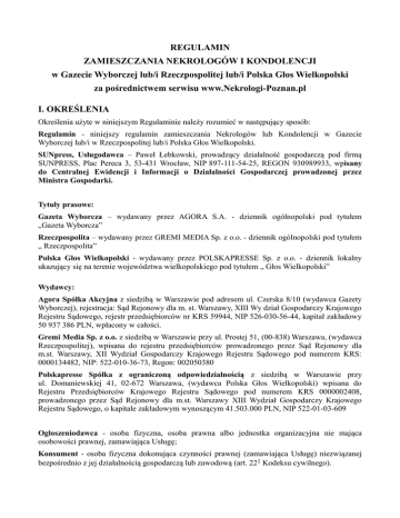 REGULAMIN ZAMIESZCZANIA NEKROLOGÓW I KONDOLENCJI w Gazecie Wyborczej lub/i Rzeczpospolitej lub/i Polska Głos Wielkopolski za pośrednictwem serwisu www.Nekrologi-Poznan.pl I. OKREŚLENIA Określenia użyte w niniejszym Regulaminie należy rozumieć w następujący sposób: Regulamin - niniejszy regulamin zamieszczania Nekrologów lub Kondolencji w Gazecie Wyborczej lub/i w Rzeczpospolitej lub/i Polska Głos Wielkopolski. SUNpress, Usługodawca – Paweł Łebkowski, prowadzący działalność gospodarczą pod firmą SUNPRESS, Plac Pereca 3, 53-431 Wrocław, NIP 897-111-54-25, REGON 930989933, wpisany do Centralnej Ewidencji i Informacji o Działalności Gospodarczej prowadzonej przez Ministra Gospodarki. Tytuły prasowe: Gazeta Wyborcza – wydawany przez AGORA S.A. - dziennik ogólnopolski pod tytułem „Gazeta Wyborcza” Rzeczpospolita – wydawany przez GREMI MEDIA Sp. z o.o. - dziennik ogólnopolski pod tytułem „ Rzeczpospolita” Polska Głos Wielkopolski - wydawany przez POLSKAPRESSE Sp. z o.o. - dziennik lokalny ukazujący się na terenie województwa wielkopolskiego pod tytułem „ Głos Wielkopolski” Wydawcy: Agora Spółka Akcyjna z siedzibą w Warszawie pod adresem ul. Czerska 8/10 (wydawca Gazety Wyborczej), rejestracja: Sąd Rejonowy dla m. st. Warszawy, XIII Wy dział Gospodarczy Krajowego Rejestru Sądowego, rejestr przedsiębiorców nr KRS 59944, NIP 526-030-56-44, kapitał zakładowy 50 937 386 PLN, wpłacony w całości. Gremi Media Sp. z o.o. z siedzibą w Warszawie przy ul. Prostej 51, (00-838) Warszawa, (wydawca Rzeczpospolitej), wpisana do rejestru przedsiębiorców prowadzonego przez Sąd Rejonowy dla m.st. Warszawy, XII Wydział Gospodarczy Krajowego Rejestru Sądowego pod numerem KRS: 0000134482, NIP: 522-010-36-73, Regon: 002050380 Polskapresse Spółka z ograniczoną odpowiedzialnością z siedzibą w Warszawie przy ul. Domaniewskiej 41, 02-672 Warszawa, (wydawca Polska Głos Wielkopolski) wpisana do Rejestru Przedsiębiorców Krajowego Rejestru Sądowego pod numerem KRS 0000002408, prowadzonego przez Sąd Rejonowy dla m.st. Warszawy XIII Wydział Gospodarczy Krajowego Rejestru Sądowego, o kapitale zakładowym wynoszącym 41.503.000 PLN, NIP 522-01-03-609 Ogłoszeniodawca - osoba fizyczna, osoba prawna albo jednostka organizacyjna nie mająca osobowości prawnej, zamawiająca Usługę; Konsument - osoba fizyczna dokonująca czynności prawnej (zamawiająca Usługę) niezwiązanej bezpośrednio z jej działalnością gospodarczą lub zawodową (art. 221 Kodeksu cywilnego). Nekrolog - zamieszczane zgodnie z Regulaminem ogłoszenie związane ze śmiercią osoby lub rocznicą śmierci. Nekrolog w druku jest zamieszczany w postaci tekstu z typowym wyróżnieniem graficznym lub bez wyróżnienia. Rozmiar Nekrologu w druku jest zależny od liczby linii ustalonych przez Wydawcę dziennika Gazeta Wyborcza lub liczby modułów graficznych ustalonych przez Wydawców dzienników: Rzeczpospolita, Polska Głos Wielkopolski. Kondolencje - wyrazy współczucia przekazywane komuś z powodu śmierci bliskiego, podziękowanie za opiekę, pomoc czy leczenie, połączenie zawiadomienia o śmierci z kondolencjami. Rozmiar Kondolencji w druku jest zależny od liczby linii ustalonych przez Wydawcę dziennika Gazeta Wyborcza lub liczby modułów graficznych ustalonych przez Wydawców dzienników: Rzeczpospolita, Polska Głos Wielkopolski. Usługa - kompleksowa usługa reklamowa, polegająca na zamieszczeniu Nekrologu lub Kondolencji w Tytule prasowym. 2 strona redakcyjna – strona lewa, oznaczona nr 2 w danym Tytule prasowym, zawierająca artykuły oraz umożliwiająca zamieszczenie Nekrologu lub Kondolencji, których wielkość określają poszczególni Wydawcy. Strony redakcyjne – pozostałe strony z artykułami, umożliwiająca zamieszczenie Nekrologu lub Kondolencji, których wielkość określają poszczególni Wydawcy. Strony z nekrologami – strony przeznaczone do publikacji Nekrologów lub Kondolencji w Gazecie Wyborczej lub Polska Głos Wielkopolski. Strony ogłoszeniowe - strony przeznaczone do publikacji ogłoszeń drobnych, graficznych oraz Nekrologów lub Kondolencji w Rzeczpospolitej. Wydanie ogólnopolskie – Nekrolog lub Kondolencje ukazujące się w wydaniu papierowym Gazety Wyborczej lub Rzeczpospolitej na terenie całej Polski Wydanie wielkopolskie - Nekrolog lub Kondolencje ukazujące się w wydaniu papierowym Polska Głos Wielkopolski na terenie województwa wielkopolskiego. Wydanie Poznań- Nekrolog lub Kondolencje ukazujące się w wydaniu papierowym Gazety Wyborczej na terenie województwa wielkopolskiego. nekrologi-kondolencje.pl - Serwis Internetowy prowadzony przez SUNpress, publikujący Nekrologi i Kondolencje zamówione do publikacji w Gazecie Wyborczej lub/i Rzeczpospolitej lub/i Dzienniku Gazecie Prawnej lub/i Polska Gazeta Wrocławska poprzez serwis Nekrologi-Wroclaw.pl oraz inne serwisy Usługodawcy. Nekrologi.wyborcza.pl - Serwis Internetowy Wydawcy AGORA S.A. publikujący Nekrologi, Kondolencje, Wspomnienia zamieszczone drukiem w Gazecie Wyborczej. Wspomnijbliskich.pl - Serwis Internetowy Wydawcy POLSKAPRESSE Sp. z o.o.. publikujący Nekrologi, Kondolencje, Wspomnienia zamieszczone drukiem w Polska Głos Wielkopolski. Świadczenie usługi drogą elektroniczną - wykonanie usługi, które następuje przez wysyłanie i odbieranie danych za pomocą systemów teleinformatycznych, na indywidualne żądanie Ogłoszeniodawcy, bez jednoczesnej obecności stron, przy czym dane te są transmitowane za pośrednictwem sieci publicznych w rozumieniu ustawy Prawo telekomunikacyjne. Środki komunikacji elektronicznej - rozwiązania techniczne, w tym urządzenia teleinformatyczne i współpracujące z nimi narzędzia programowe, umożliwiające indywidualne porozumiewanie się na odległość przy wykorzystaniu transmisji danych między systemami teleinformatycznymi, a w szczególności poczta elektroniczna. „Ciasteczka” - pliki tekstowe, w który