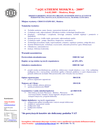 "AQUATHERM MOSKWA - 2009" 3-6.02.2009 – Moskwa, Rosja MIĘDZYNARODOWA WYSTAWA BRANŻY SYSTEMÓW INSTALACYJNYCH OGRZEWNICTWO, WENTYLACJA, KLIMATYZACJA, TECHNIKA SANITARNA Miejsce wystawy: CROCUS EXPO IEC, Moskwa Tematyka wystawy: • • • • • • • • • Technika sanitarna, sauny, baseny, wyposażenie łazienek, akcesoria; Cyrkulacja wody, odprowadzanie i likwidacja ścieków, technologie kanalizacyjne; Instalacje – technologie i urządzenia, rurociągi, armatury, techniki regulacji i pomiarów w budynkach; Systemy grzewcze, źródła ciepła, ogrzewanie, odprowadzanie spalin; Cyrkulacja ciepła – pompy, dmuchawy, kompresory, wentylatory; Technologie przesyłania ciepła, rozprowadzanie, armatury, regulacje i pomiary, usługi dla sieci; Systemy klimatyzacyjne, wentylacja, oczyszczanie, odsysanie powietrza i gazu, klimatyzacja; Chłodnictwo, zamrażalnictwo; Izolacje. Ochrona środowiska. Warunki uczestnictwa: Powierzchnia niezabudowana: 320EUR/ 1m2 Dopłaty za typ stoiska wg taryfy organizatora: od 10%-20% Zabudowa standardowa: 100EUR/ 1m2 § projekt stoiska (architektoniczny, graficzny, elektryczny); ścianki działowe o wys. 2,5m; wykładzina podłogowa; fryz z nazwą firmy; oświetlenie ogólne w biurach, punktowe w części ekspozycyjnej; 1 gniazdo elektryczne na każde 10m2 powierzchni; stół, 4 krzesła, kosz na śmieci; Opłata rejestracyjna: § Wpisowe od 1 firmy: § § 250 EUR koszty reklamy, plansza ofertowa; opieka przedstawiciela PRIHP Uczestnictwo 1 osoby (nieobowiązkowo) § 500 EUR pobiera organizator zagraniczny od 1060 EUR bilet lotniczy na trasie Warszawa - Moskwa - Warszawa; rezerwacja hotelu; transfery; koszty logistyki; ubezpieczenie NW; transport miejscowy; program kulturalny Koordynator: Opłaty dodatkowe: wg taryfy organizatora Anna Iwańska e-mail: [email protected] Polsko-Rosyjska Izba Handlowo-Przemysłowa Ul. Zimna 2, lok. 2 00-138 Warszawa Tel. (022) 654 73 73 654 73 99 Fax (022) 654 73 88 E-mail: [email protected] http://www.prihp.com.pl § § § § § obligatoryjna opłata za podłączenie i zużycie energii elektrycznej dodatkowe wyposażenie stoiska podłączenie wody podłączenie telefonu inne *do powyższych kosztów nie doliczamy podatku VAT Szczegółowe informacje dotyczące wystawy oraz o możliwości uzyskania dofinansowania p. Anna Iwańska – [email protected], tel. +48 22 654- 73- 73. UMOWA - ZAMÓWIENIE Zgłaszamy naszą firmę do udziału w Międzynarodowej Wystawie „AQUATHERM 2009” w Moskwie w dn. 3-6.02.2009 r. Nazwa firmy:....................................................................................................................................................... Adres:................................................................................................................................................................... Tel.: ................................................. Fax :.................................................. e-mail:............................................. NIP :.................................................Regon............................................... Nr KRS .......................................... Osoba odpowiedzialna :….............................................................. Tel. kontaktowy:.......................................... NINIEJSZYM ZAMAWIAMY NA ZASADACH OKREŚLONYCH W WARUNKACH UCZESTNICTWA: 1. Powierzchnię niezabudowaną stoiska : (stoisko w ciągu) ........................... m2 x ...... EUR/m2 (stoisko narożne) ............................ m2 x ...... EUR/m2 2. Obligatoryjne wpisowe (nie podlegające zwrotowi) 500,00 EUR 3. Opłata rejestracyjna (pobiera organizator rosyjski) 250,00 EUR 4. Doprowadzenie energii elektrycznej (wg taryfy organizatora) ......... EUR 2 5. Ryczałt za zużycie energii elektrycznej ........EUR x ............ m =.........EUR 6. Obligatoryjne ubezpieczenie stoiska 3,00 EUR x ............ m2 =…... .EUR WARUNKI UCZESTNICTWA § § § § § § § § Koordynator: W przypadku rezygnacji z udziału w wystawie 70 dni przed jej terminem Wystawca zostanie obciążony 50% kosztów za powierzchnię, a w przypadku rezygnacji 45 dni przed terminem wystawy - Wystawca pokrywa 100% kosztów za powierzchnię. Wystawca 7 dni po podpisaniu Umowy-Zamówienia pokrywa 49% kosztów powierzchni wraz z opłatą rejestracyjną. Pozostałe opłaty wg dokumentów finansowych wystawionych przez organizatora należy uiścić zgodnie ze wskazanym na nich terminem. W przypadku nie dotrzymania terminu organizator rosyjski zastrzega sobie jednostronną zmianę warunków umowy (lokalizacja stoiska, kary). Wszystkie opłaty dokonywane są w PLN według kursu sprzedaży NBP. W przypadku wycofania się z uczestnictwa wpisowe nie podlega zwrotowi. Wszelkie reklamacje powinny być zgłoszone do Organizatora w formie pisemnej w terminie 14 dni od zakończenia wystawy. Nieodłączną częścią Umowy-Zamówienia jest REGULAMIN UCZESTNICTWA W TARGACH. Podpisujący niniejszą Umowę-Zamówienie oświadczają, że są uprawnieni do jej podpisania zgodnie z zasadami reprezentacji wynikającymi z odpowiedniego rejestru lub posiadanego pełnomocnictwa. Podpisujący na poparcie powyższego załączają aktualny KRS, NIP i REGON (kserokopia potwierdzona za zgodność). Zamawiający wyraża zgodę na dokonanie przez Polsko - Rosyjską Izbę Handlowo - Przemysłową korekty wysokości należności w PLN wynikających z wahań kursowych EUR.. Anna Iwańska e-mail: [email protected] Polsko-Rosyjska Izba Handlowo-Przemysłowa Ul. Zimna 2, lok. 2 00-138 Warszawa Tel. (022) 654 73 73 654 73 99 Fax (022) 654 73 88 E-mail: [email protected] http://www.prihp.com.pl ....................................... Pieczęć firmowa ................................................. Podpis Osoby Upoważnionej Do Reprezentacji zgodnie z KRS ........................................................... Miejscowość, data ...................................................... Za PRIHP 