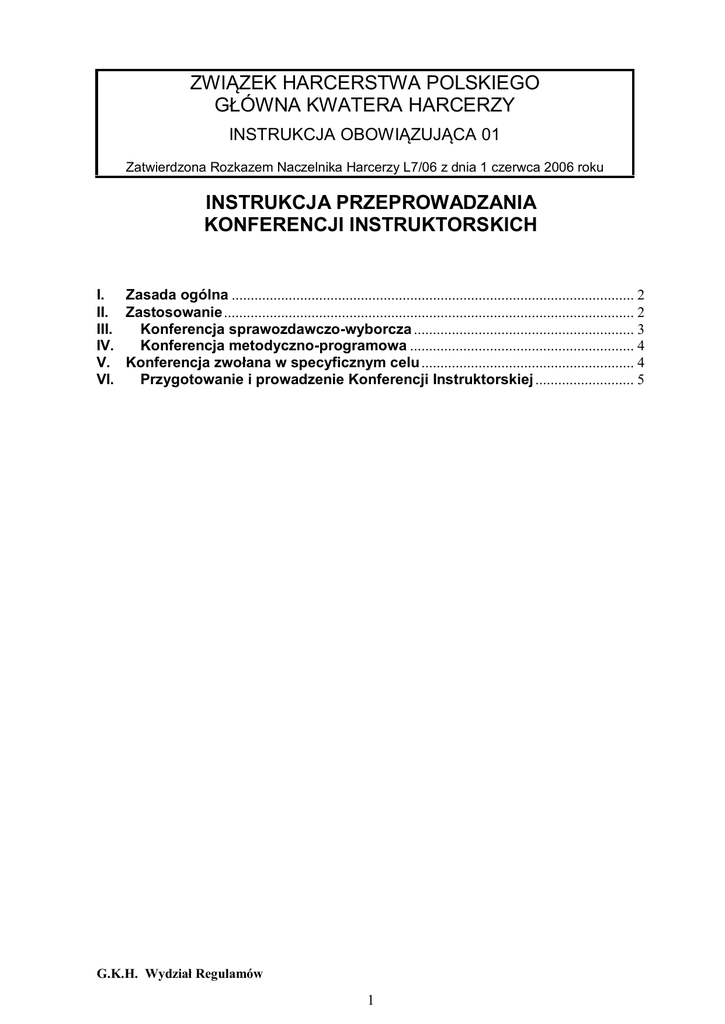 ZWIĄZEK HARCERSTWA POLSKIEGO GŁÓWNA KWATERA HARCERZY INSTRUKCJA OBOWIĄZUJĄCA 01 Zatwierdzona Rozkazem Naczelnika Harcerzy L7/06 z dnia 1 czerwca 2006 roku INSTRUKCJA PRZEPROWADZANIA KONFERENCJI INSTRUKTORSKICH I. Zasada ogólna .......................................................................................................... 2 II. Zastosowanie ............................................................................................................ 2 III. Konferencja sprawozdawczo-wyborcza .......................................................... 3 IV. Konferencja metodyczno-programowa ........................................................... 4 V. Konferencja zwołana w specyficznym celu ........................................................ 4 VI. Przygotowanie i prowadzenie Konferencji Instruktorskiej .......................... 5 G.K.H. Wydział Regulamów 1 I. Zasada ogólna 1. Konferencja instruktorska Chorągwi Harcerzy jest zebraniem wszystkich uprawnionych do udziału członków starszyzny Organizacji Harcerzy, posiadających przydział ewidencyjny do danej Chorągwi. 2. Charakter konferencji instruktorskiej. Konferencja instruktorska Chorągwi powinna odbywać się rocznie. Natomiast Konferencja instruktorska różni się zasadniczo od walnego zebrania, które się odbywają rocznie w organizacjach społecznych. Konferencja instruktorska jest okazją do przekazywania i przedyskutowania zagadnień związanych z prowadzeniem pracy harcerskiej na terenie Chorągwi. Opinie wyrażane przez grono instruktorskie służą jako czynnik doradczy dla Komendanta Chorągwi, który odpowiada za swoją działalność przed Naczelnikiem Harcerzy a nie przed konferencją instruktorską. Konferencja nie udziela absolutorium Komendantowi Chorągwi i jego Komendzie, Konferencja nie uchwala budżetu Chorągwi i nie zatwierdza programu pracy Komendanta Choragwi. Konferencja instruktorska nie wysłuchuje sprawozdań hufcowych, którzy składają swoje sprawozdania na odprawach Komendy Chorągwi. Komisja Rewizyjna Okręgu nie przedstawia konferencji instruktorskiej sprawozdania z przeprowadzonej kontroli gospodarki finansowej Komendy Chorągwi. Uchwały konferencji są wyrazem opini zebranych ale nie muszą być przyjęte przez Komendanta Chorągwi. Wyjątkiem są wnioski do GKH oraz do Naczelnej Rady Harcerskiej i Zjazdu Ogólnego. 3. Odróżnia się trzy rodzaje konferencji instruktorskich: a. Konferencja sprawozdawczo-wyborcza, b. Konferencja metodyczno-programowa, c. Konferencja zwołana w specyficznym celu. Niewyklucza się konferencji instruktorskich, w których połączone są powyższe rodzaje. II. Zastosowanie 4. Konferencję instruktorską zwołuje Komendant Chorągwi: a. Z własnej incjatywy przynajmniej raz do roku b. Na polecenie Naczelnika Harcerzy c. Na wniosek przynajmniej 1/3 uprawnionych do udziału. 5. W wyjątkowych wypadkach konferencja instruktorska może być zwołana przez Naczelnika Harcerzy. 6. Komendant Chorągwi zwołujący konferencję instruktorską melduje o tym Naczelnikowi Harcerzy conajmniej 2 miesiące przed datą konferencji z wnioskem o zatwierdzenie programu konferencji. Naczelnik może dokonać zmian w programie konferencji. 7. Komendant Chorągwi informuje wszystkich uprawnionych do udziału w konferencji o terminie, miejscu oraz proponowanym programie konferencji conajmniej jeden miesiąc przed datą konferencją. 8. W konferencji instruktorskiej biorą udział czynni, zgodnie z Regulaminem Satarszyzny: a. Harcmistrze, podharcmistrze, przewodnicy, działacze harcerscy w Organizacji Harcerzy oraz instruktorki zuchowe. b. P.O. hufcowi, nawet jeżeli nie należą do żadnej z powyższych grup. G.K.H. Wydział Regulamów 2 9. Udział w konferencji instruktorskiej jest obowiązkowy. W wypadku niemożliwości wzięcia udziału obowiązuje przysłanie usprawiedliwienia na piśmie, które powinno dotrzeć do Komendanta Chorągwi przed rozpoczęciem konferencji. 10. Konferencja instruktorska odbywa się bez względu na ilość obecnych. 11. Konferencji instruktorskiej sprawozdawczo-wyborczej przewodniczy uczestnik konferencji wybrany zwykłą większością głosów. Innym konferencjom przewodniczy Komendant Chorągwi lub instruktor wyznaczony przez Komendanta Chorągwi. 12. Przewodniczący przeprowadza konferencję według programu zatwierdzonego przez Naczelnika Harcerzy. Przewodniczący prosi jednego lub dwóch uczestników konferencji na funkcję sekretarza/y konferencji. 13. Komisja skrutacyjną. Na konferencjach, gdzie odbywają się wybory lub uchwalane będą wnioski, przewodniczący przeprowadza wybór komisji składającej się z kilku osób z pośród obecnych na konferencji, której zadaniem jest liczenie głosów. 14. Prawo głosowania oraz udział w wyborach kandydatów na Komendanta Chorągwi mają wszyscy uczestnicy konferencji, którzy posiadają czynne prawo wyborcze, zgodnie z Regulaminem Starszyzny Organizacji Harcerzy. 15. Instruktor mieszkający ponad 500 km od miejsca konferencji (kilometraż według jazdy samochodem), posiadający czynne prawo wyborcze ma prawo przekazania swego głosu instruktorowi jego wyboru obecnego na konferencji, który ma czynne prawo wyborcze. Instruktor otrzymujący głos może mieć przekazane maksimum dwa głosy. 16. Uchwały zapadają większością głosów, przy czym liczą się jedynie głosy obecnych na konferencji oraz głosy przekazane (proxy) w Chorągwiach gdzie takie głosy są uwzględnione. 17. Po zakończeniu każdej konferencji, Komendant Chorągwi który ją zwołał jest zobowiązany przedstawić Naczelnikowi Harcerzy protokól konferencji, najpóźniej w ciągu jednego miesiąca od daty odbycia konferencji. III. Konferencja sprawozdawczo-wyborcza 18. Wybory kandydatów na Komendanta Chorągwi odbywają się w zasadzie co dwa lata. 19. Konferencja sprawozdawczo-wyborcza ma na celu: a. Wysłuchanie i przedyskutowanie sprawozdania Komendanta Chorągwi b. Przeprowadzenie wyborów kandydat